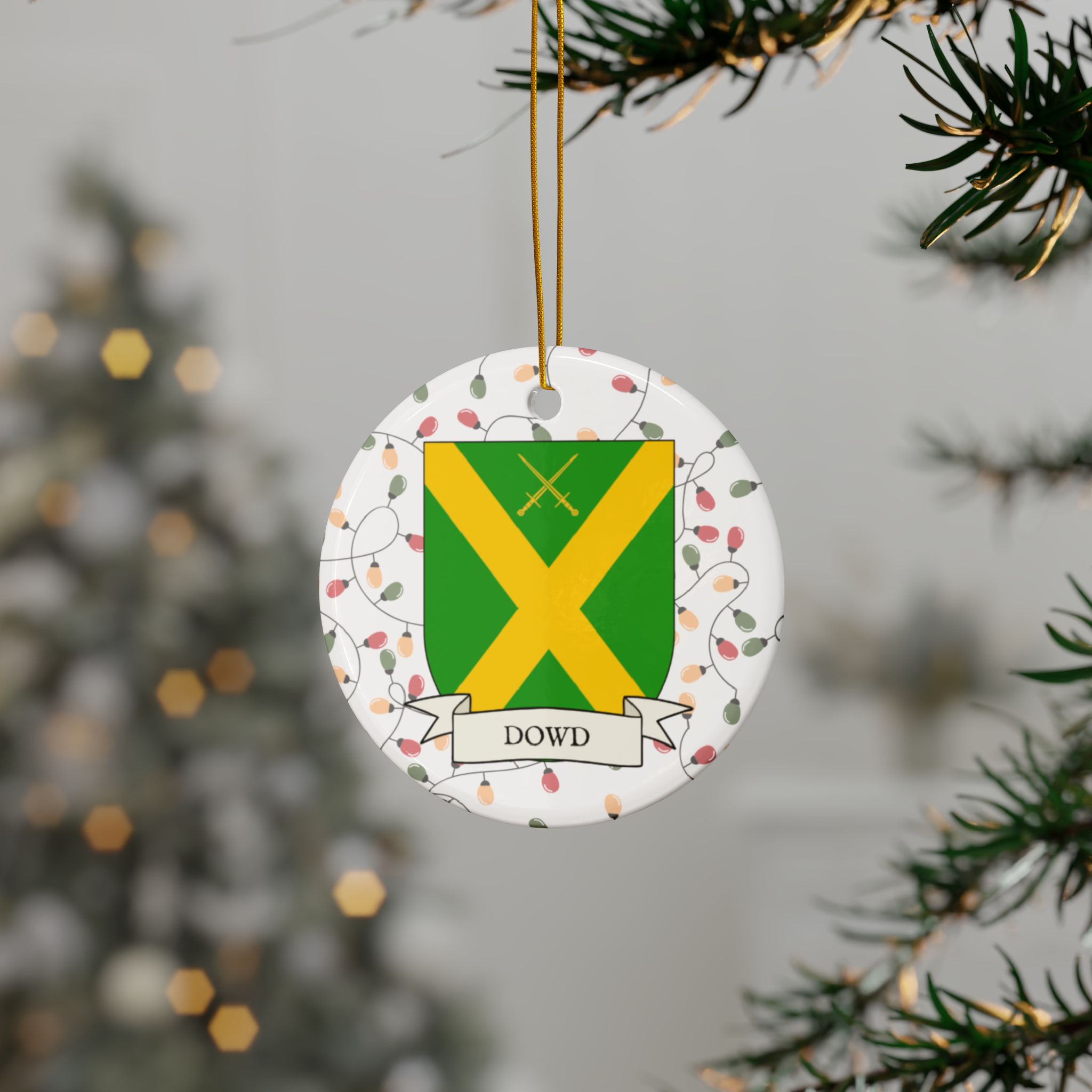 Celebrate the Holidays (and your Irish Heritage) with Irish Family Coat of Arms Christmas Tree Ornaments! Your family’s coat of arms printed on a 100% ceramic ornament with a festive Christmas Tree lights background. Great gift idea for the Irish Americans in your life. It’s sure to become a Christmas tradition!