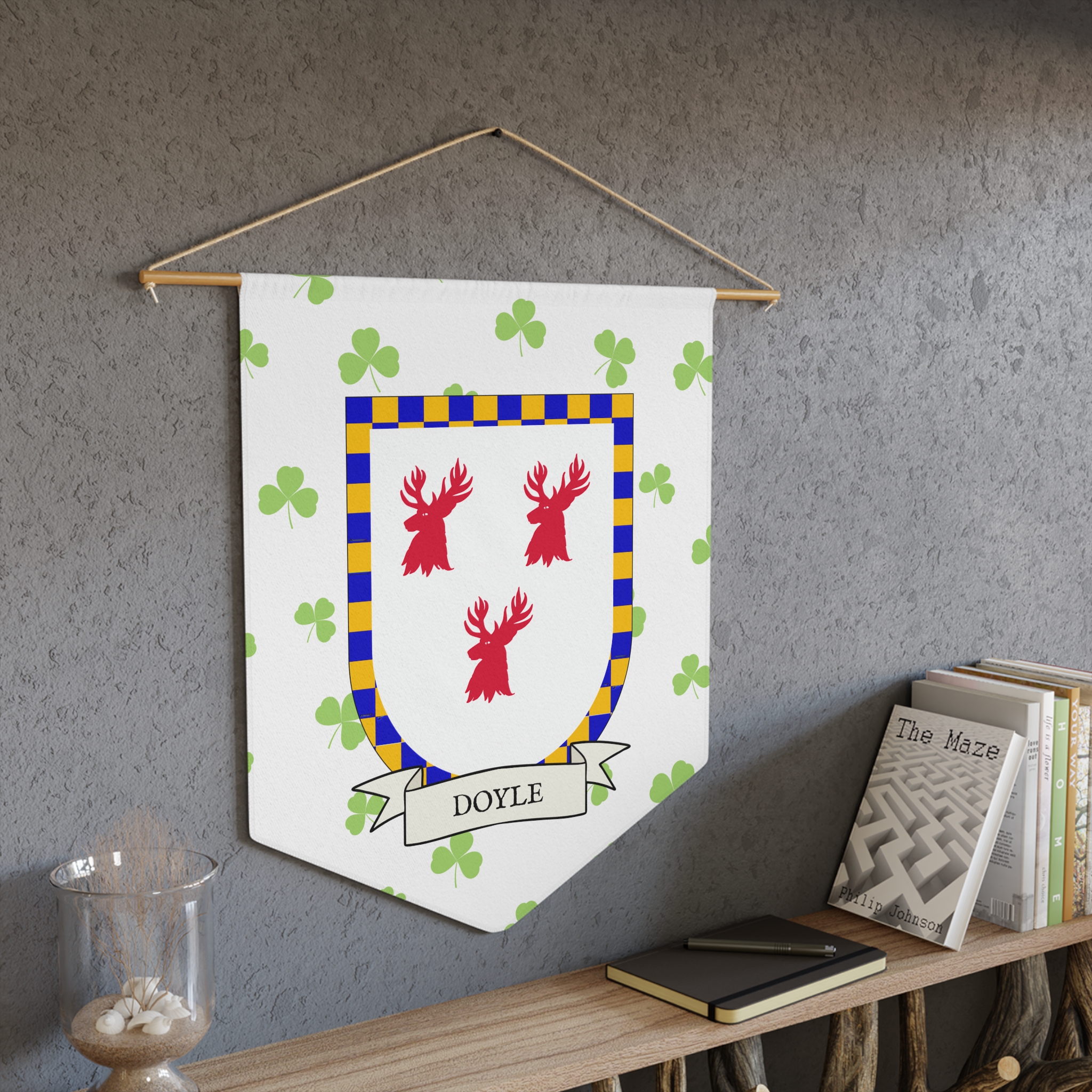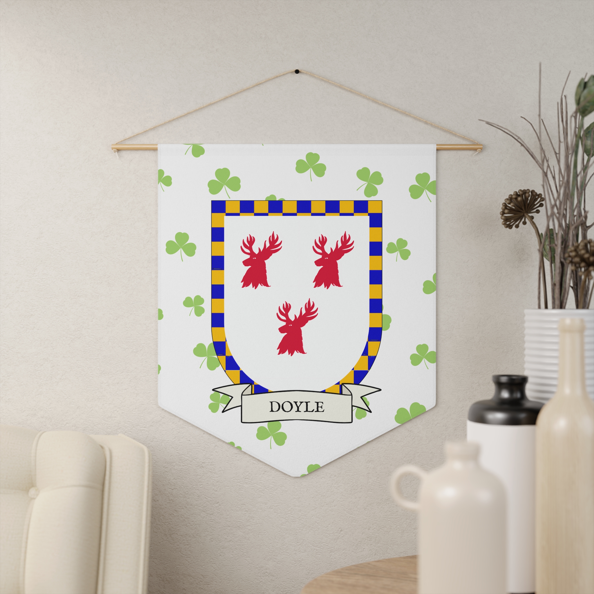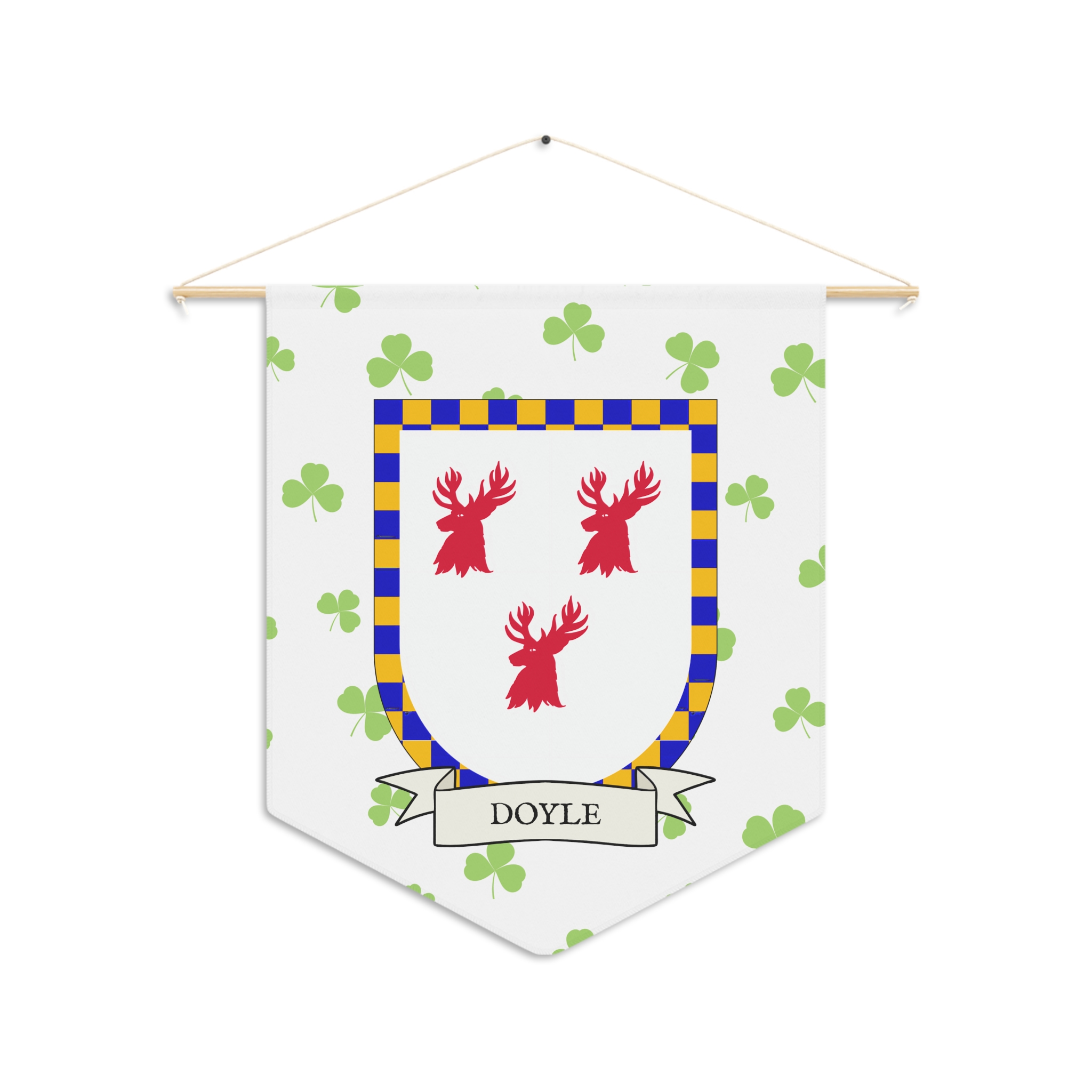 Uplift any room and show off your Irish American roots with this Doyle Family Coat of Arms Indoor Pennant. Pennant is printed on durable poly twill and comes with a wooden dowel/twine frame for easy hanging. Features your family’s Coat of Arms printed over a restrained shamrock patterned background.