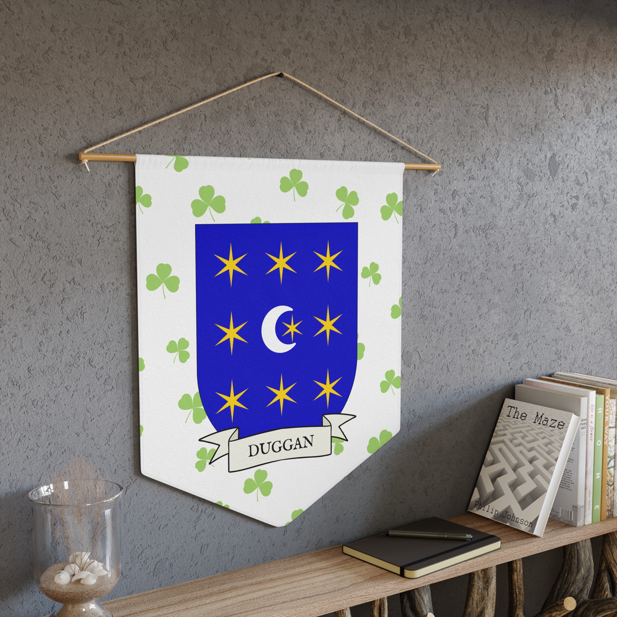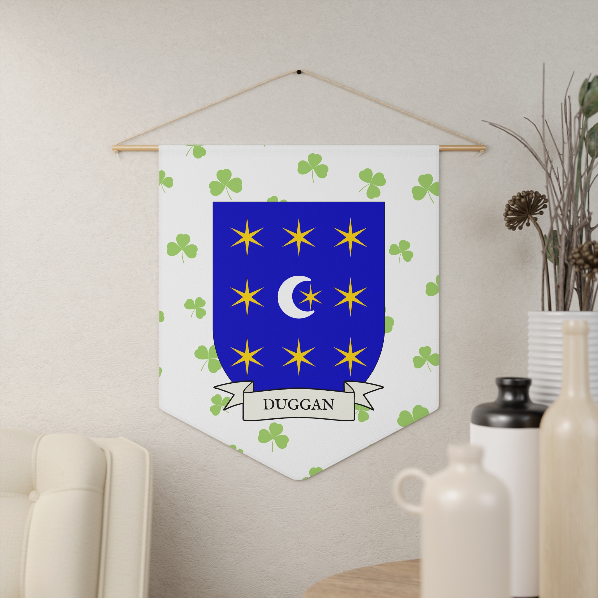 Uplift any room and show off your Irish American roots with this Duggan Family Coat of Arms Indoor Pennant. Pennant is printed on durable poly twill and comes with a wooden dowel/twine frame for easy hanging. Features your family’s Coat of Arms printed over a restrained shamrock patterned background.