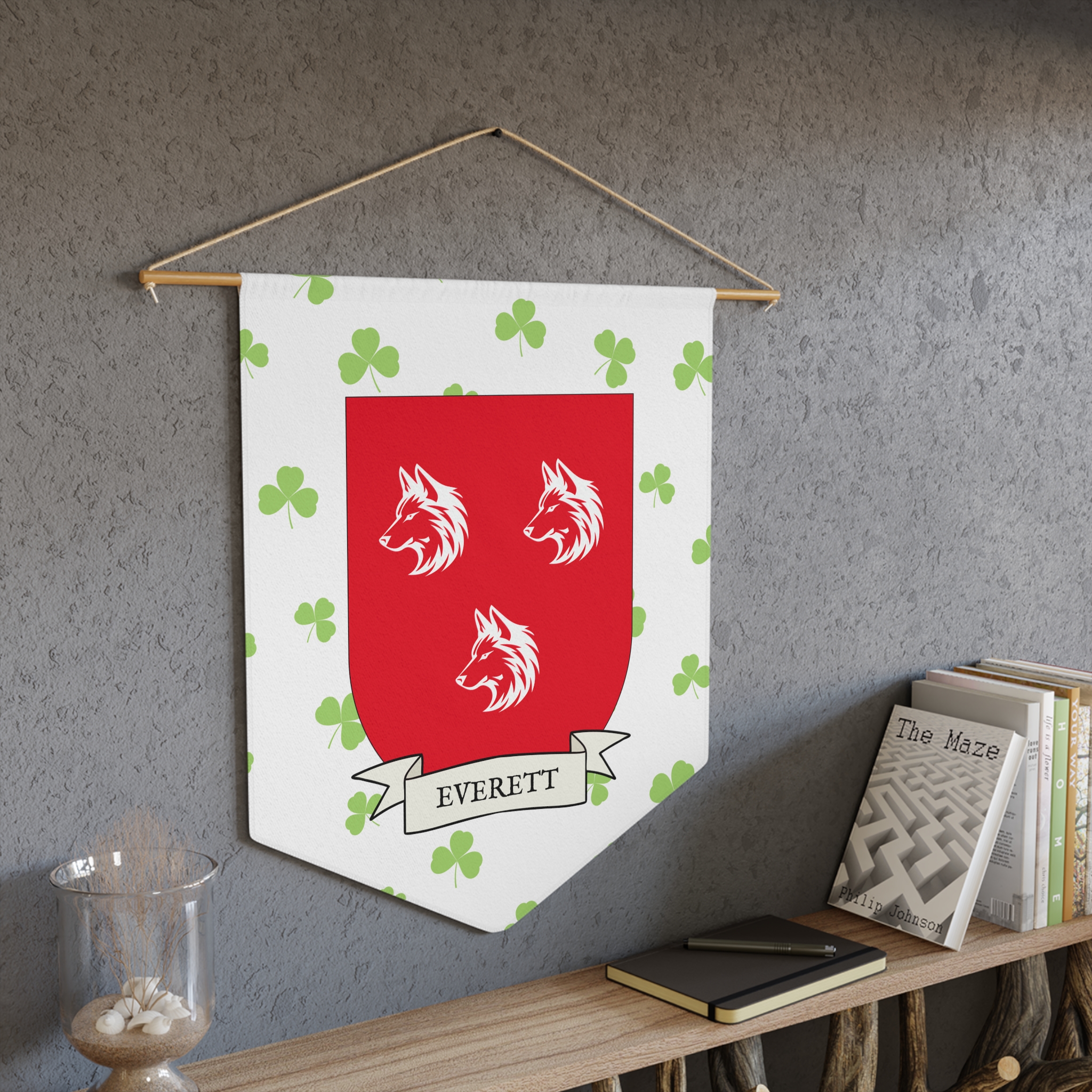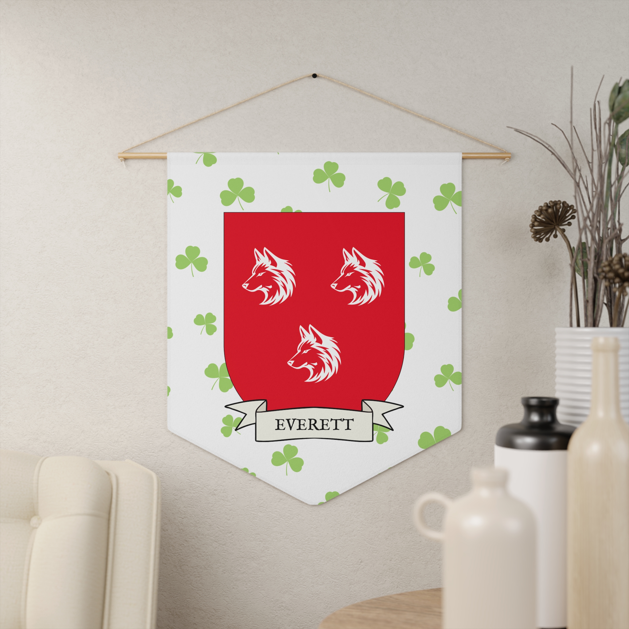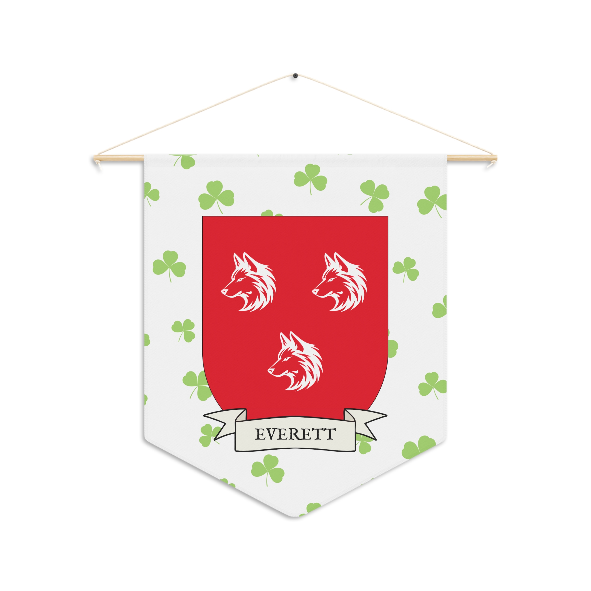 Uplift any room and show off your Irish American roots with this Everett Family Coat of Arms Indoor Pennant. Pennant is printed on durable poly twill and comes with a wooden dowel/twine frame for easy hanging. Features your family’s Coat of Arms printed over a restrained shamrock patterned background.