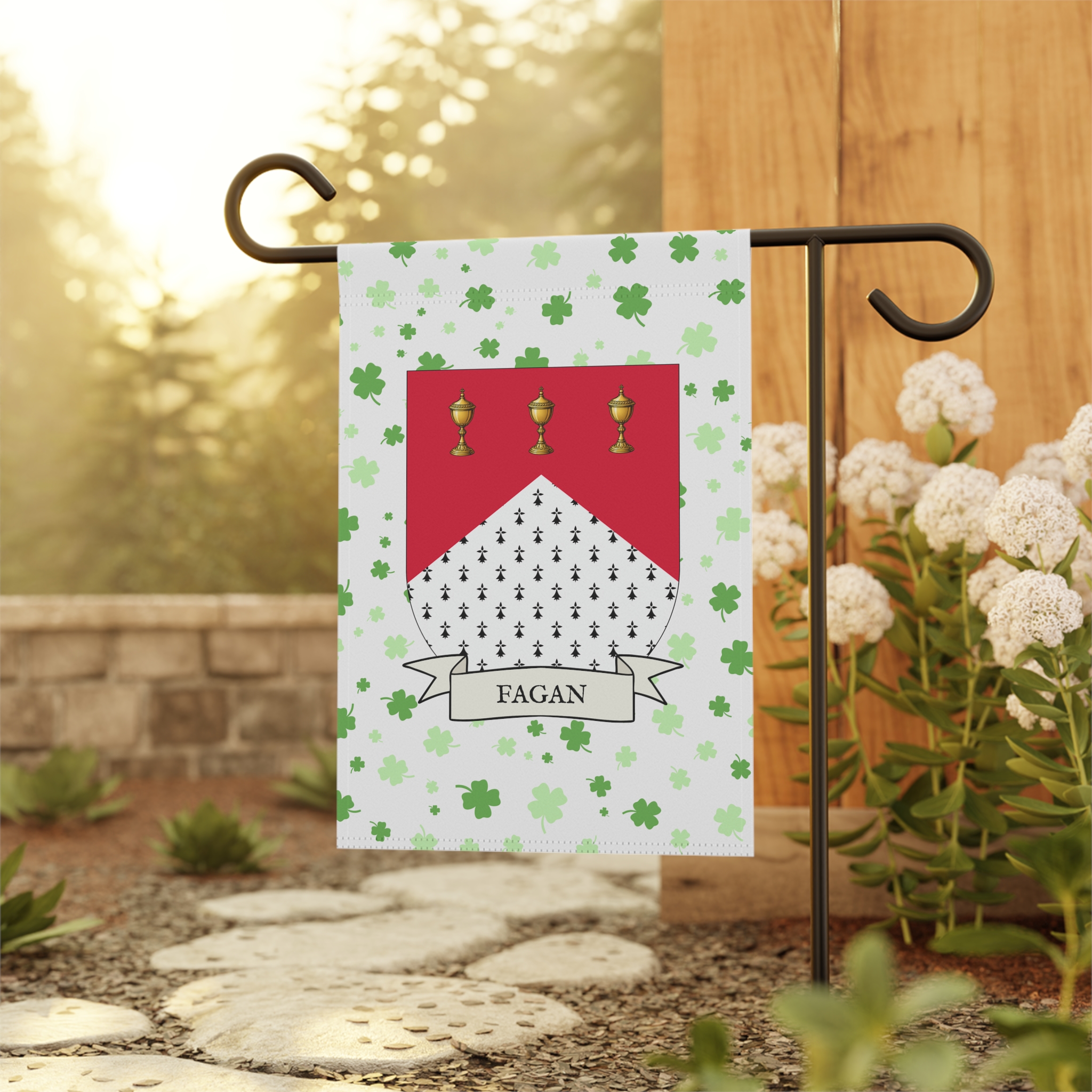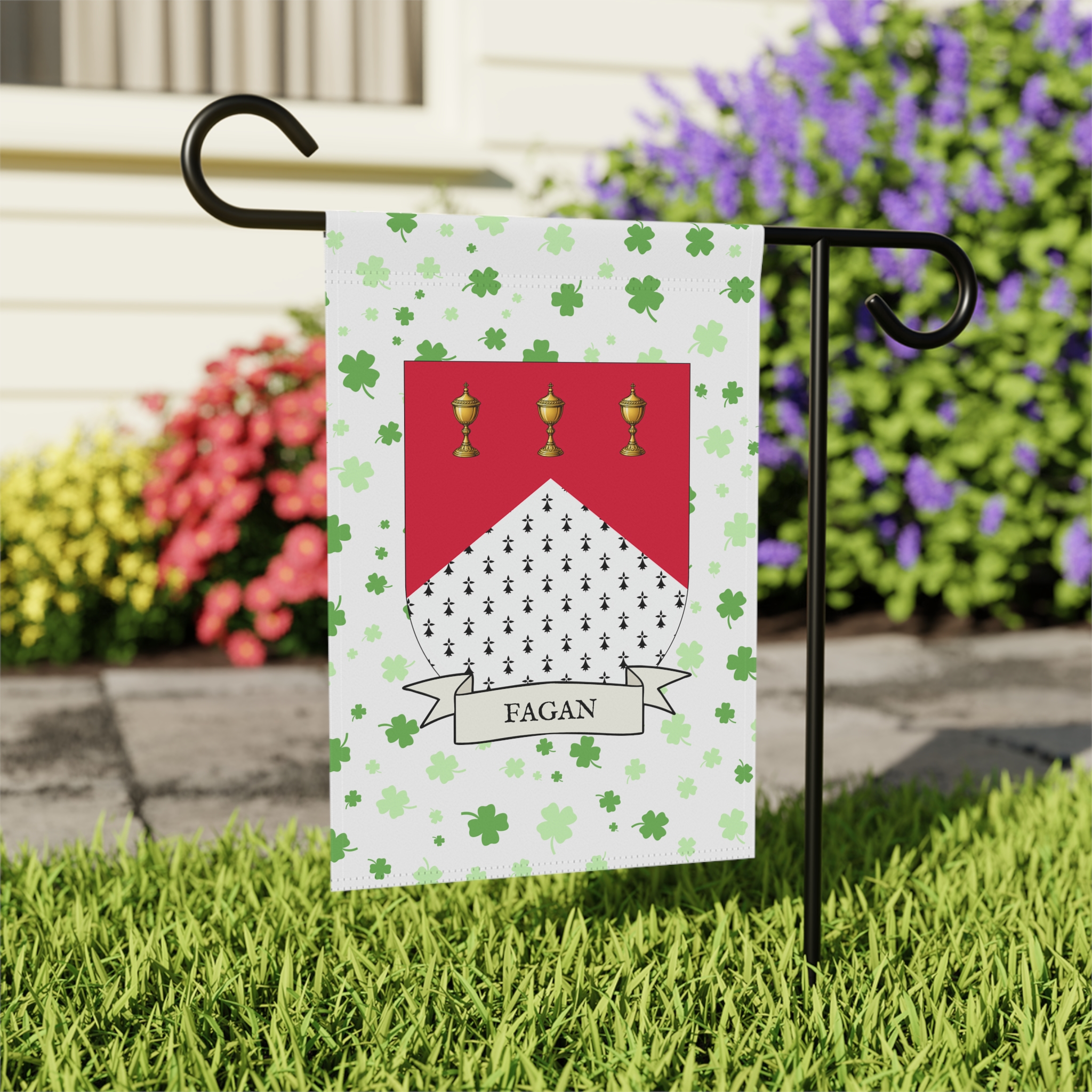 This welcoming Garden Banner will be a great addition to your garden or yard. It displays the Fagan Family Coat of Arms over a subtle background showing a field of four-leaf shamrocks. Both sides show identical images.