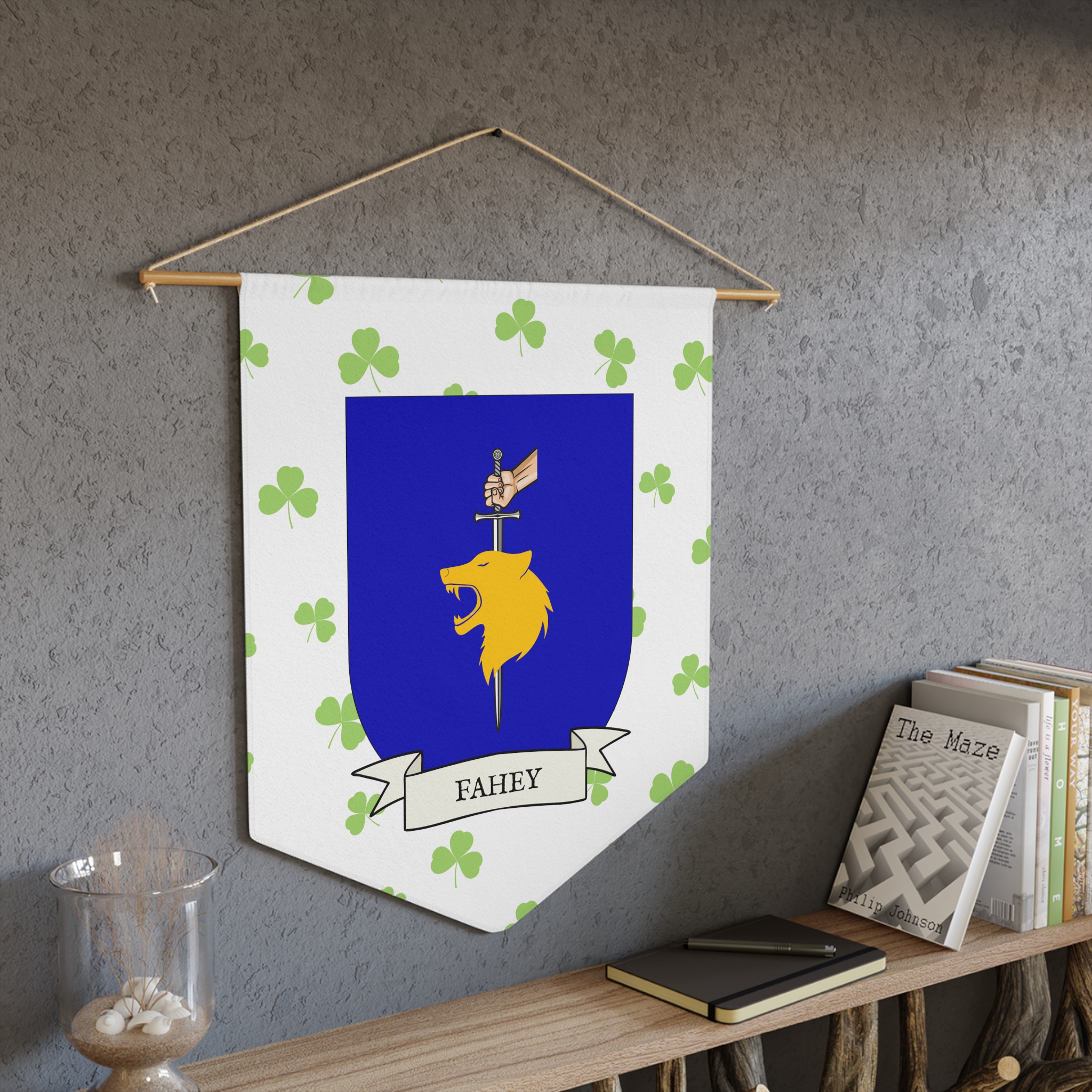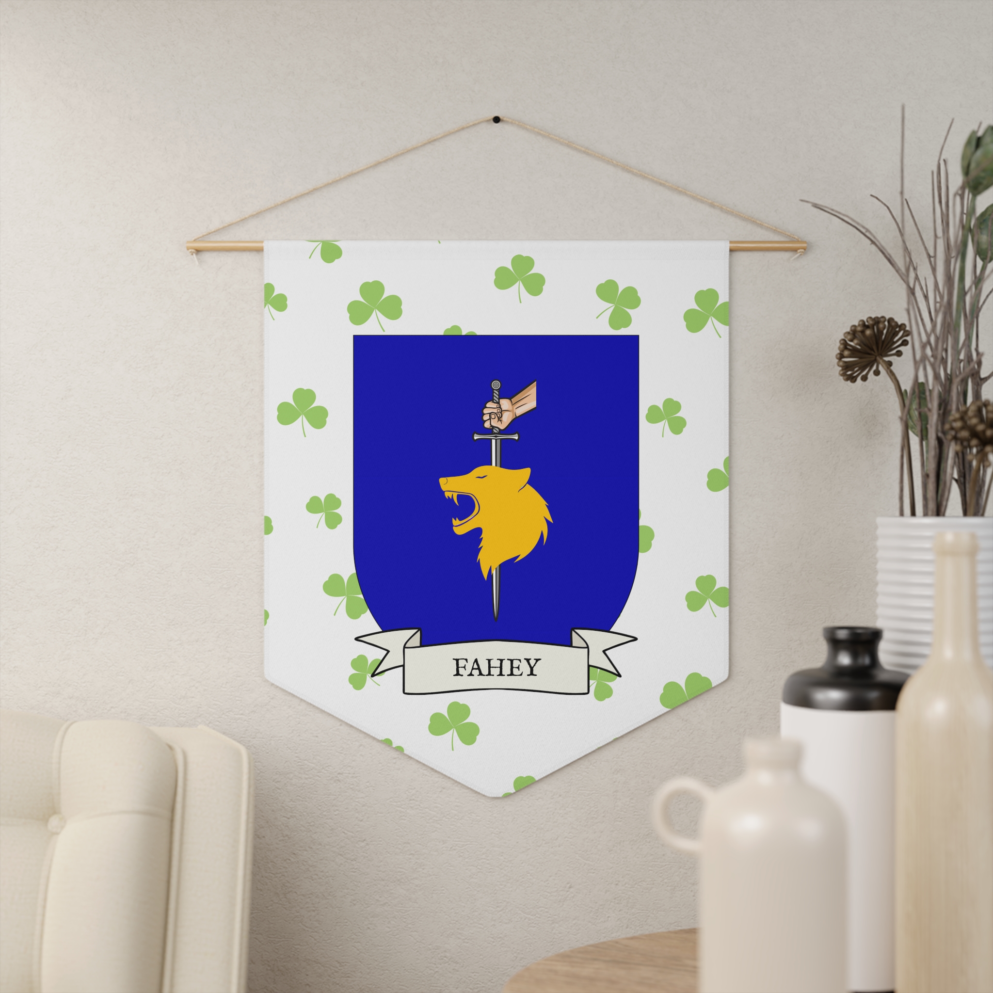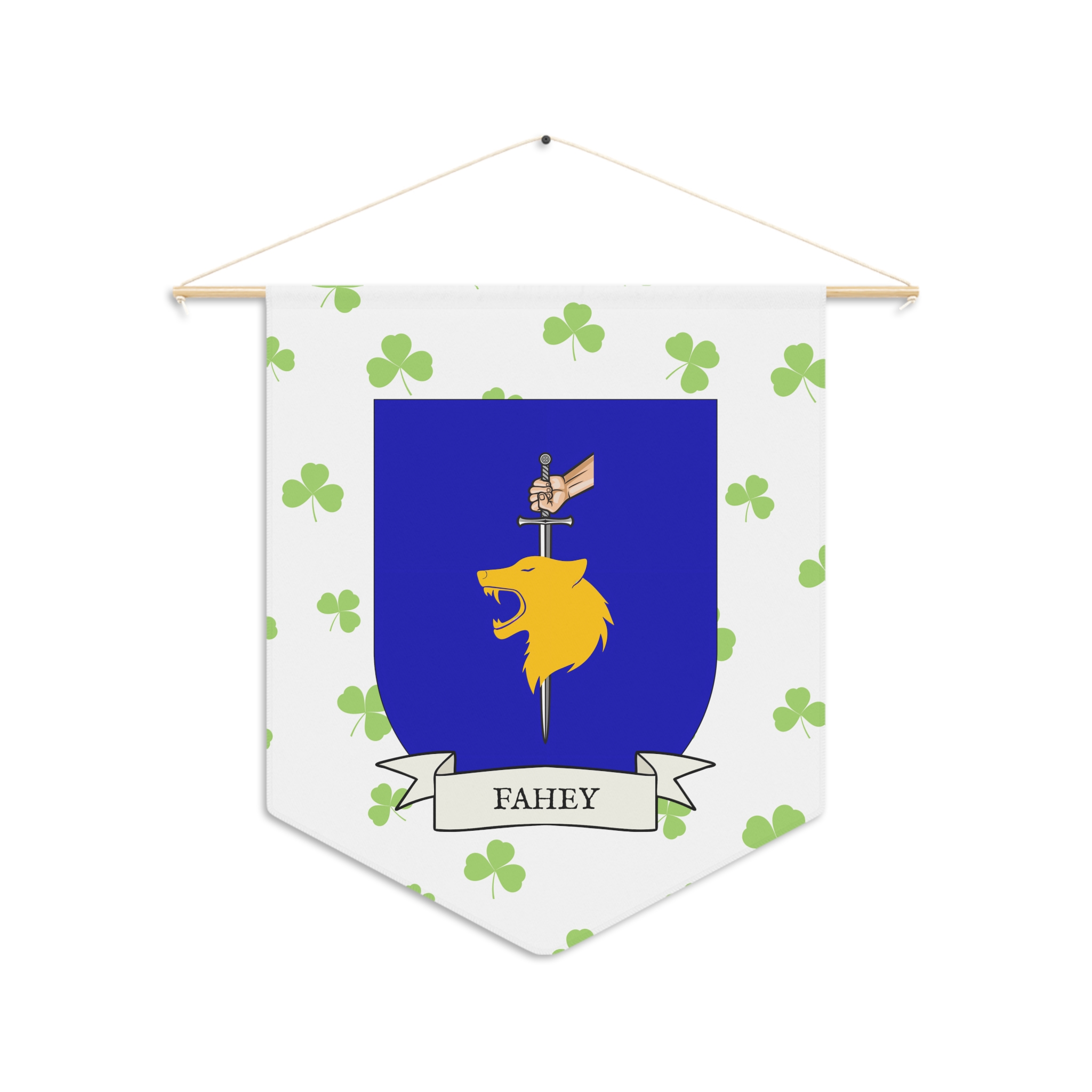 Uplift any room and show off your Irish American roots with this Fahey Family Coat of Arms Indoor Pennant. Pennant is printed on durable poly twill and comes with a wooden dowel/twine frame for easy hanging. Features your family’s Coat of Arms printed over a restrained shamrock patterned background.