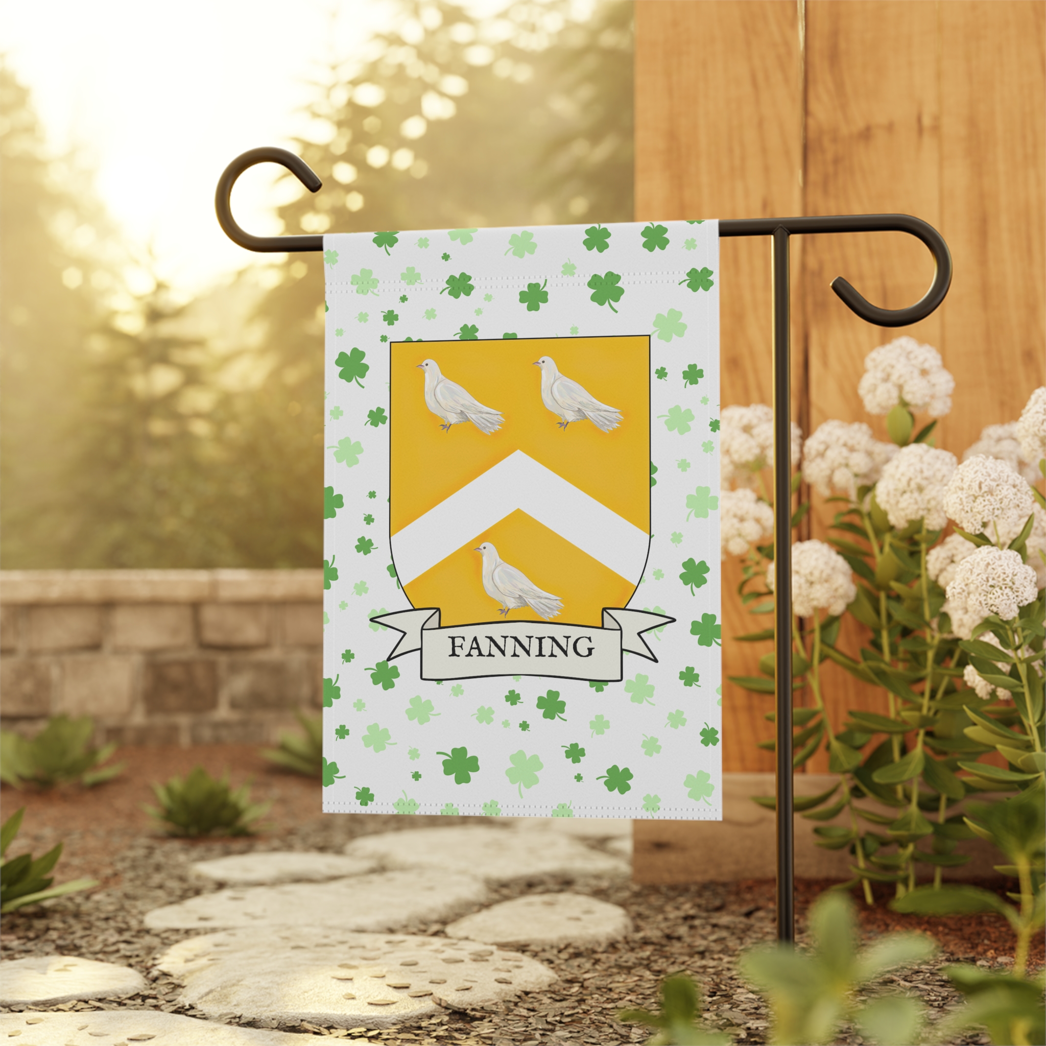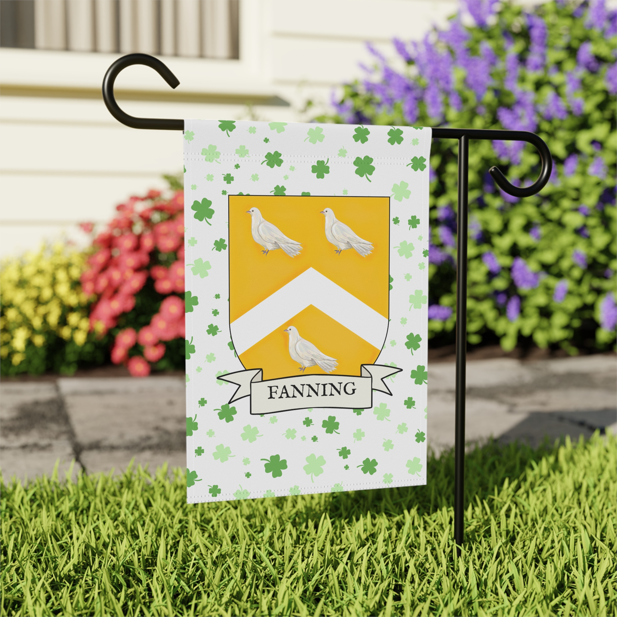 This welcoming Garden Banner will be a great addition to your garden or yard. It displays the Fanning Family Coat of Arms over a subtle background showing a field of four-leaf shamrocks. Both sides show identical images.