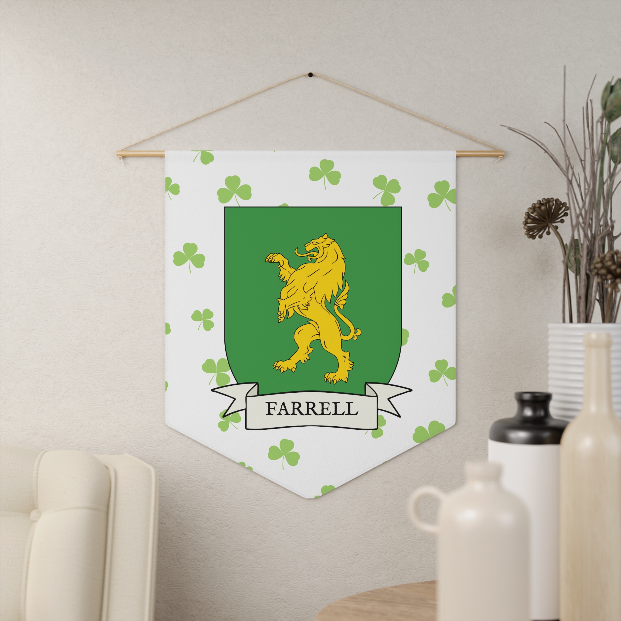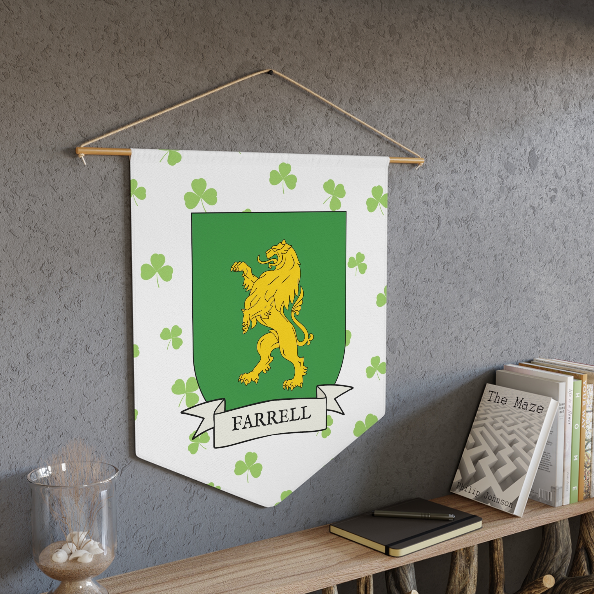 Uplift any room and show off your Irish American roots with this Farrell Family Coat of Arms Indoor Pennant. Pennant is printed on durable poly twill and comes with a wooden dowel/twine frame for easy hanging. Features your family’s Coat of Arms printed over a restrained shamrock patterned background.