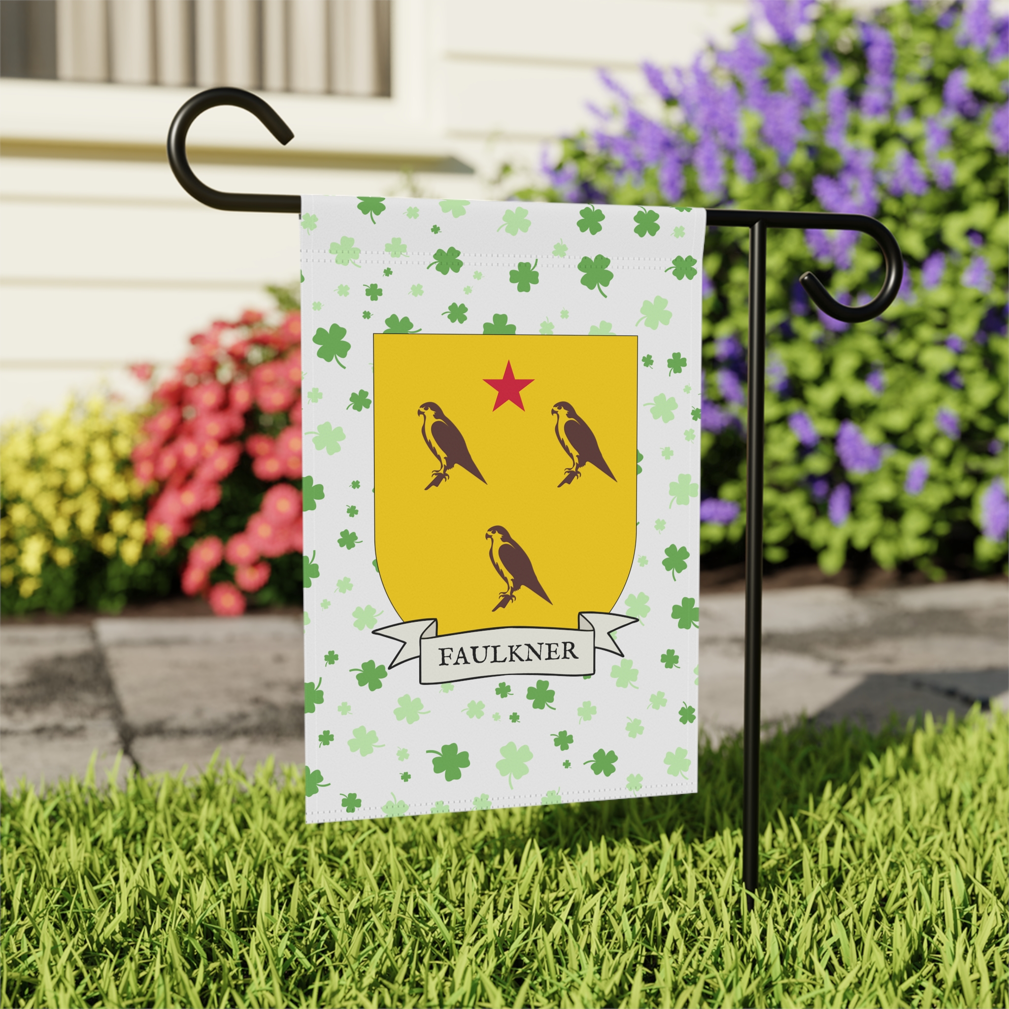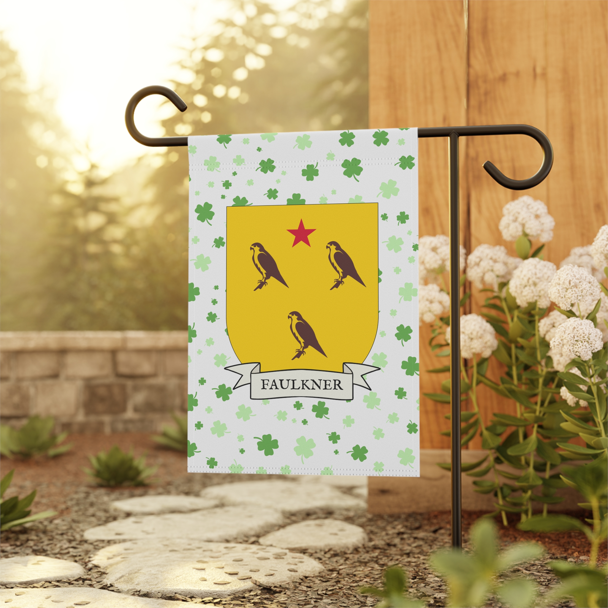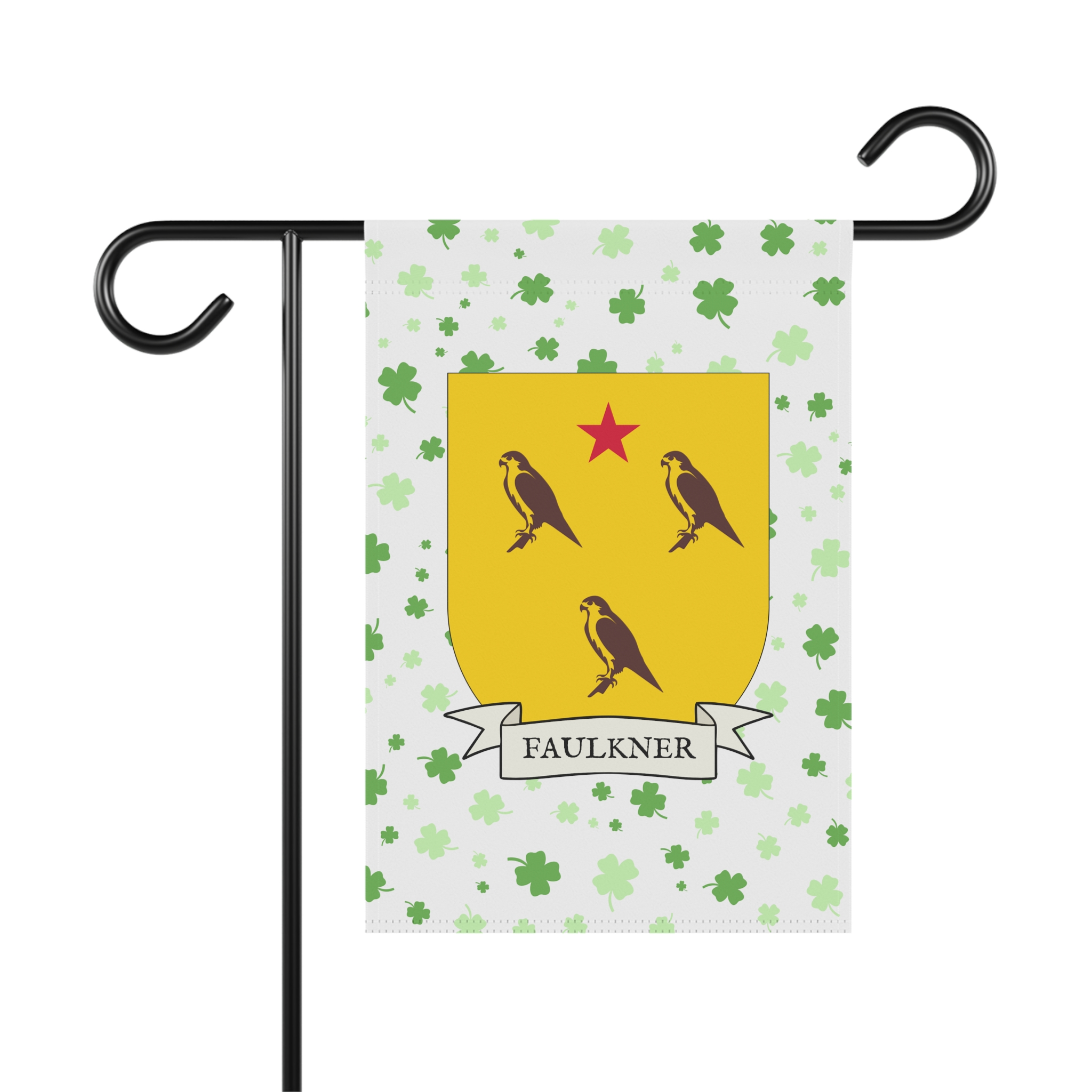 This welcoming Garden Banner will be a great addition to your garden or yard. It displays the Faulkner Family Coat of Arms over a subtle background showing a field of four-leaf shamrocks. Both sides show identical images.