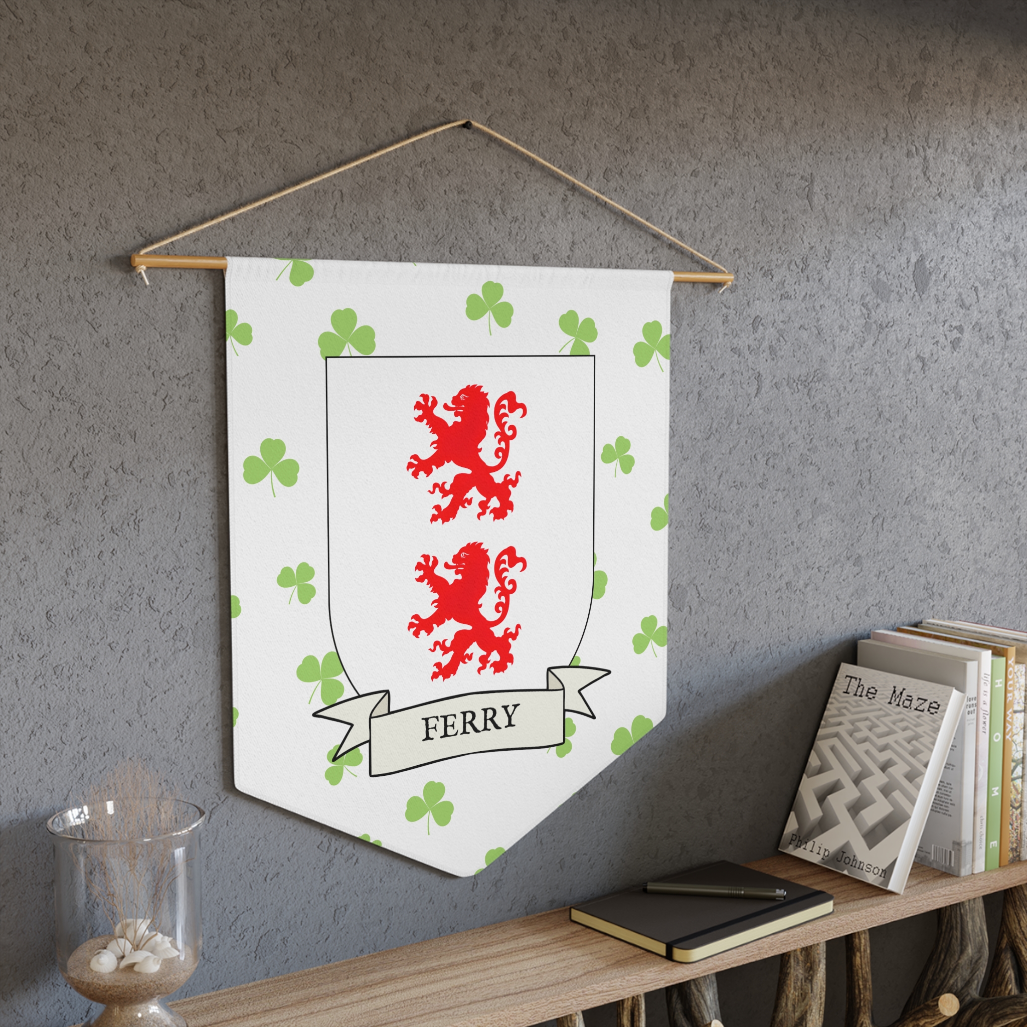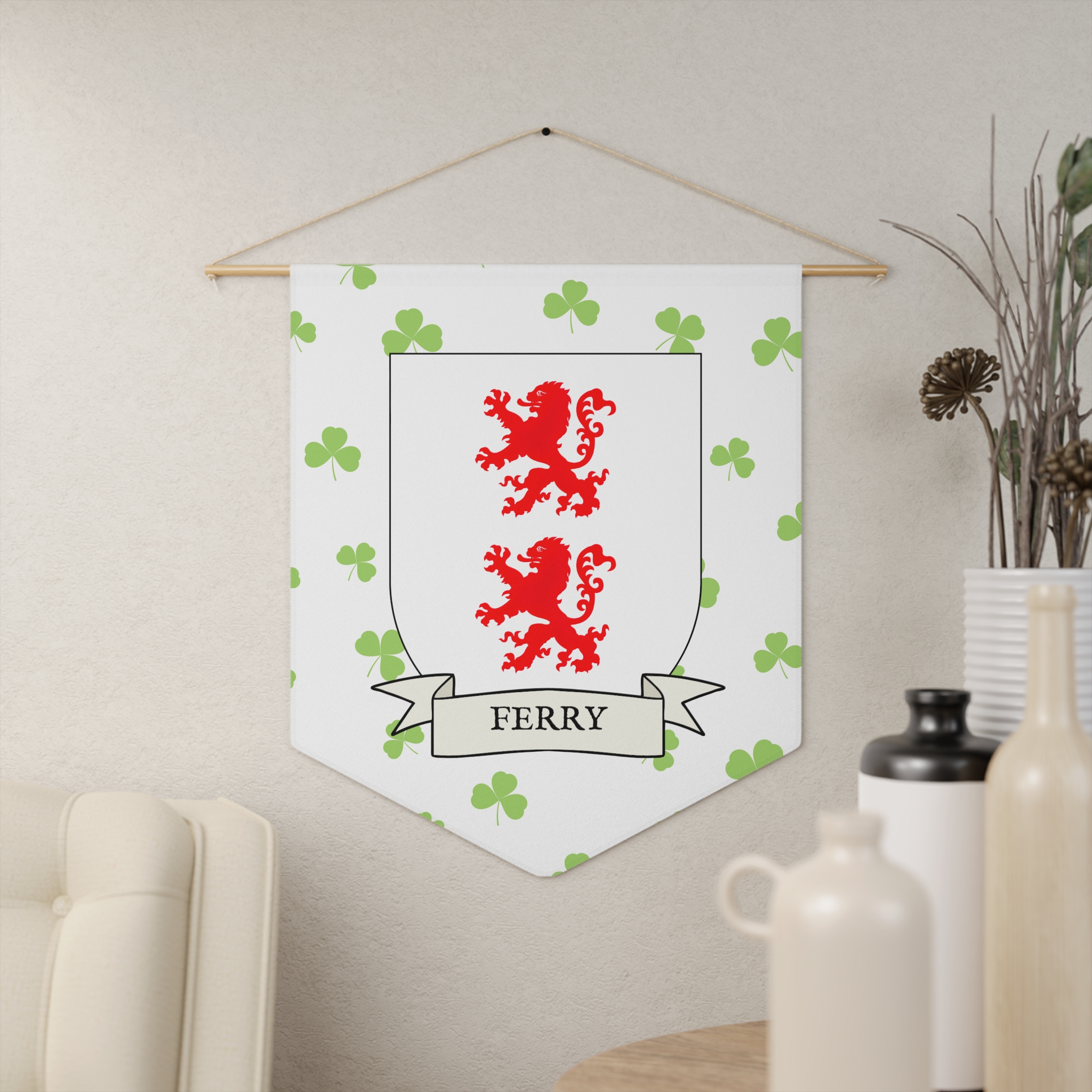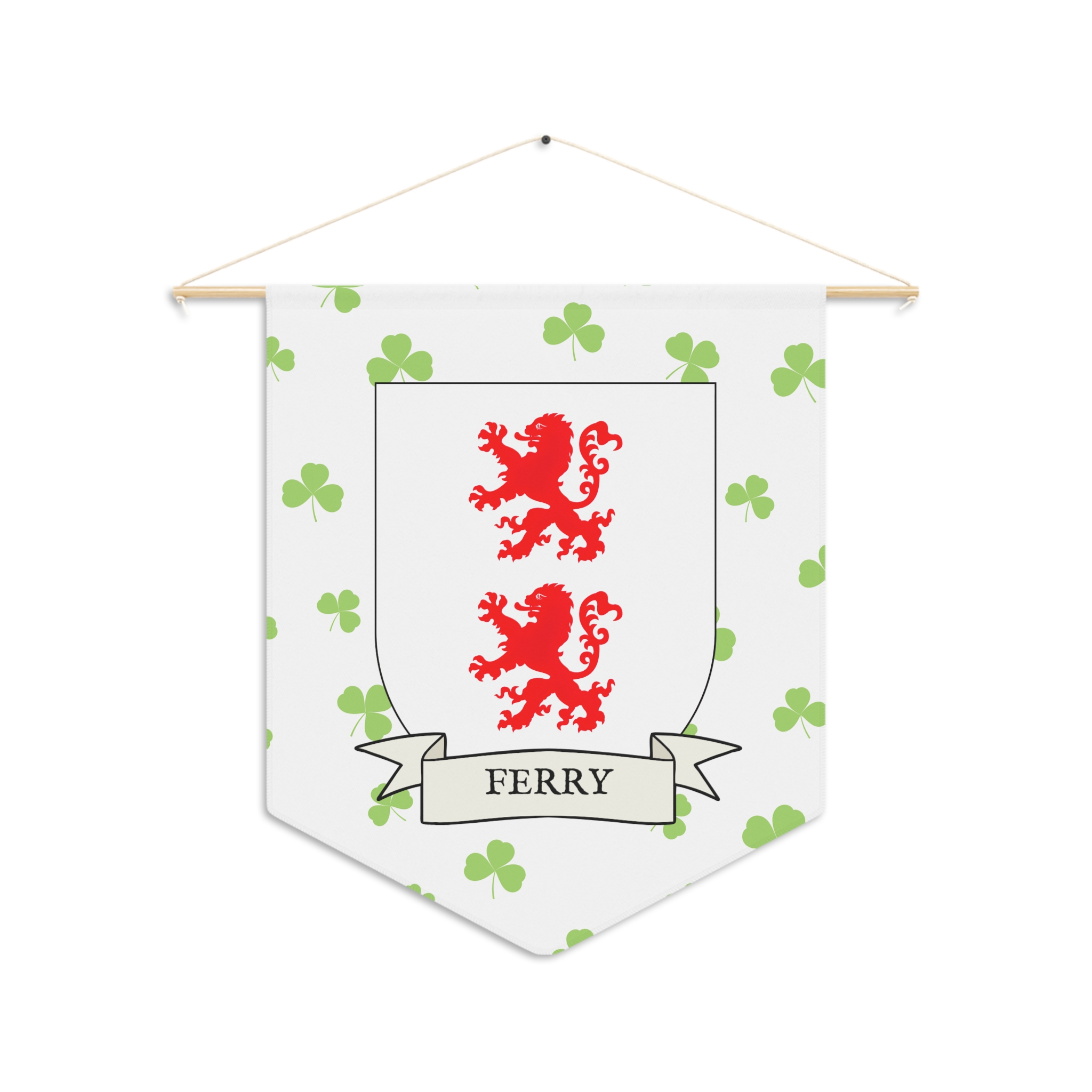 Uplift any room and show off your Irish American roots with this Ferry Family Coat of Arms Indoor Pennant. Pennant is printed on durable poly twill and comes with a wooden dowel/twine frame for easy hanging. Features your family’s Coat of Arms printed over a restrained shamrock patterned background.