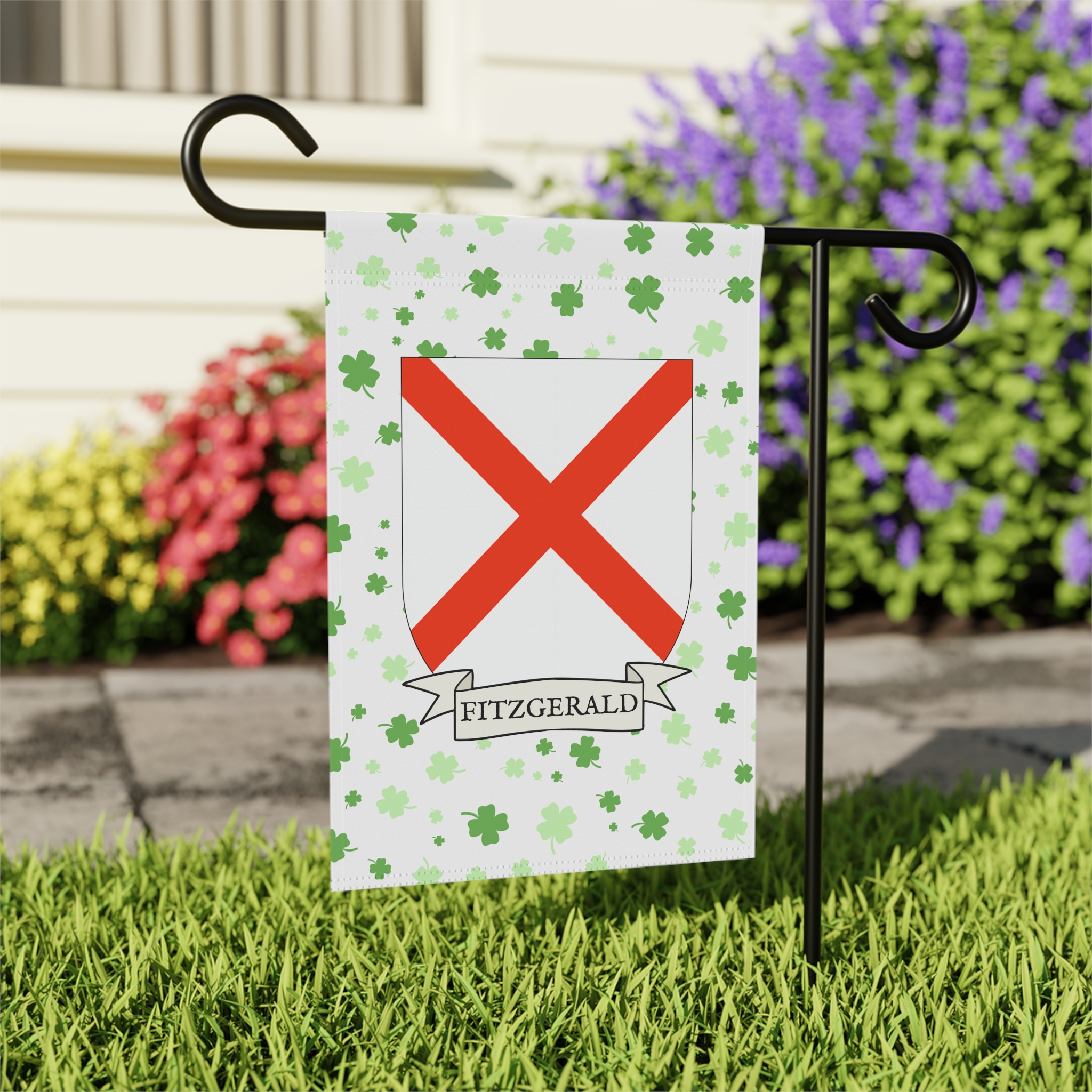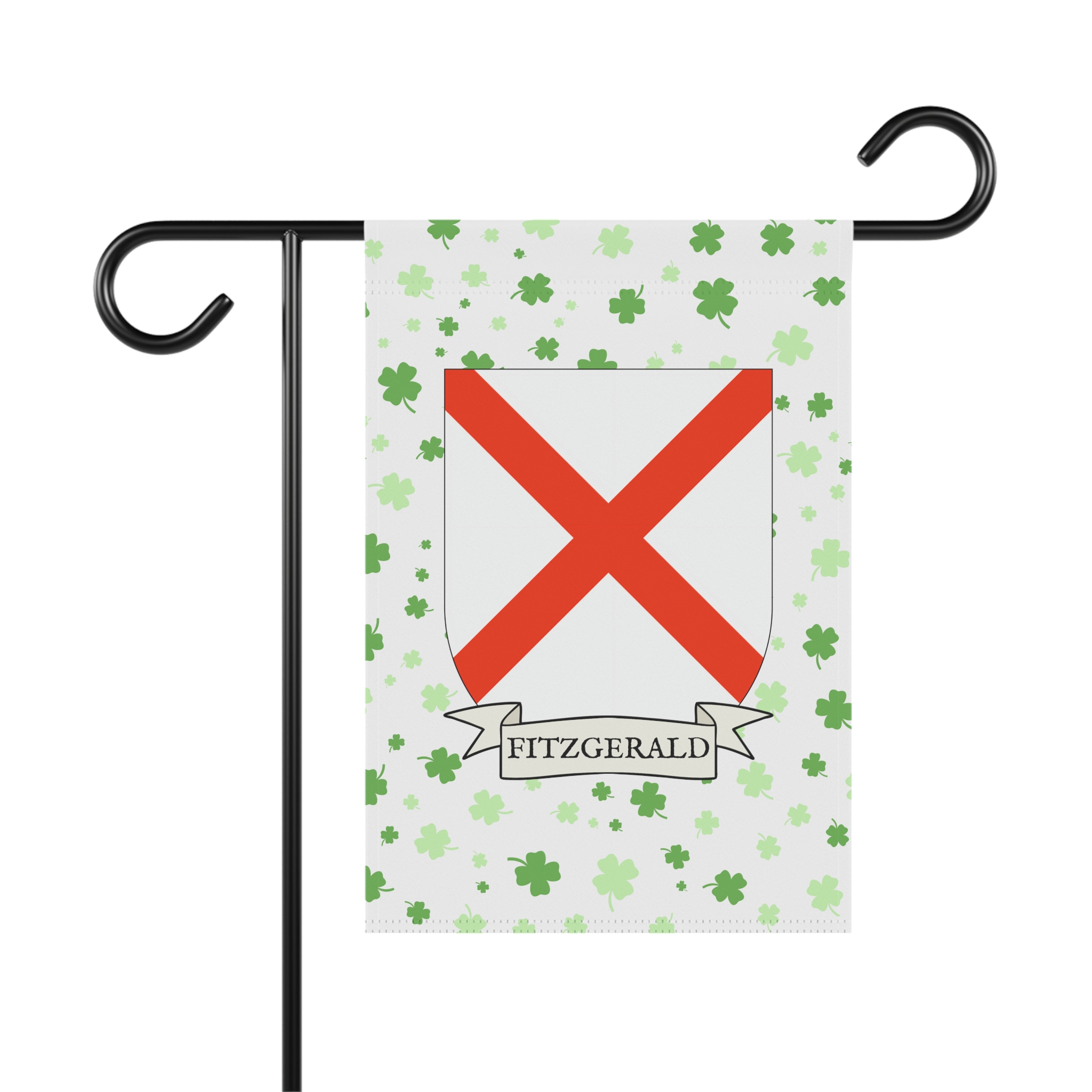 This welcoming Garden Banner will be a great addition to your garden or yard. It displays the Fitzgerald Family Coat of Arms over a subtle background showing a field of four-leaf shamrocks. Both sides show identical images.