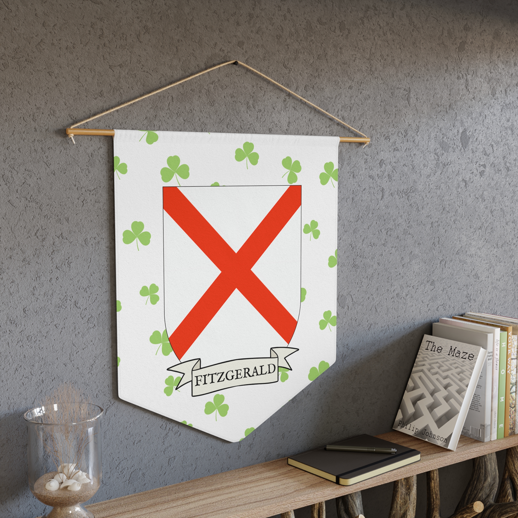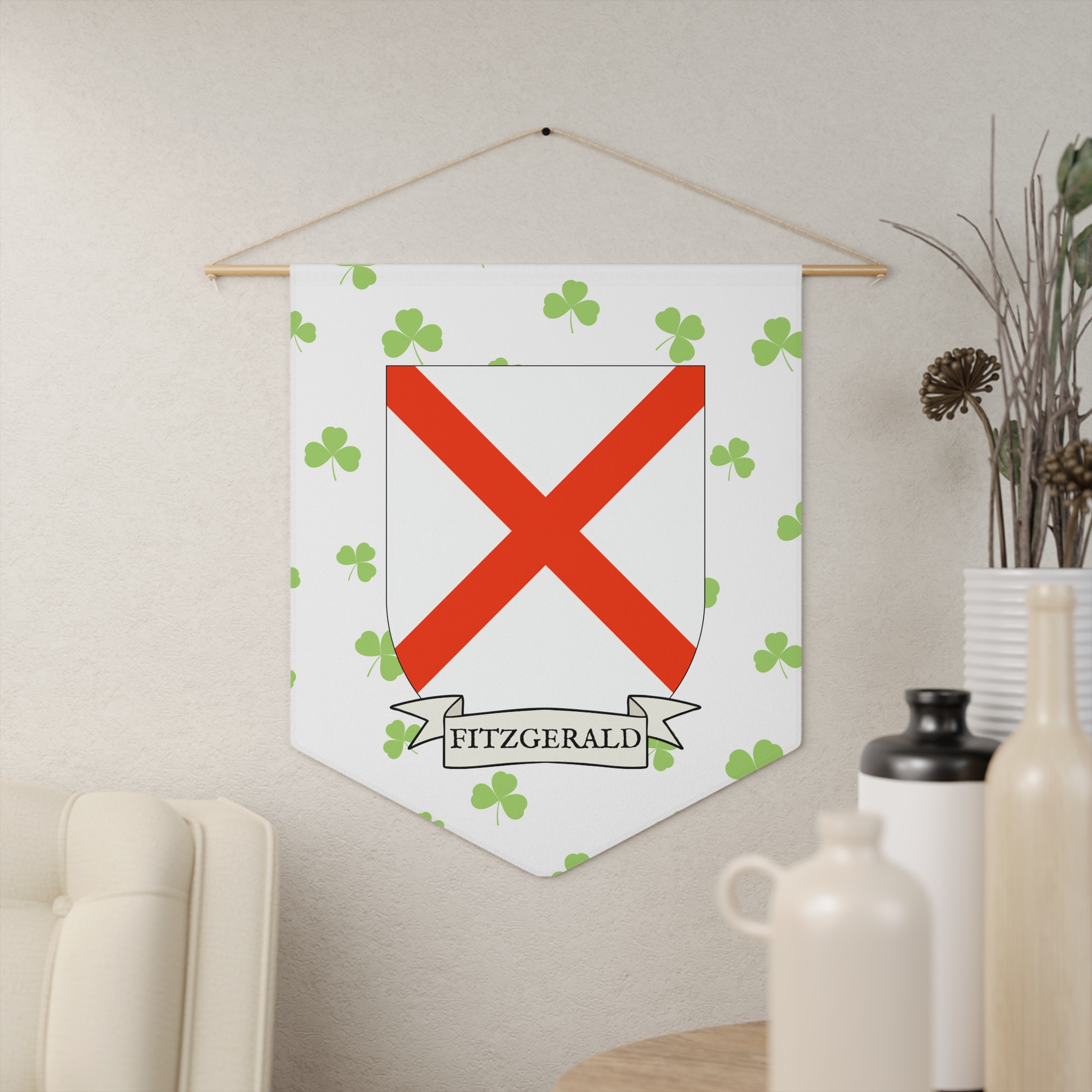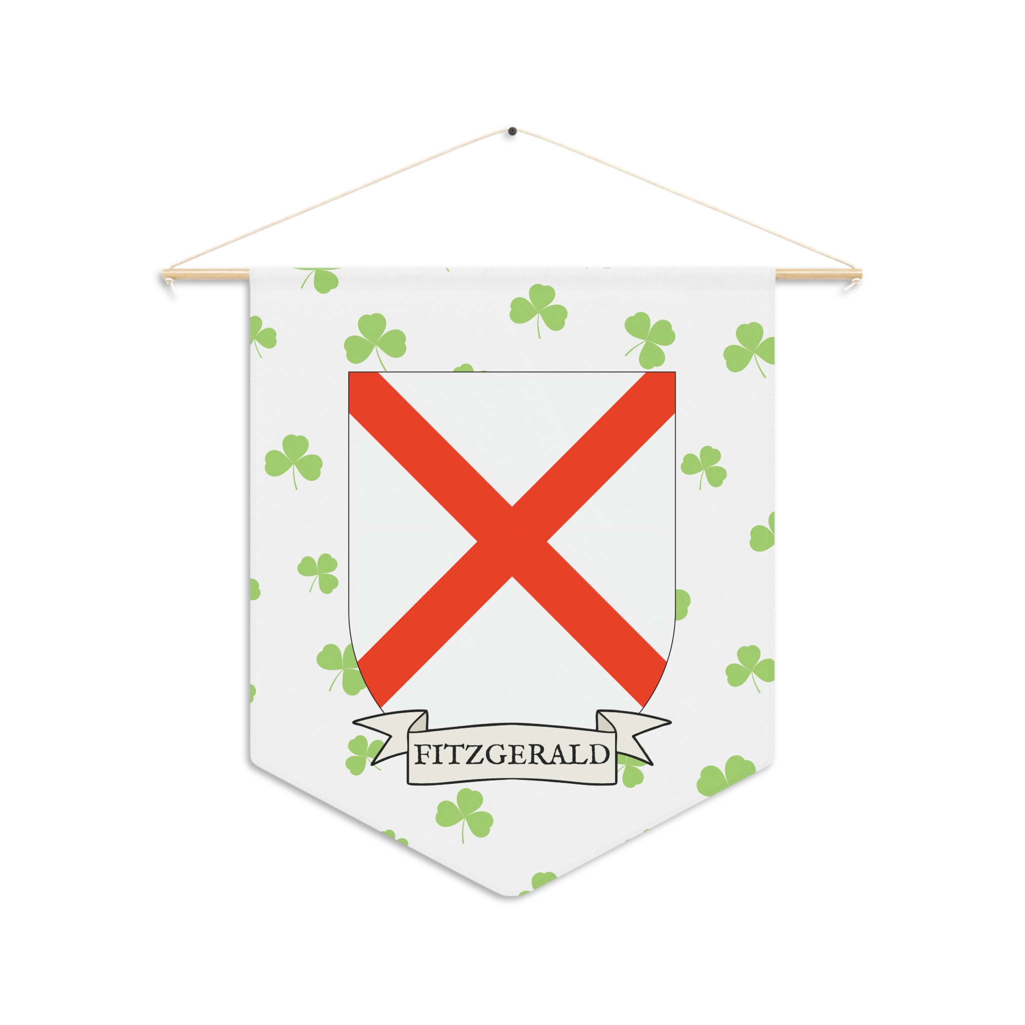 Uplift any room and show off your Irish American roots with this Fitzgerald Family Coat of Arms Indoor Pennant. Pennant is printed on durable poly twill and comes with a wooden dowel/twine frame for easy hanging. Features your family’s Coat of Arms printed over a restrained shamrock patterned background.