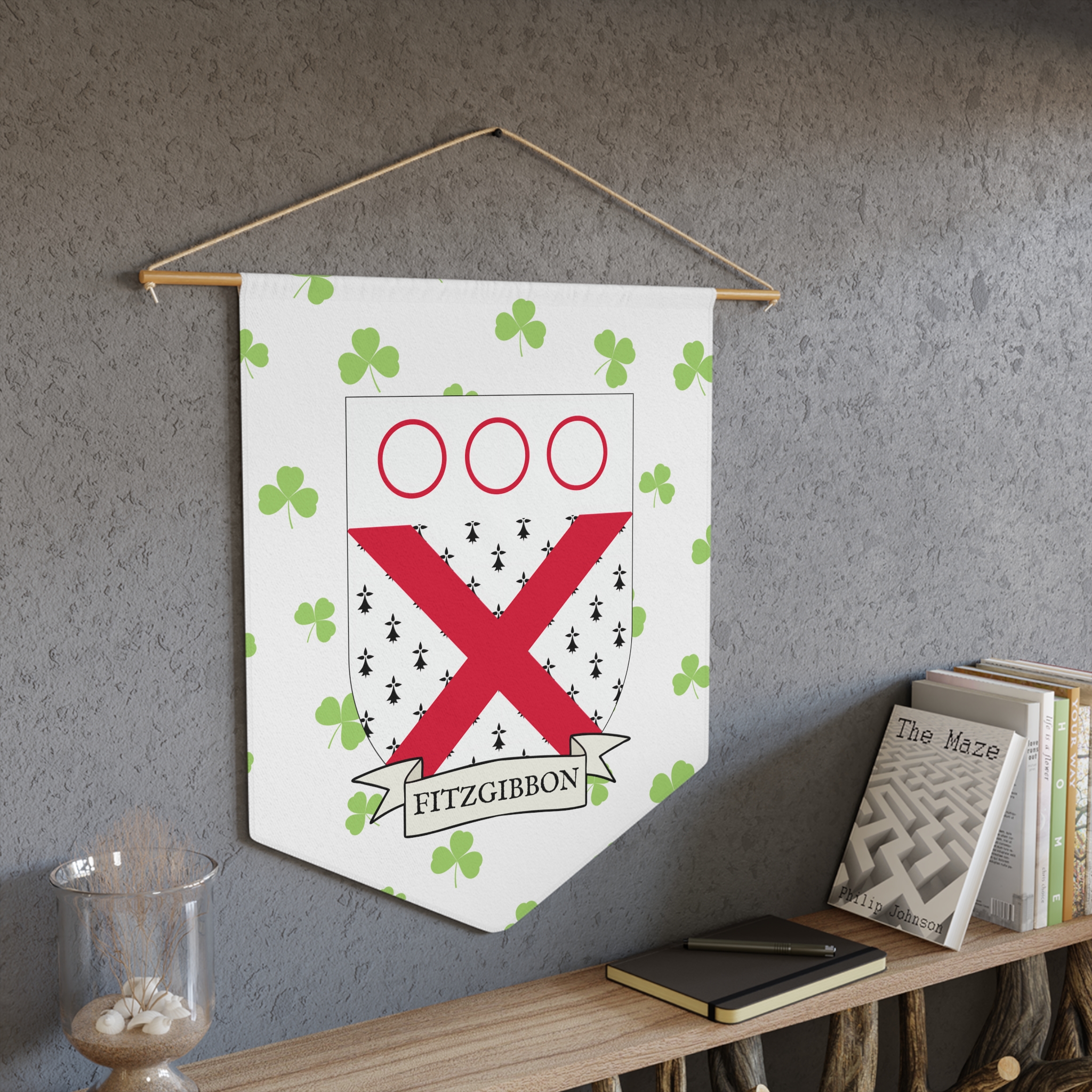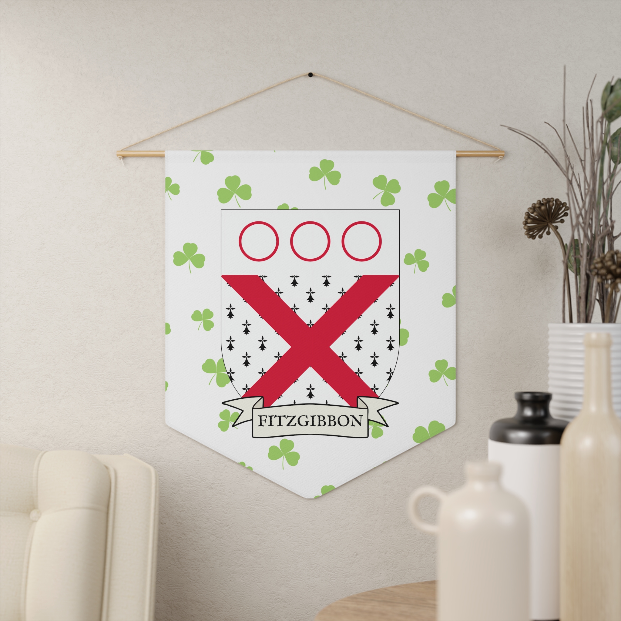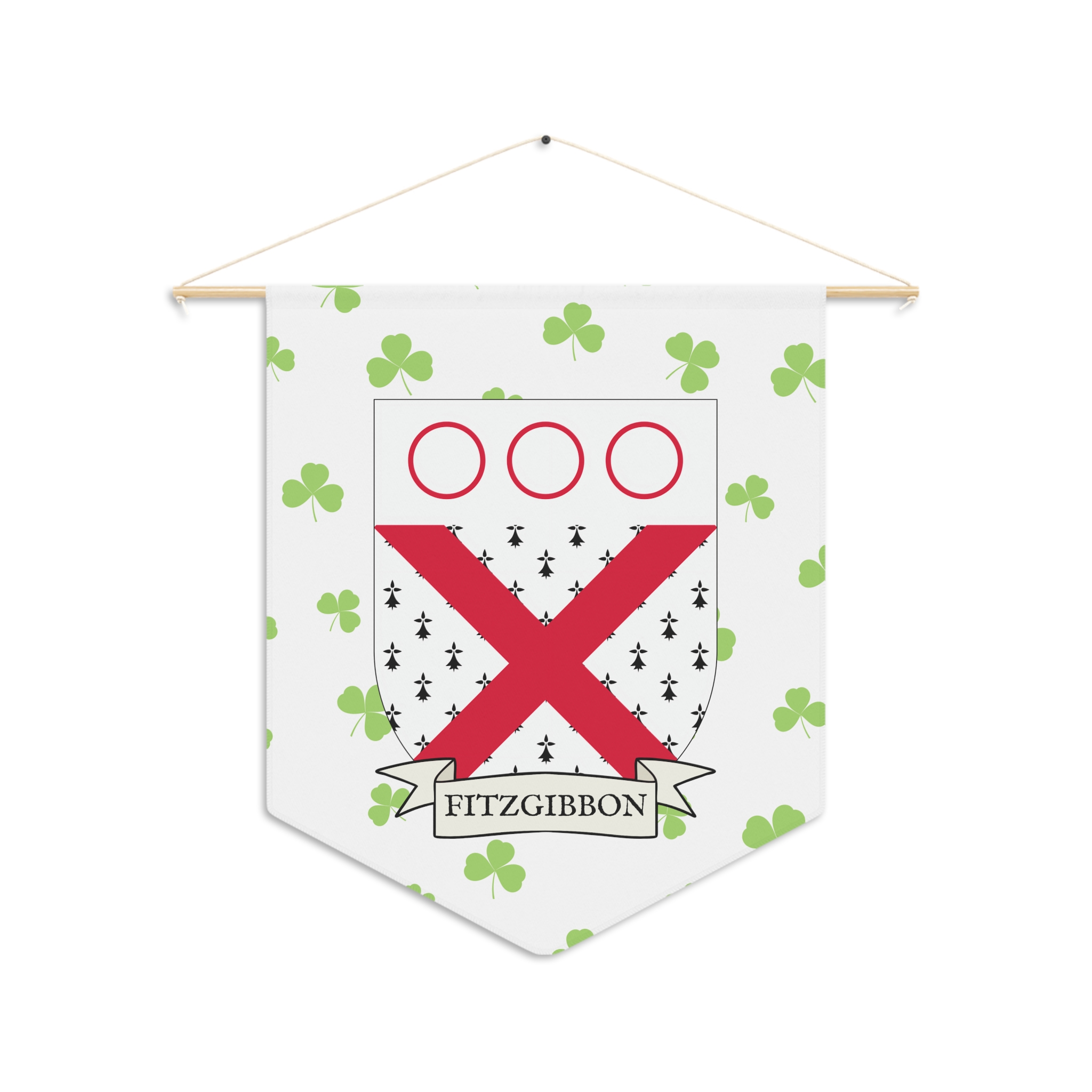Uplift any room and show off your Irish American roots with this Fitzgibbon Family Coat of Arms Indoor Pennant. Pennant is printed on durable poly twill and comes with a wooden dowel/twine frame for easy hanging. Features your family’s Coat of Arms printed over a restrained shamrock patterned background.