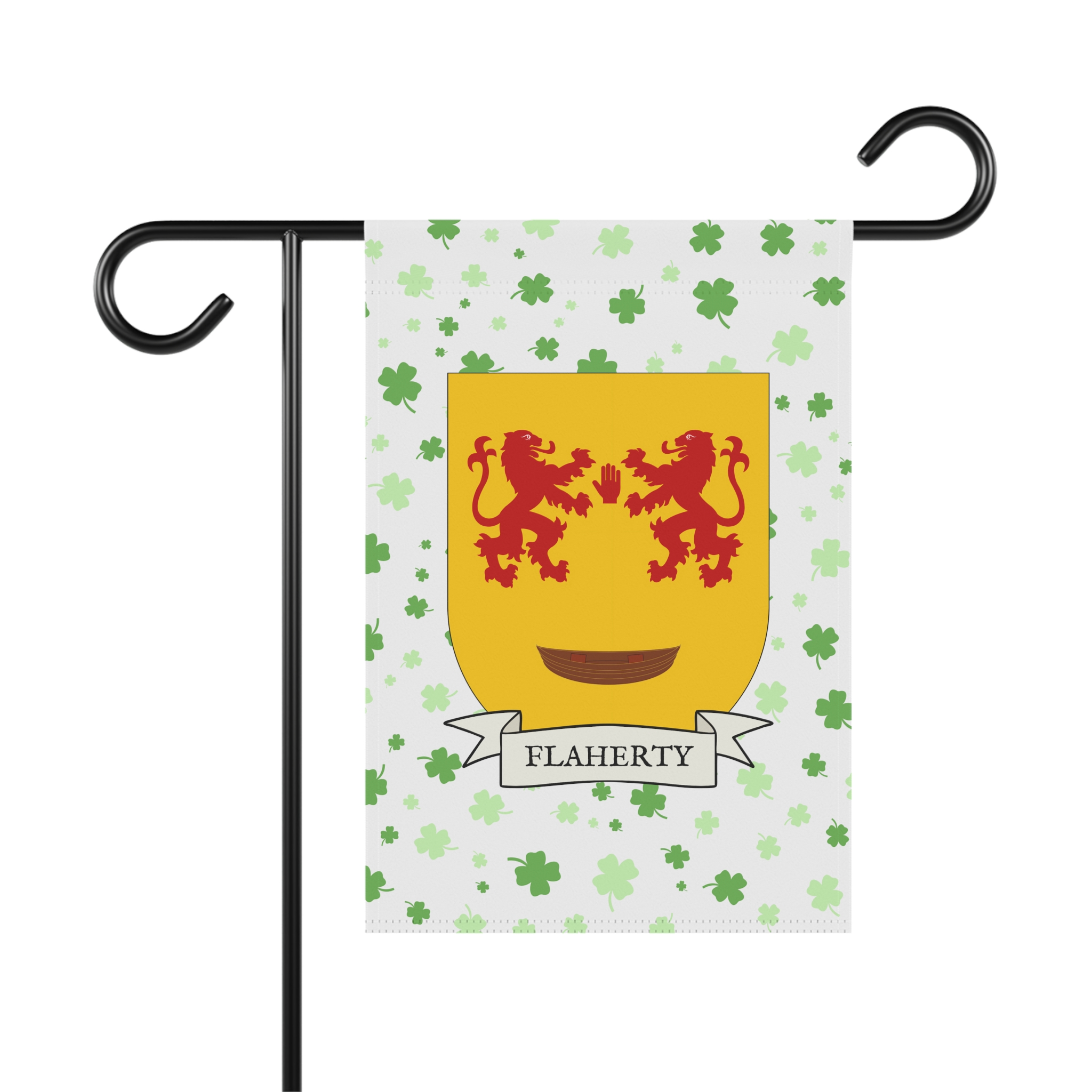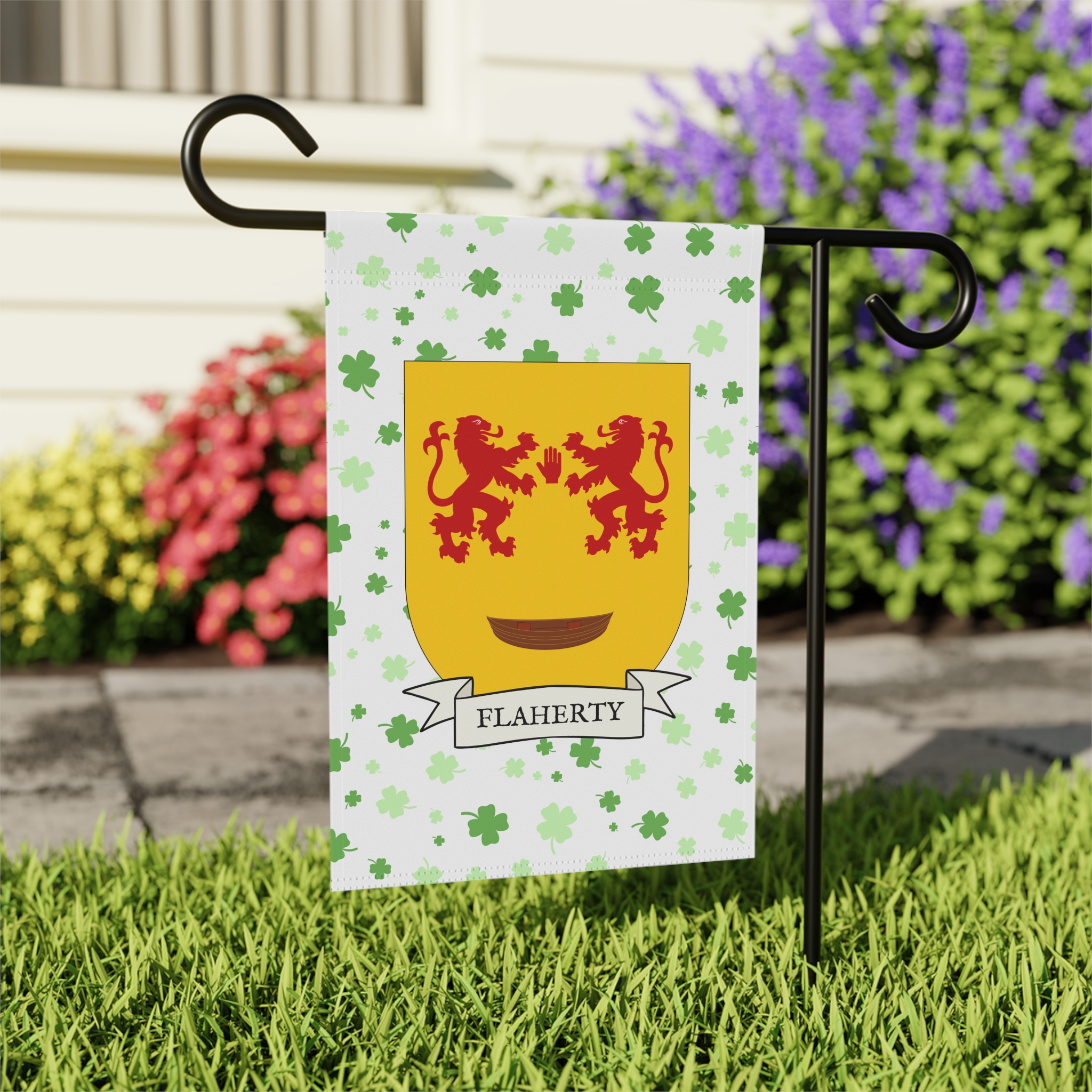 This welcoming Garden Banner will be a great addition to your garden or yard. It displays the Flaherty Family Coat of Arms over a subtle background showing a field of four-leaf shamrocks. Both sides show identical images.