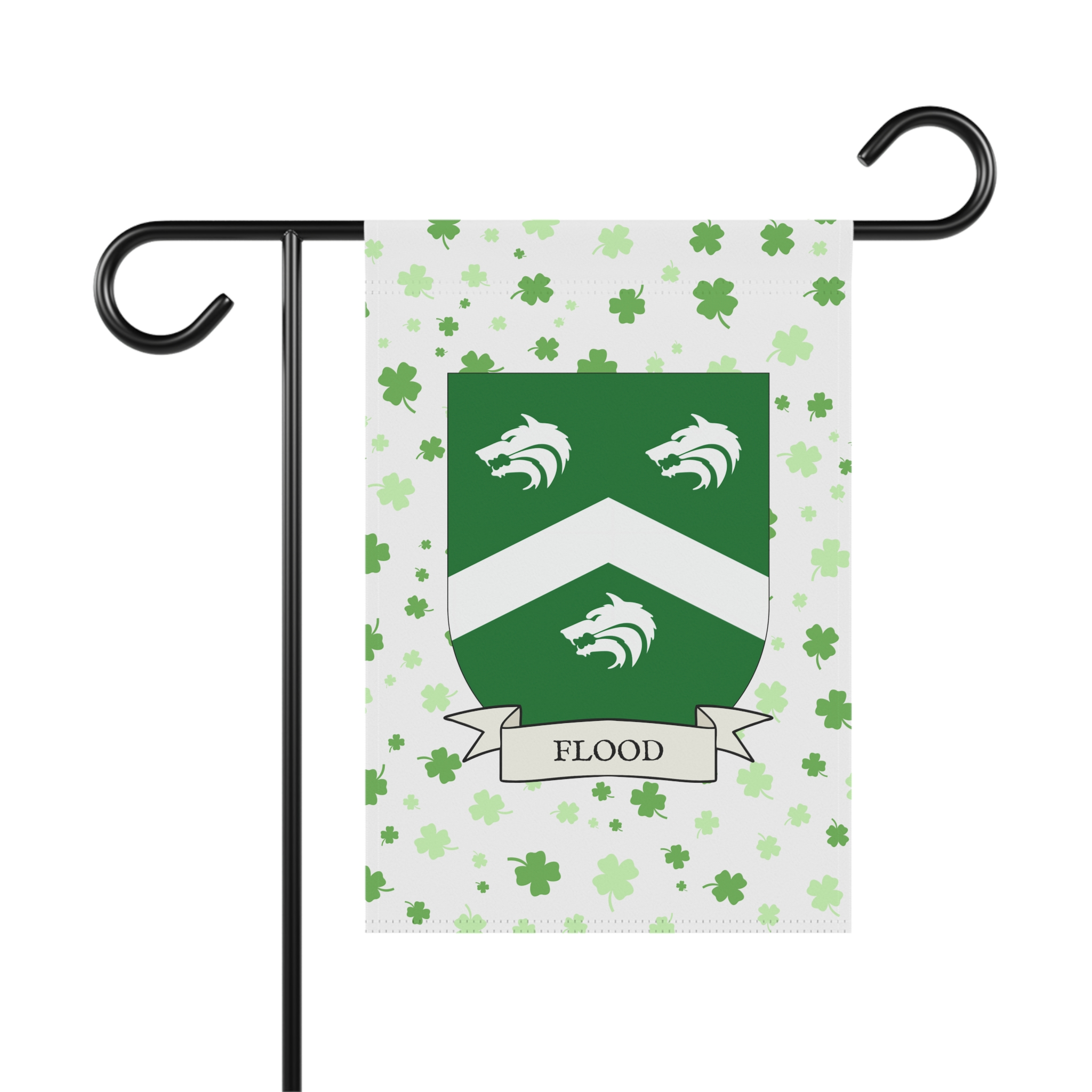 This welcoming Garden Banner will be a great addition to your garden or yard. It displays the Flood Family Coat of Arms over a subtle background showing a field of four-leaf shamrocks. Both sides show identical images.