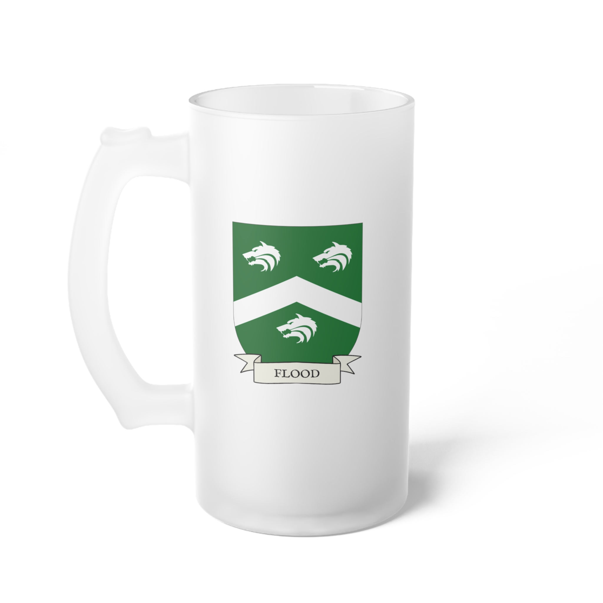 Flood Family Coat of Arms Frosted Glass 16 oz. Beer Mug