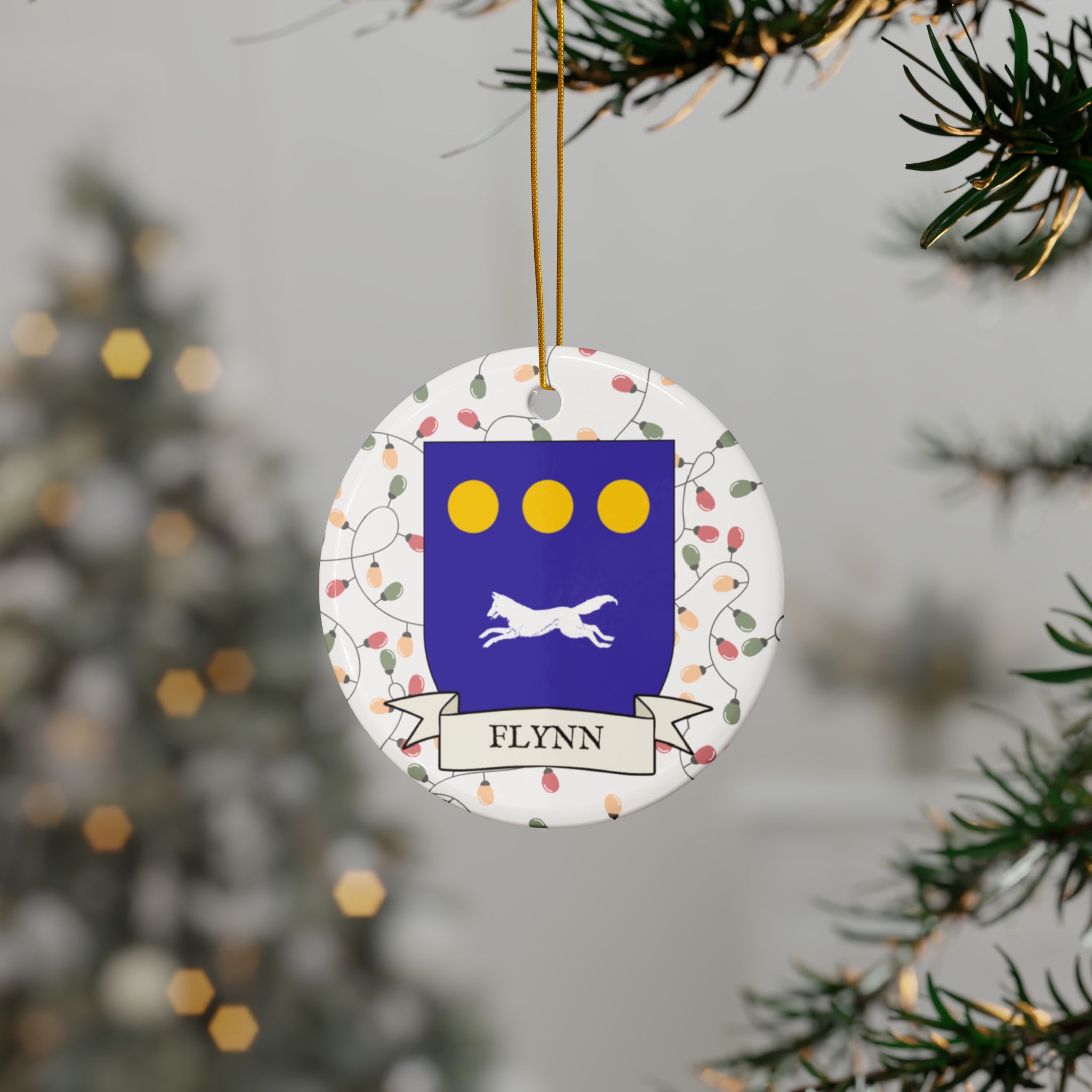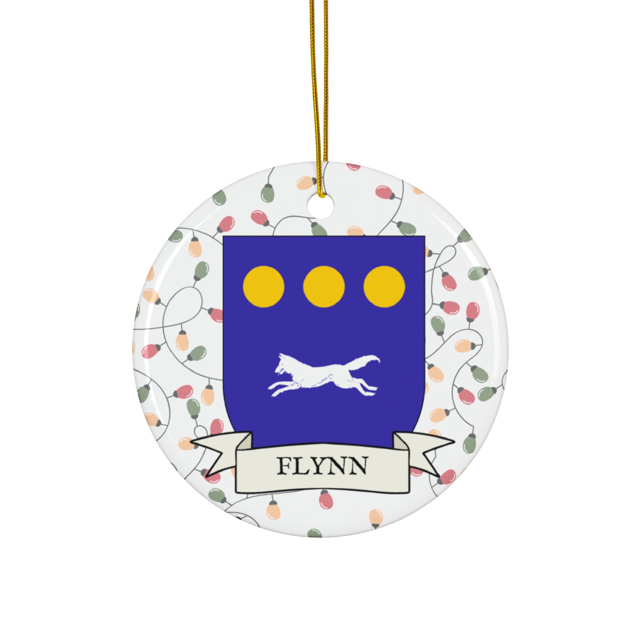 Celebrate the Holidays (and your Irish Heritage) with Irish Family Coat of Arms Christmas Tree Ornaments! Your family’s coat of arms printed on a 100% ceramic ornament with a festive Christmas Tree lights background. Great gift idea for the Irish Americans in your life. It’s sure to become a Christmas tradition!