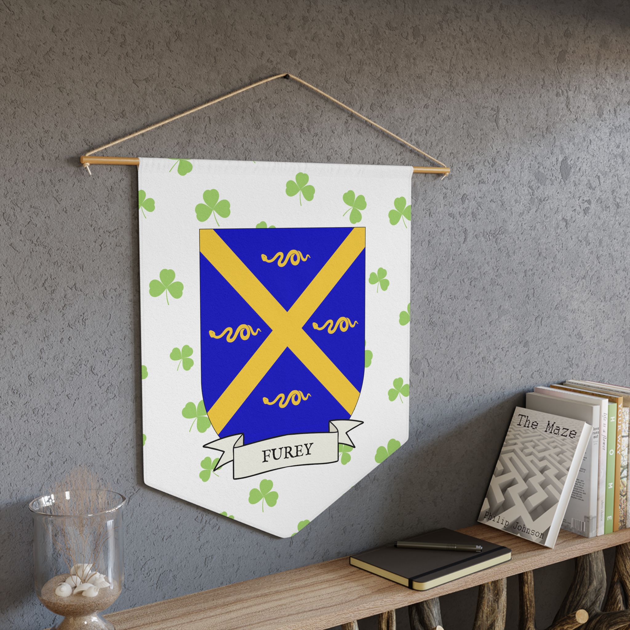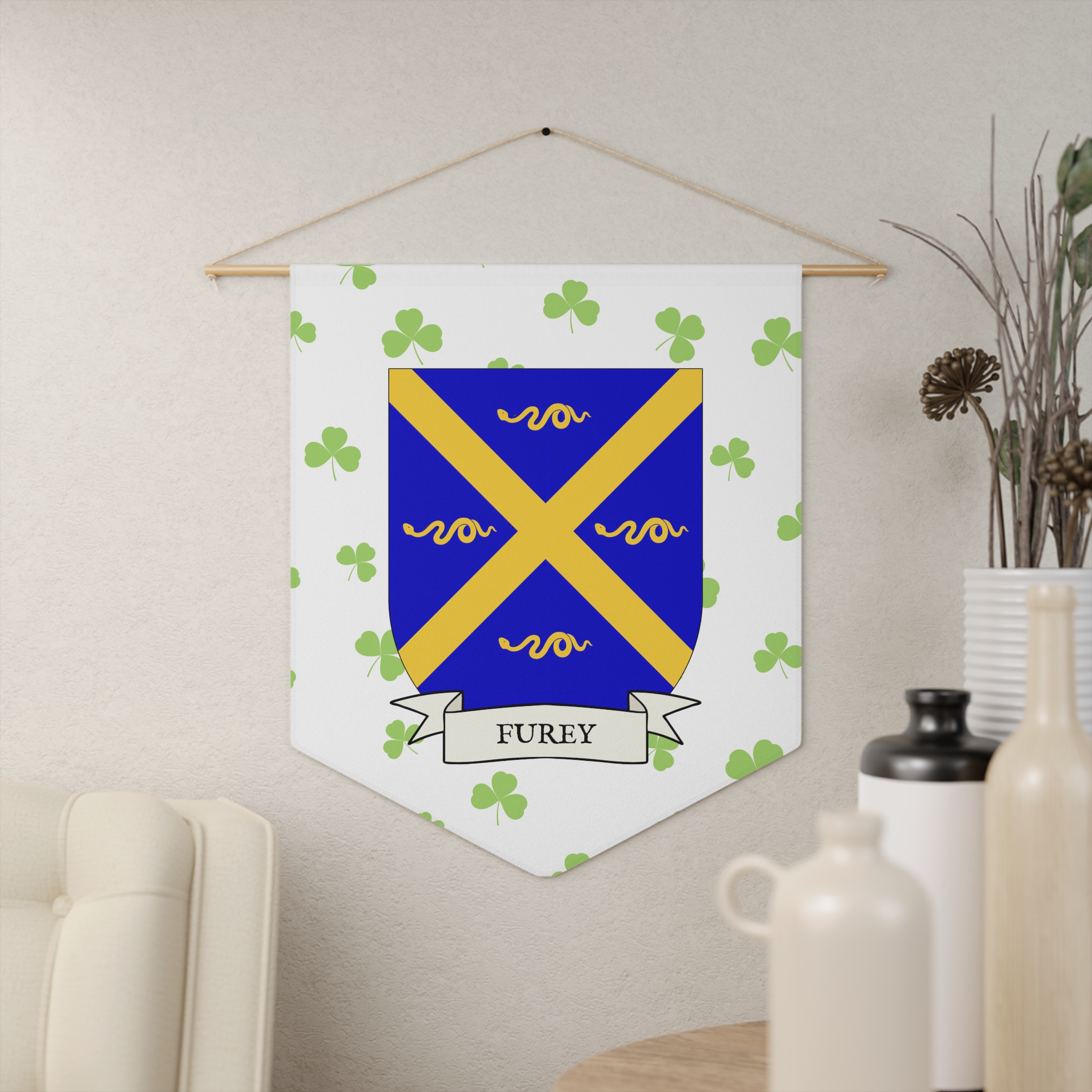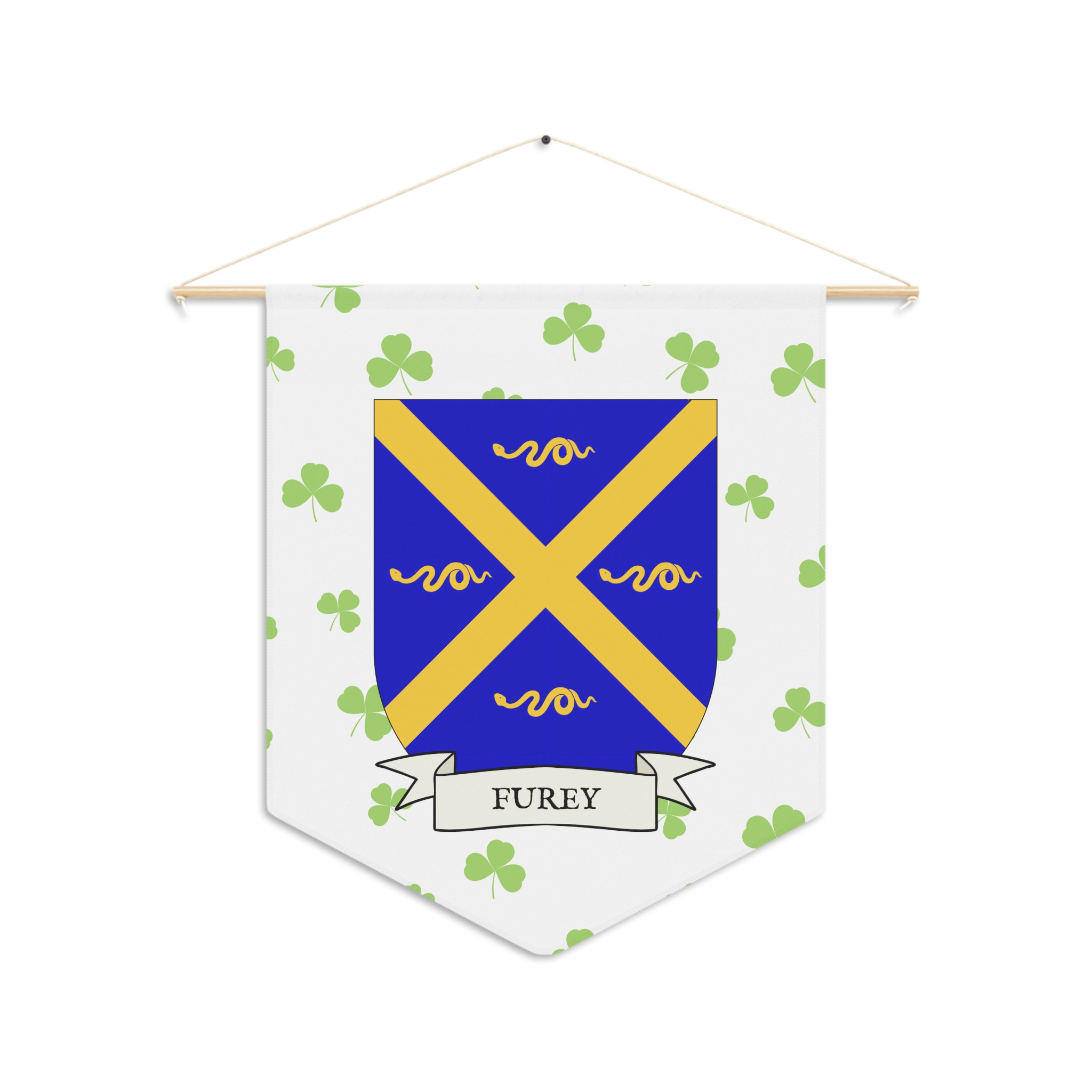 Uplift any room and show off your Irish American roots with this Furey Family Coat of Arms Indoor Pennant. Pennant is printed on durable poly twill and comes with a wooden dowel/twine frame for easy hanging. Features your family’s Coat of Arms printed over a restrained shamrock patterned background.