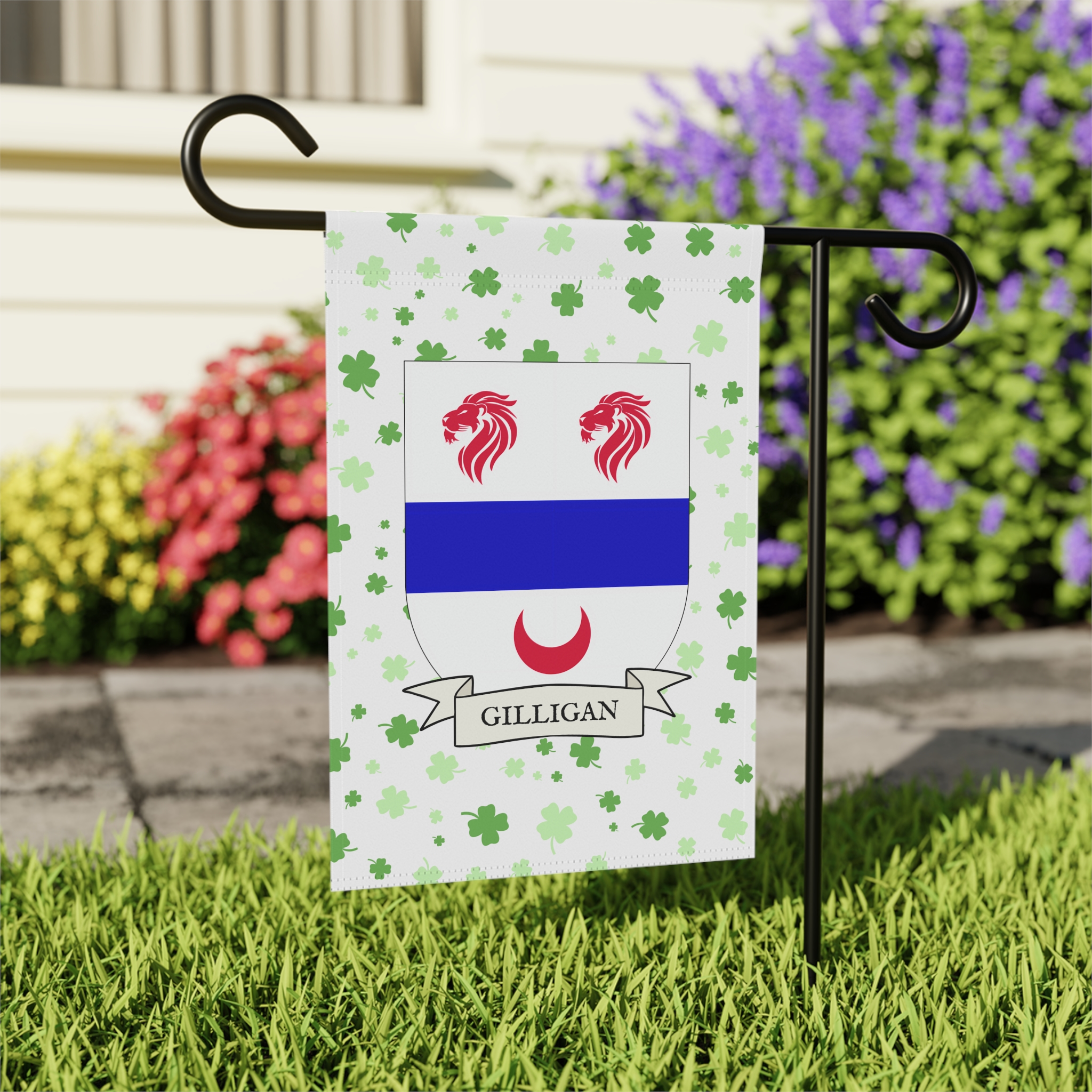 This welcoming Garden Banner will be a great addition to your garden or yard. It displays the Gilligan Family Coat of Arms over a subtle background showing a field of four-leaf shamrocks. Both sides show identical images.