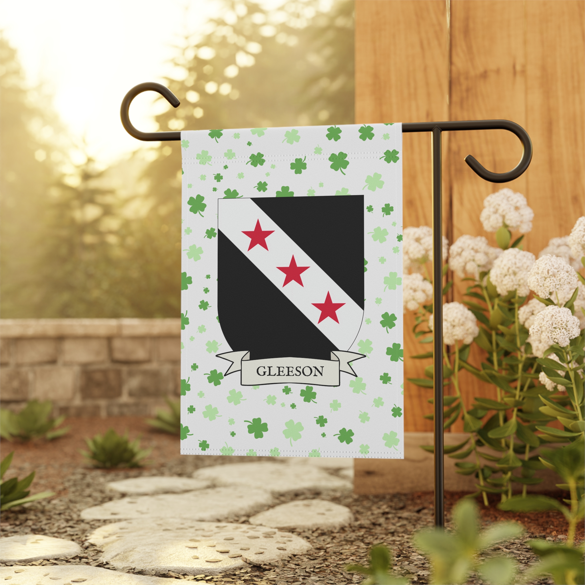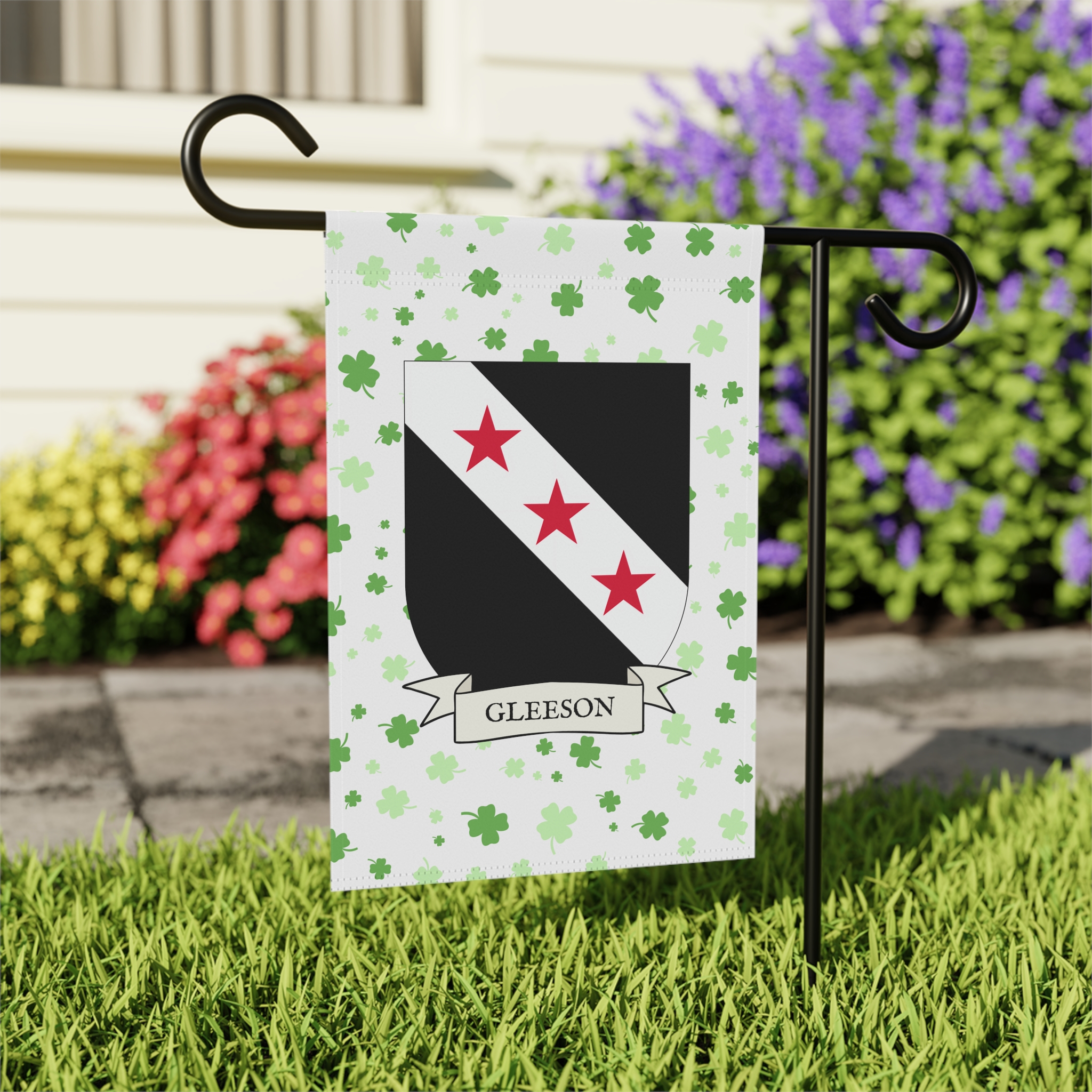 This welcoming Garden Banner will be a great addition to your garden or yard. It displays the Gleeson Family Coat of Arms over a subtle background showing a field of four-leaf shamrocks. Both sides show identical images.