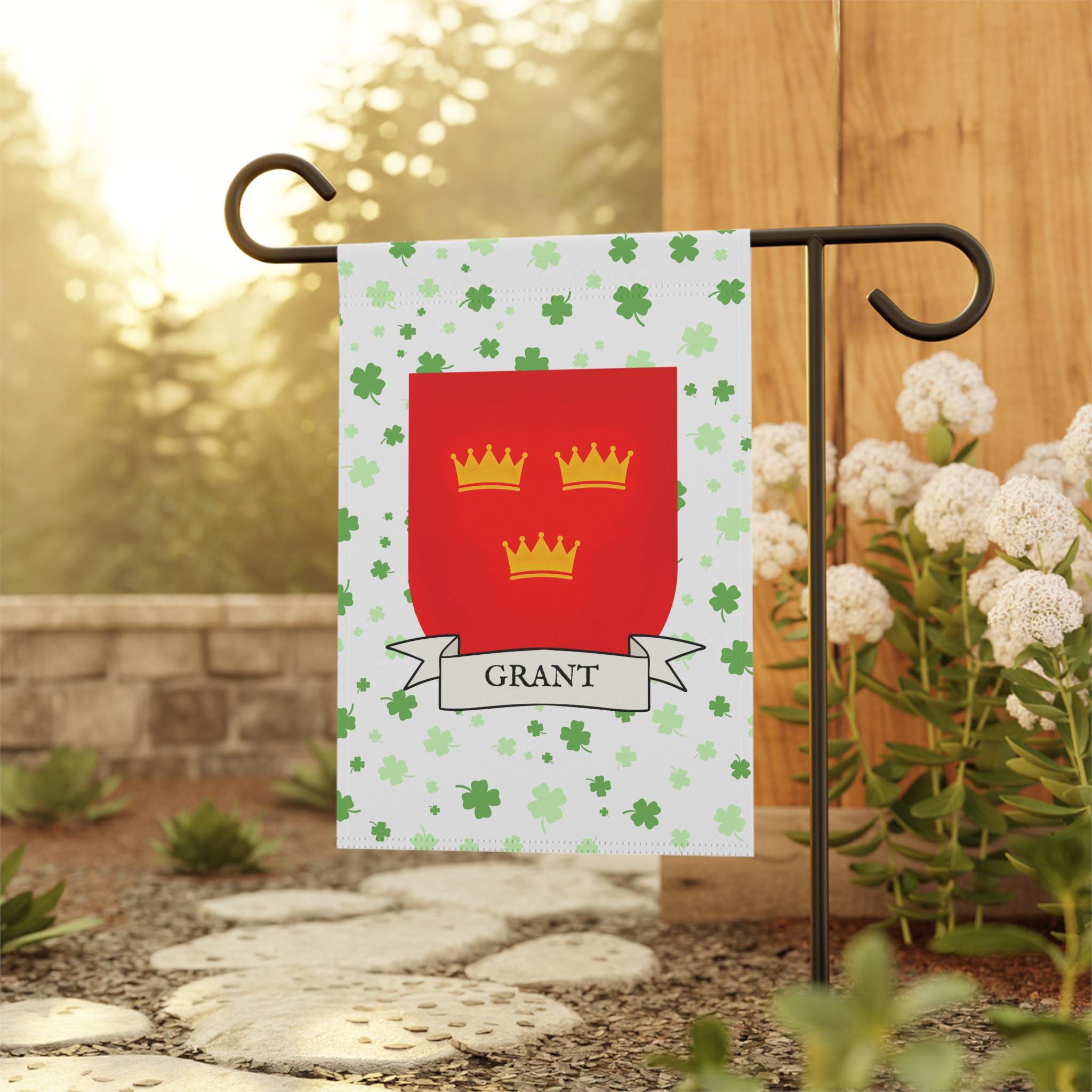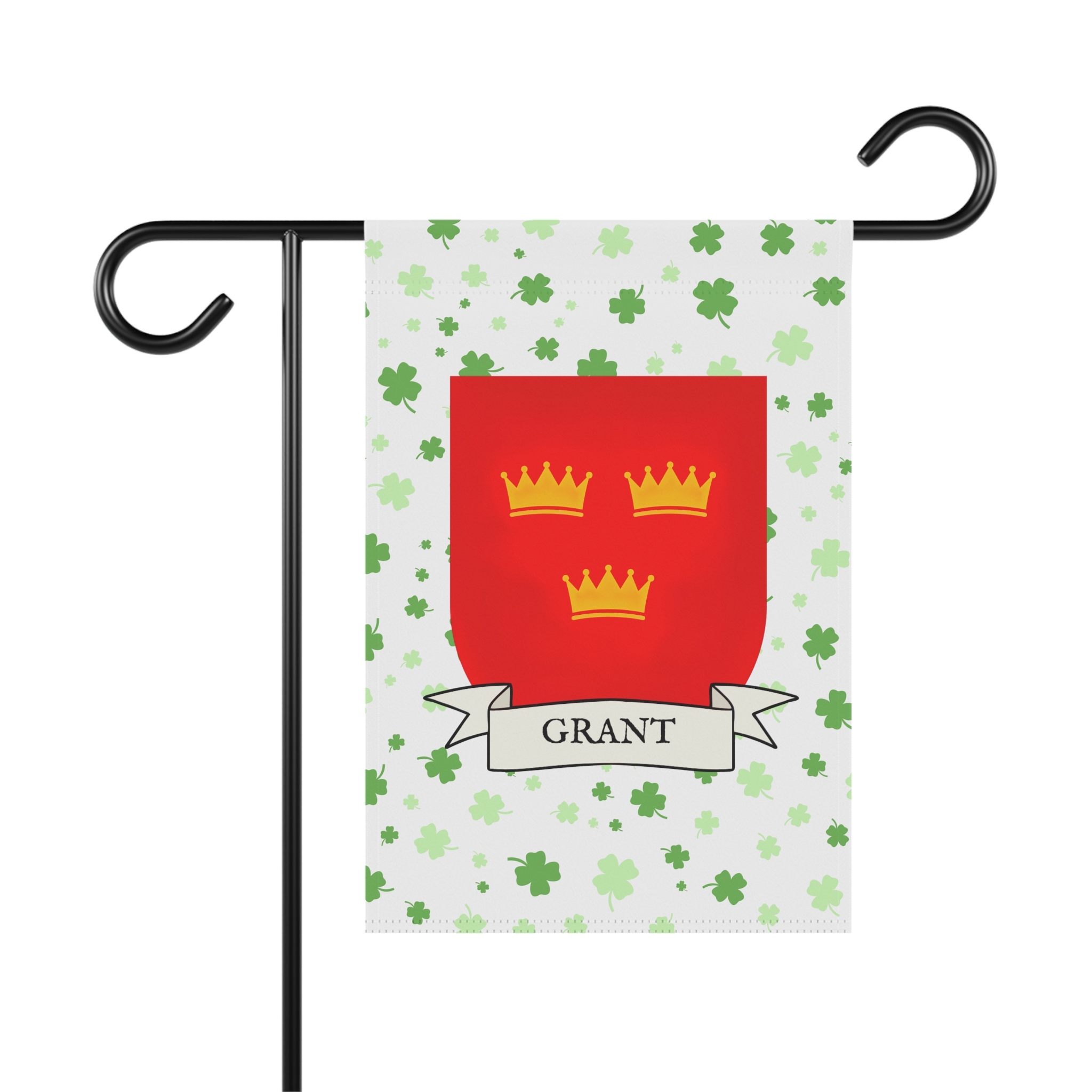 This welcoming Garden Banner will be a great addition to your garden or yard. It displays the Grant Family Coat of Arms over a subtle background showing a field of four-leaf shamrocks. Both sides show identical images.