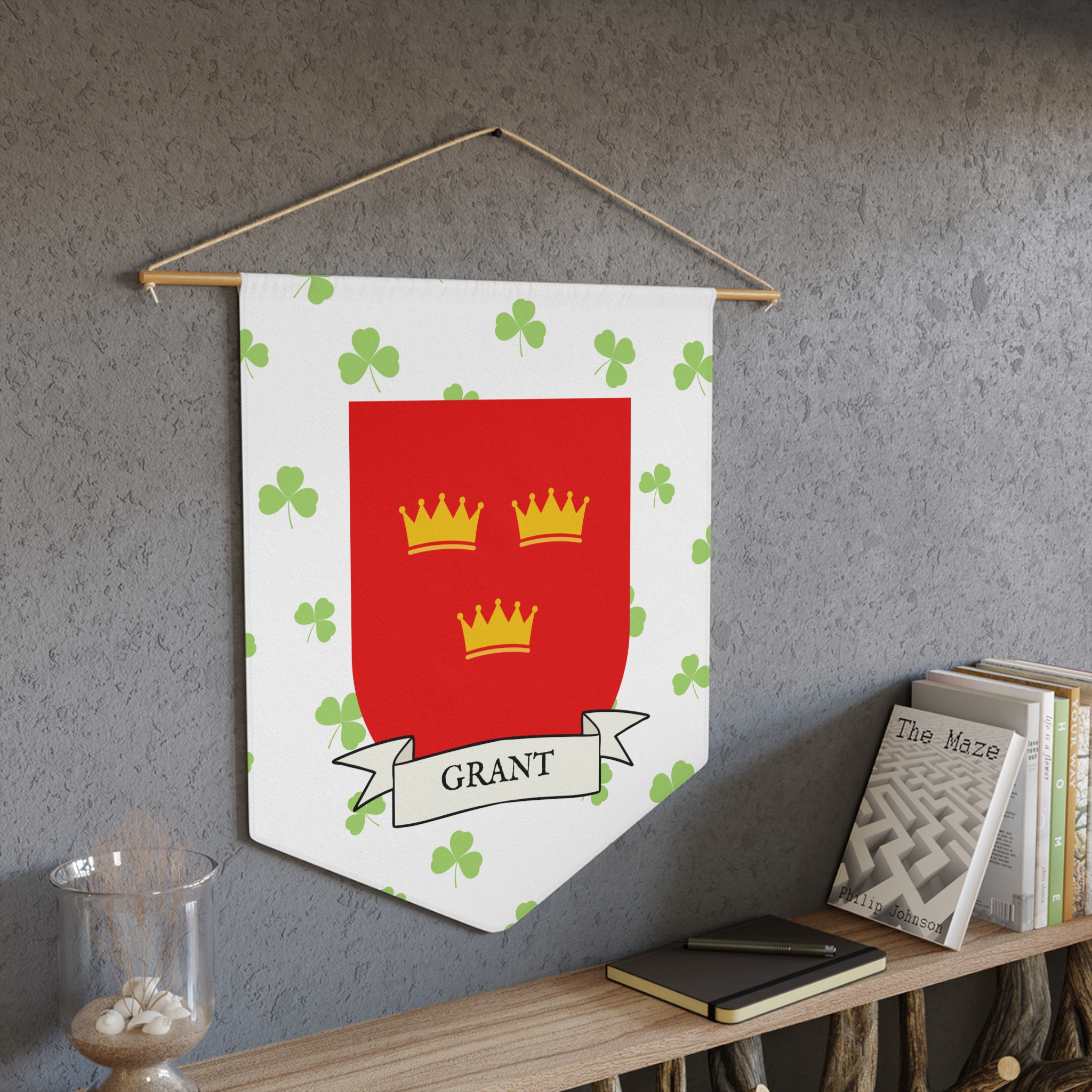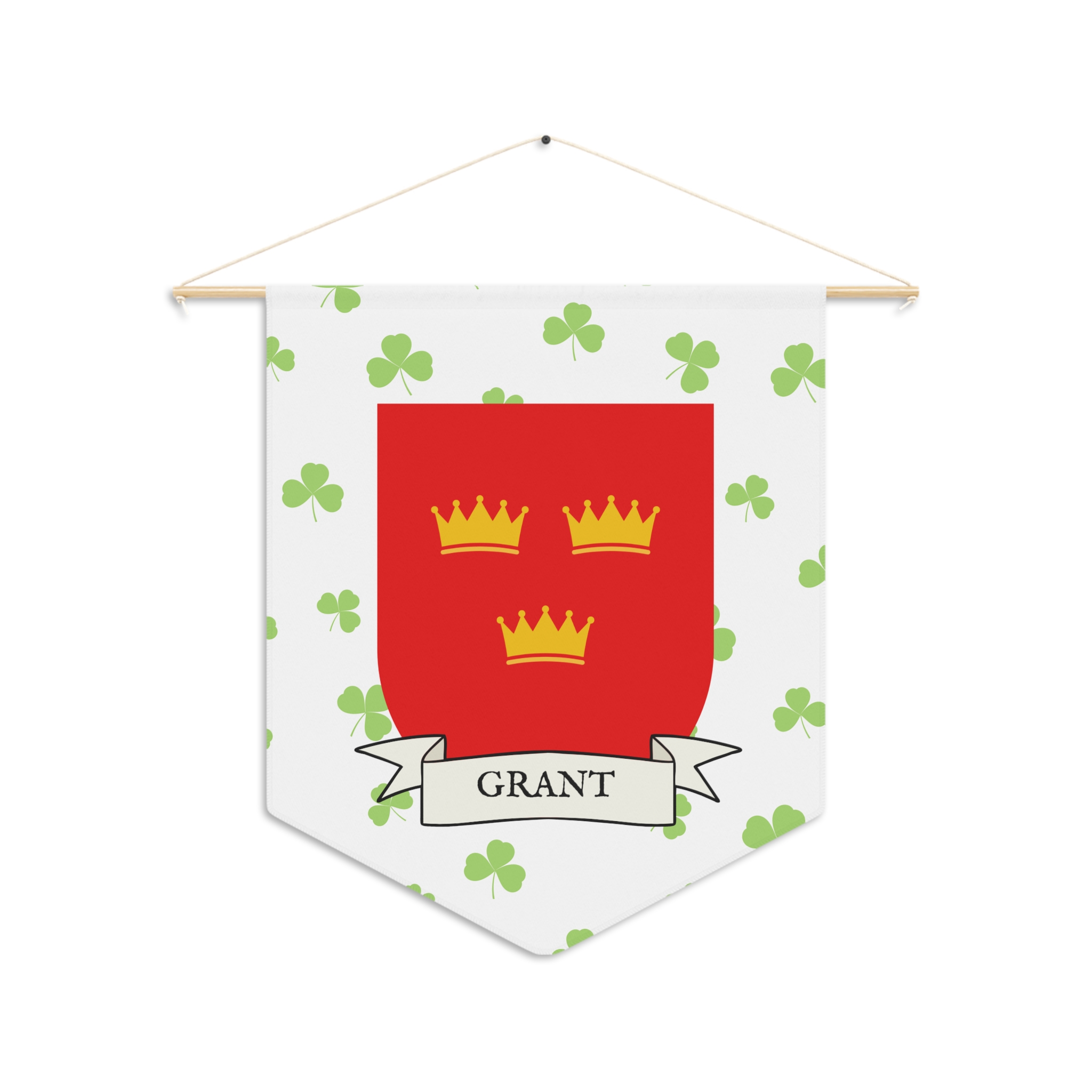 Uplift any room and show off your Irish American roots with this Grant Family Coat of Arms Indoor Pennant. Pennant is printed on durable poly twill and comes with a wooden dowel/twine frame for easy hanging. Features your family Coat of Arms printed over a restrained shamrock patterned background.