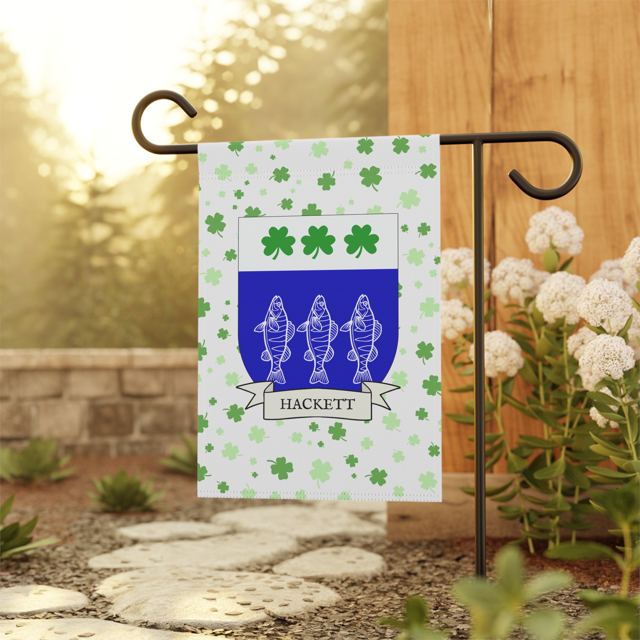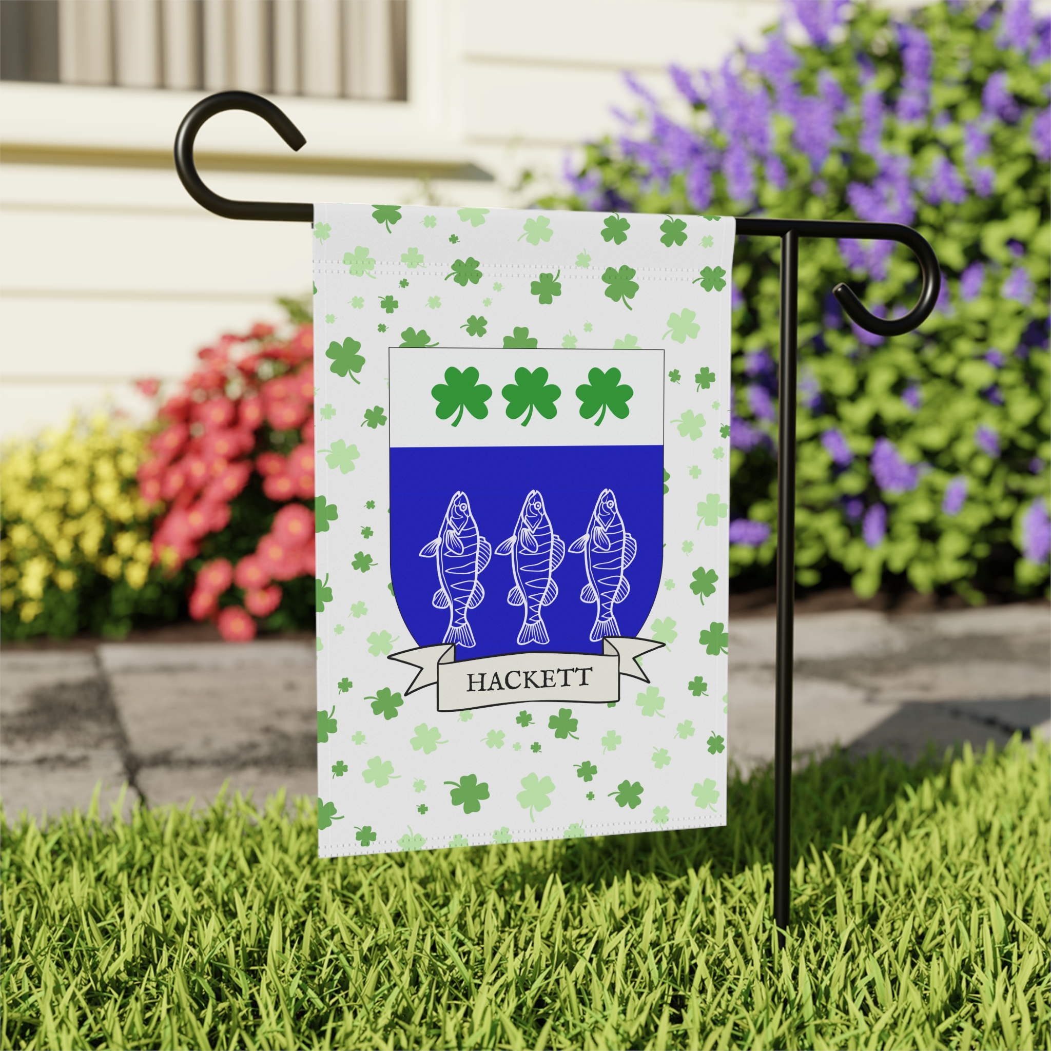 This welcoming Garden Banner will be a great addition to your garden or yard. It displays the Hackett Family Coat of Arms over a subtle background showing a field of four-leaf shamrocks. Both sides show identical images.