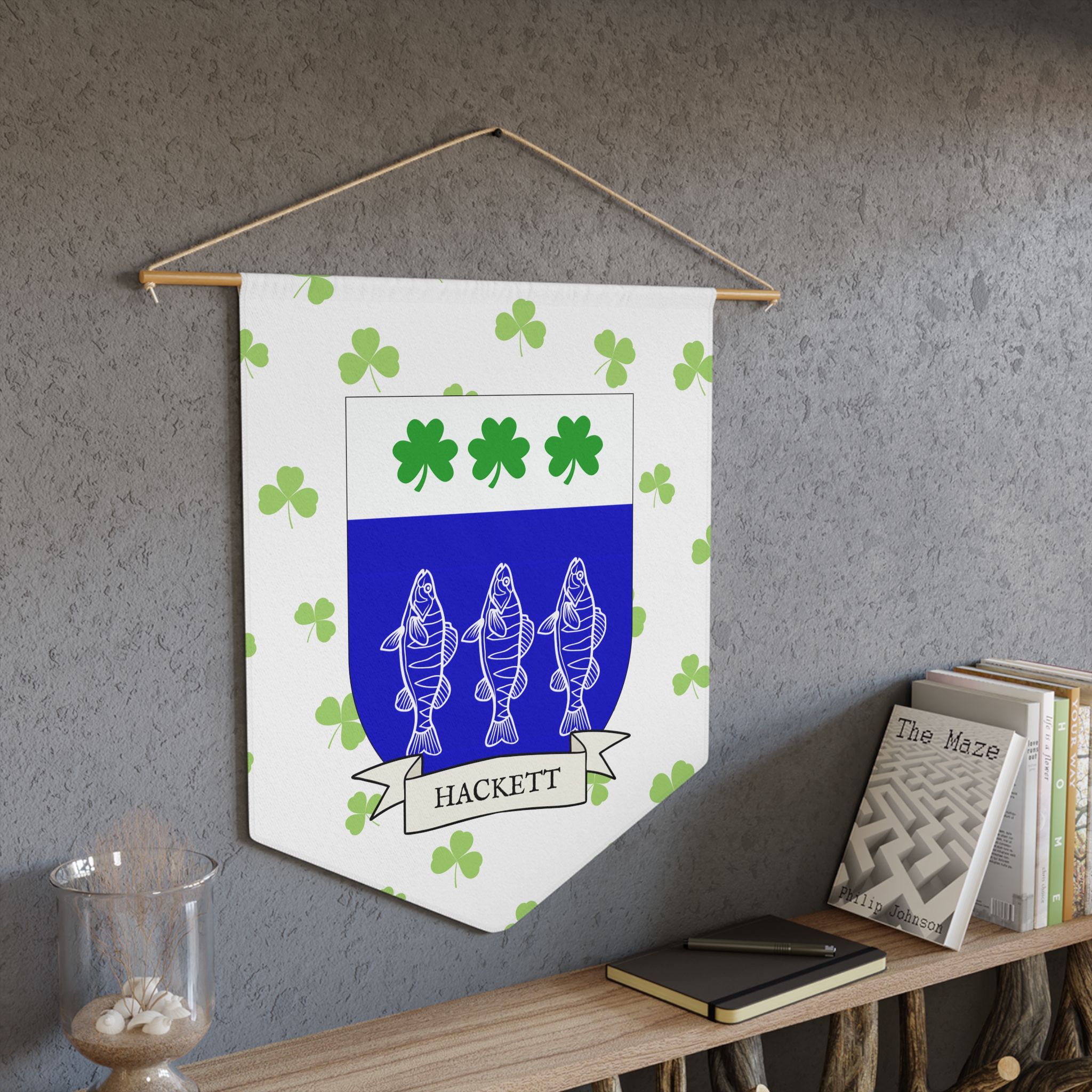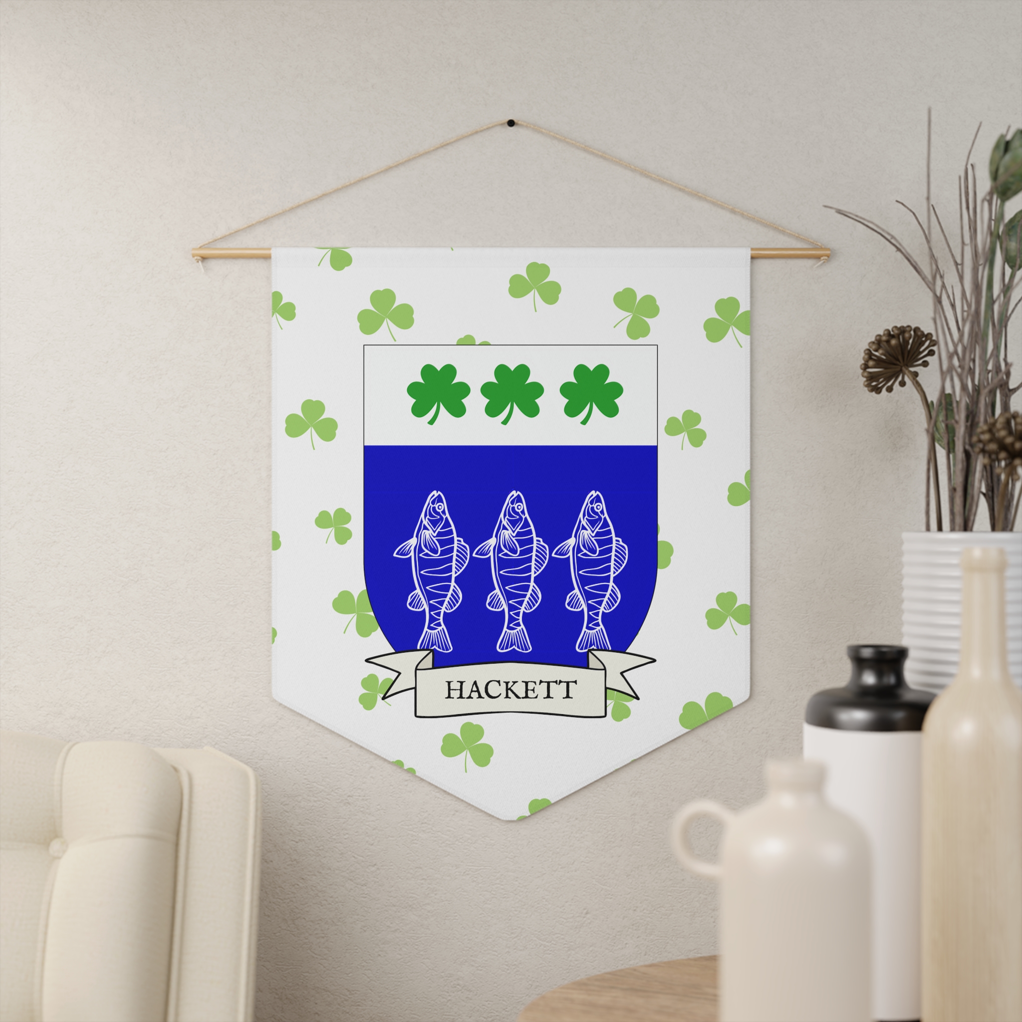 Uplift any room and show off your Irish American roots with this Hackett Family Coat of Arms Indoor Pennant. Pennant is printed on durable poly twill and comes with a wooden dowel/twine frame for easy hanging. Features your family Coat of Arms printed over a restrained shamrock patterned background.
