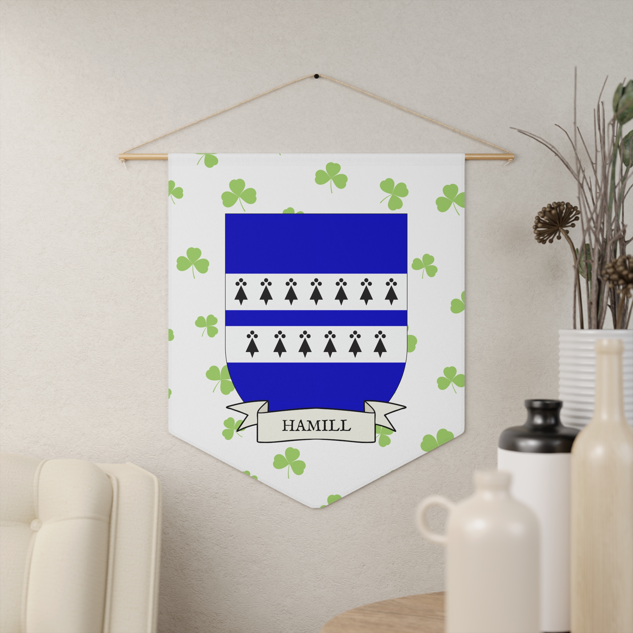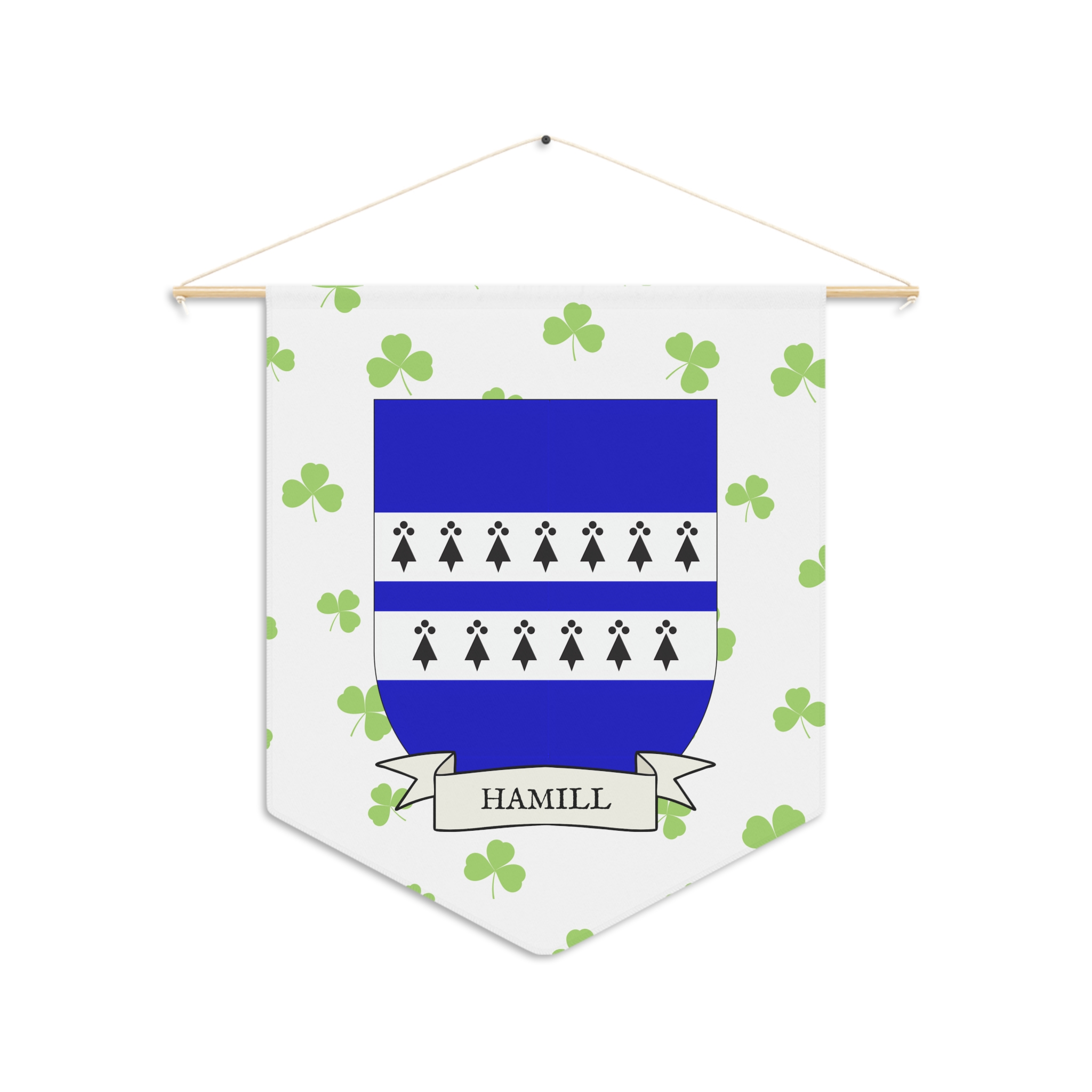 Uplift any room and show off your Irish American roots with this Hamill Family Coat of Arms Indoor Pennant. Pennant is printed on durable poly twill and comes with a wooden dowel/twine frame for easy hanging. Features your family Coat of Arms printed over a restrained shamrock patterned background.