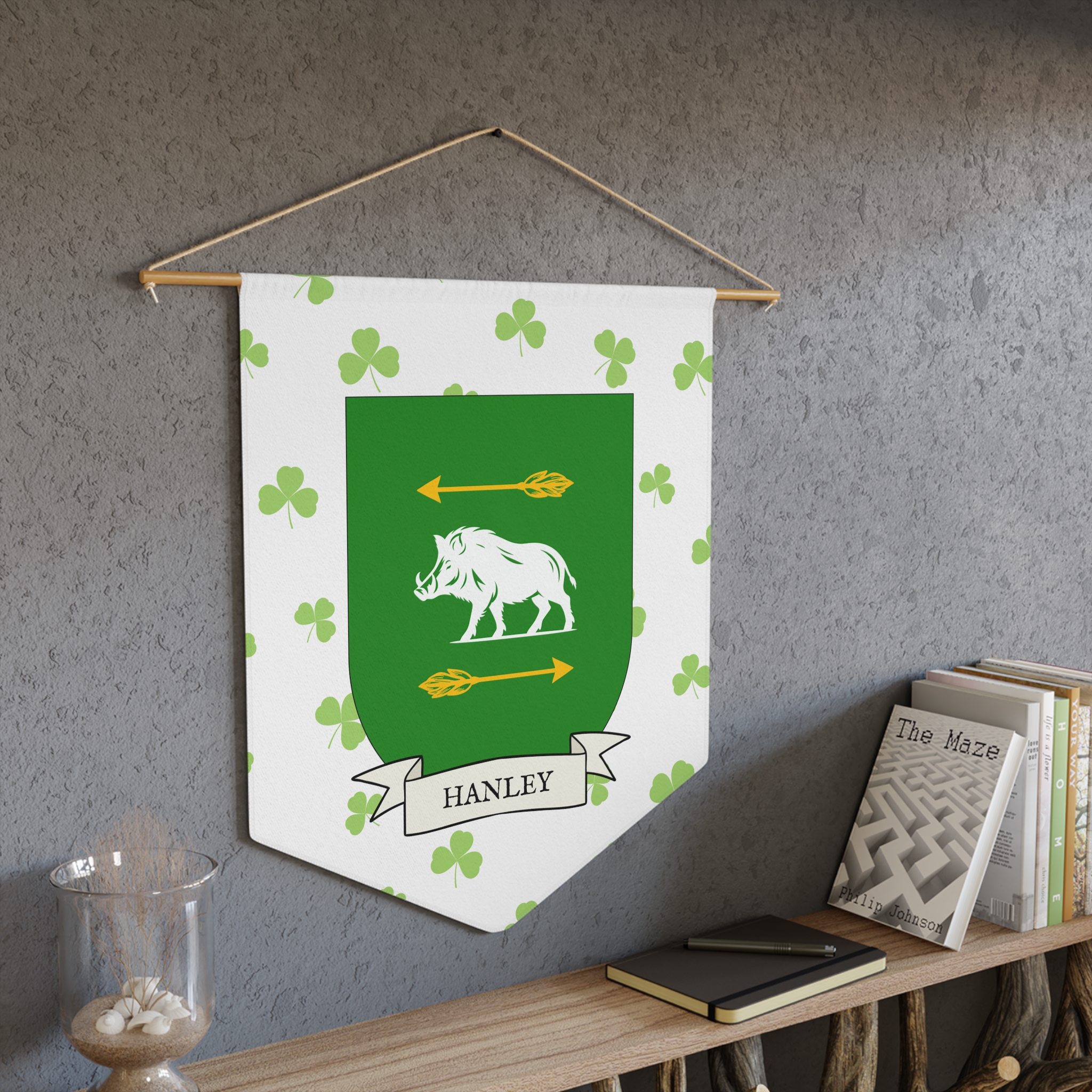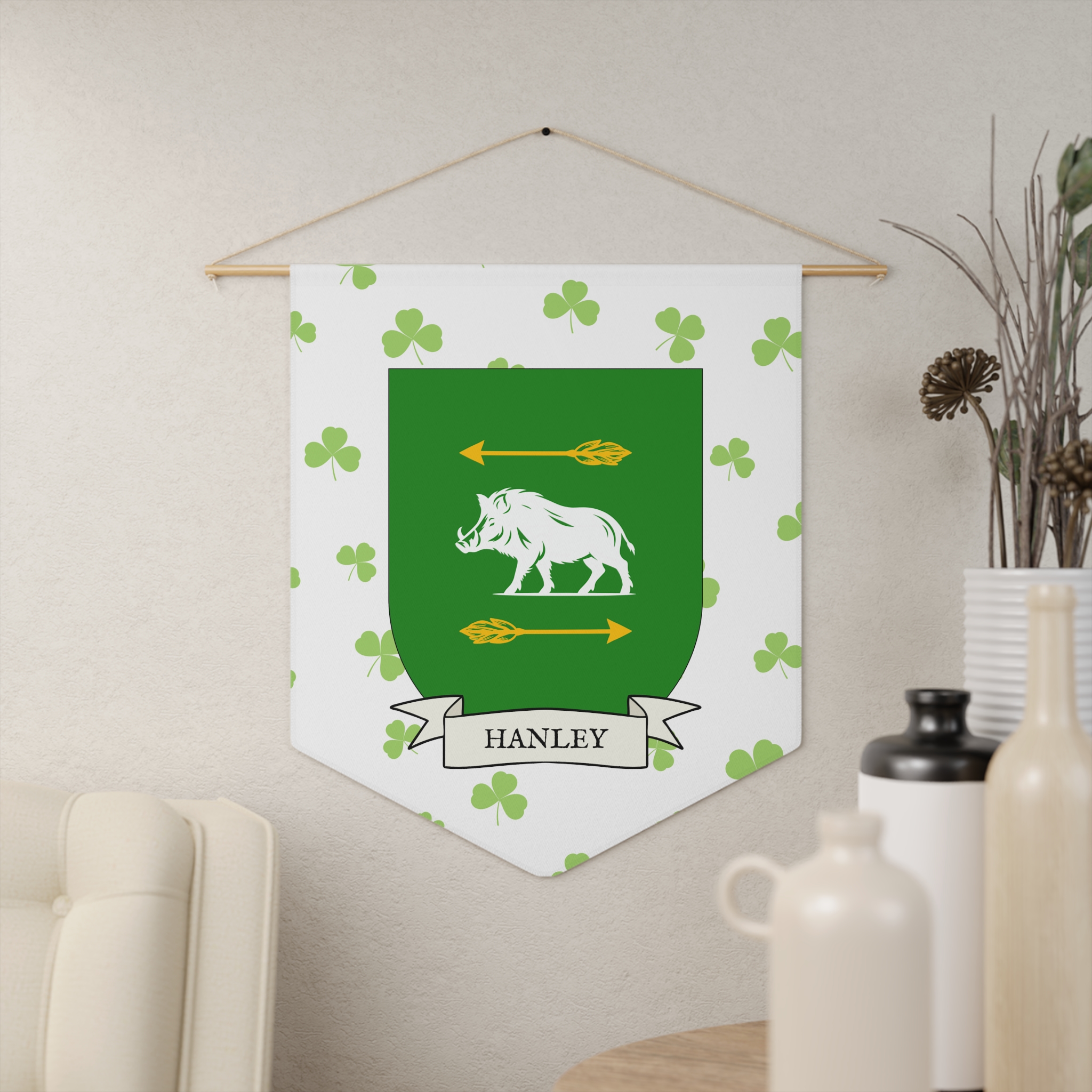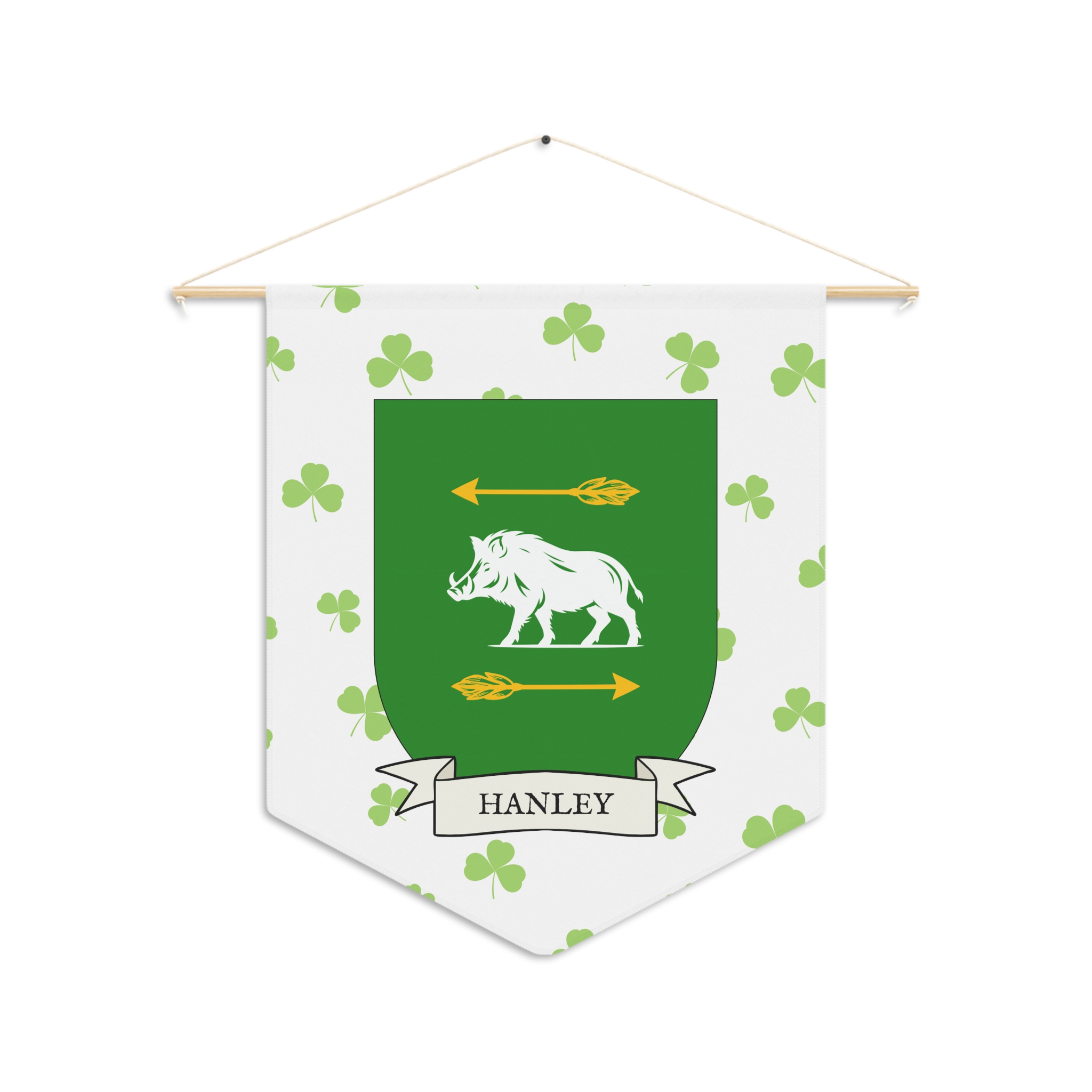 Uplift any room and show off your Irish American roots with this Hanley Family Coat of Arms Indoor Pennant. Pennant is printed on durable poly twill and comes with a wooden dowel/twine frame for easy hanging. Features your family Coat of Arms printed over a restrained shamrock patterned background.