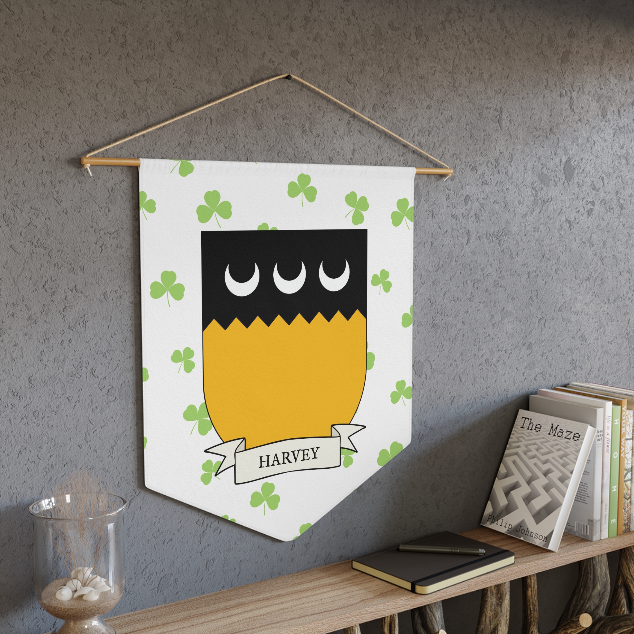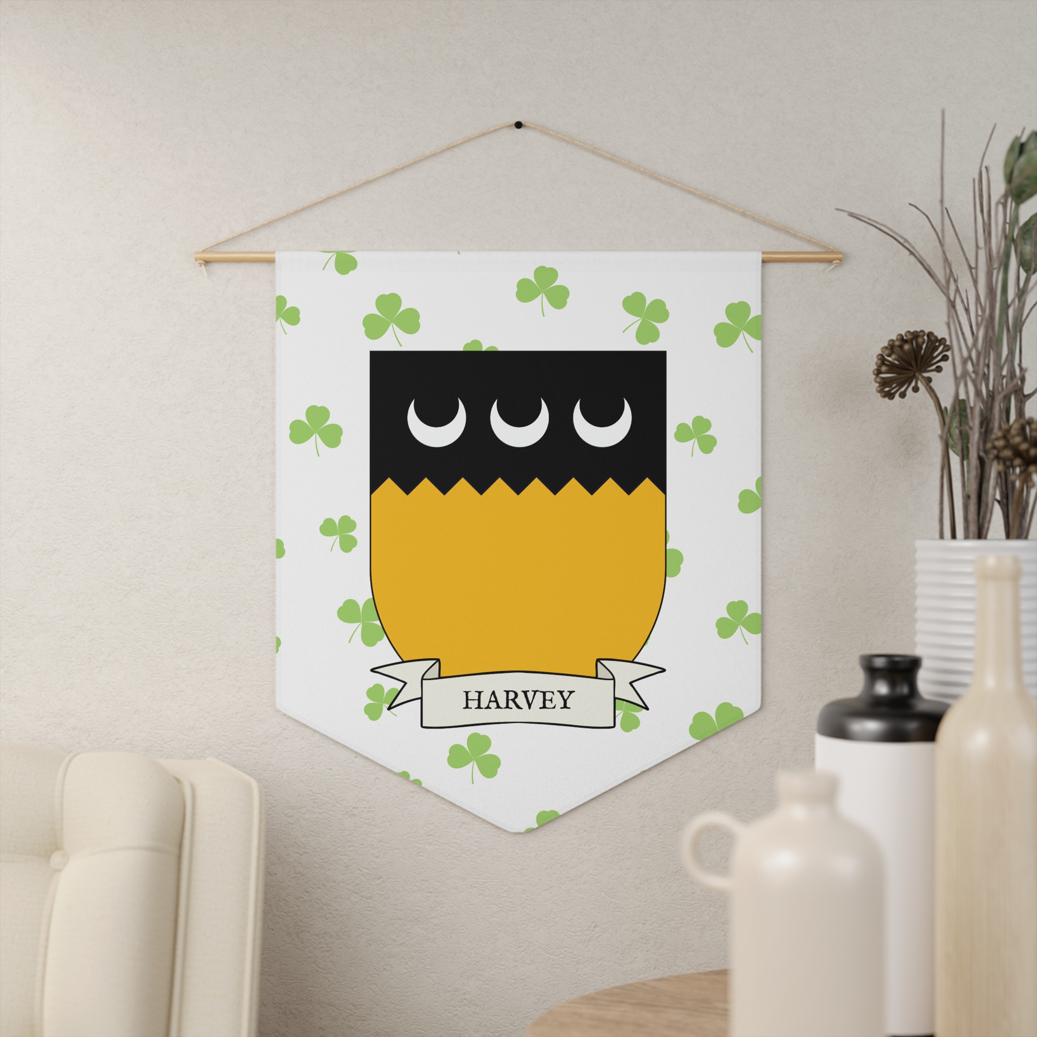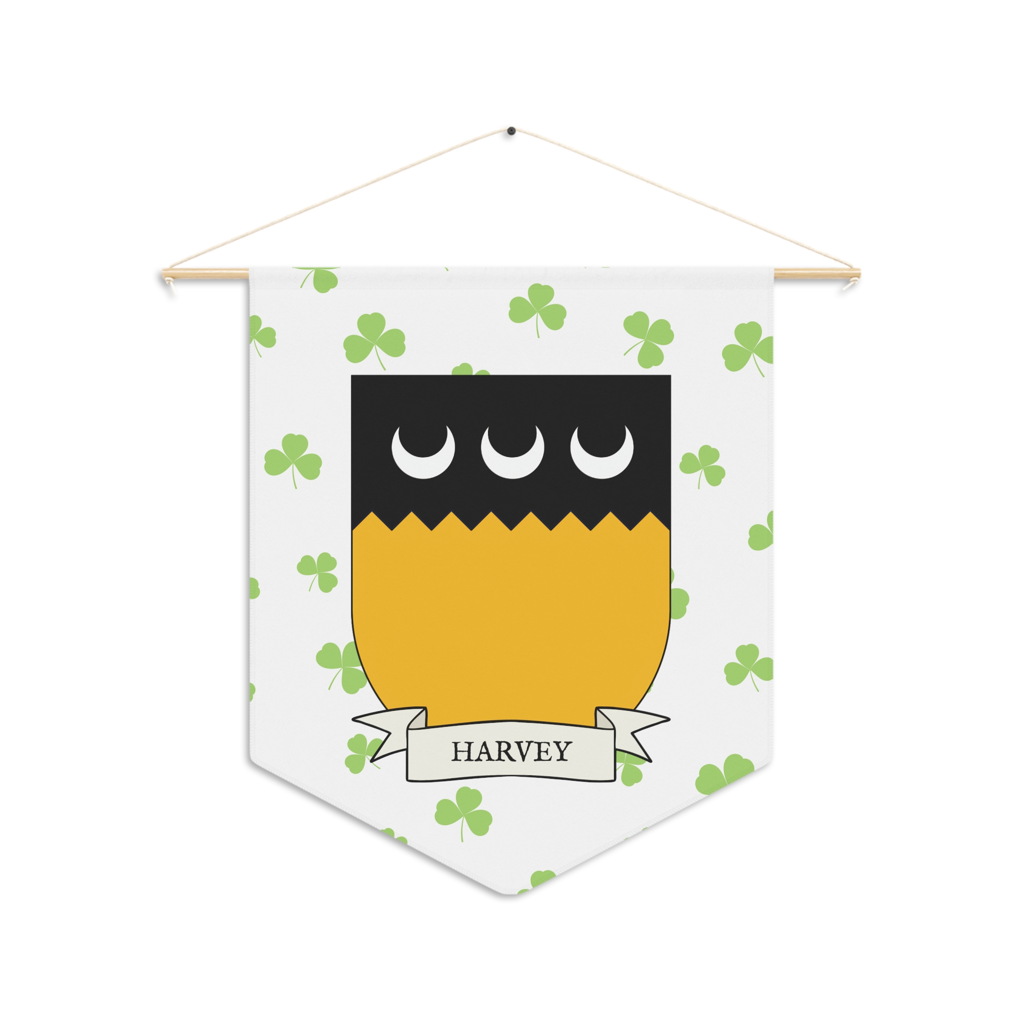 Uplift any room and show off your Irish American roots with this Harvey Family Coat of Arms Indoor Pennant. Pennant is printed on durable poly twill and comes with a wooden dowel/twine frame for easy hanging. Features your family Coat of Arms printed over a restrained shamrock patterned background.