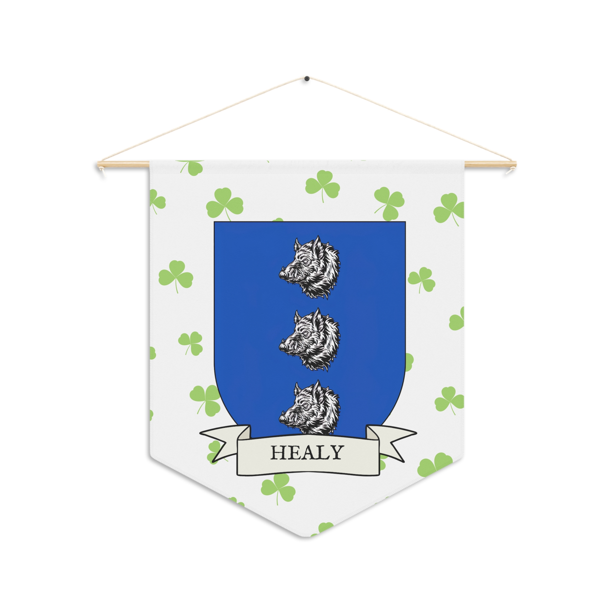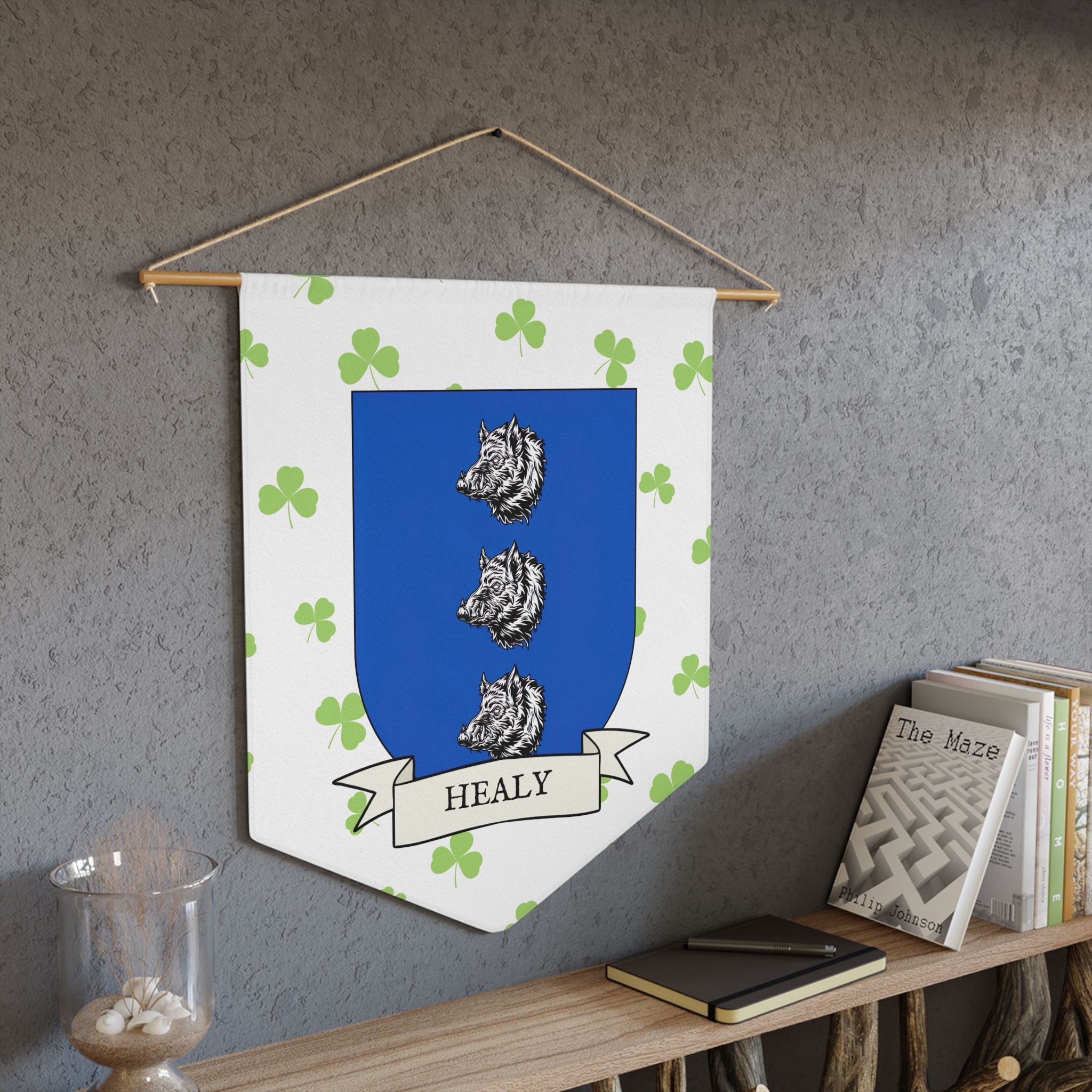 Uplift any room and show off your Irish American roots with this Healy Family Coat of Arms Indoor Pennant. Pennant is printed on durable poly twill and comes with a wooden dowel/twine frame for easy hanging. Features your family Coat of Arms printed over a restrained shamrock patterned background.