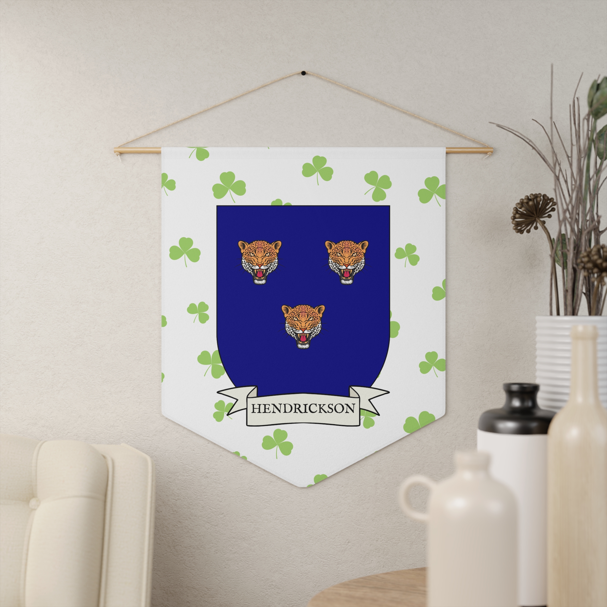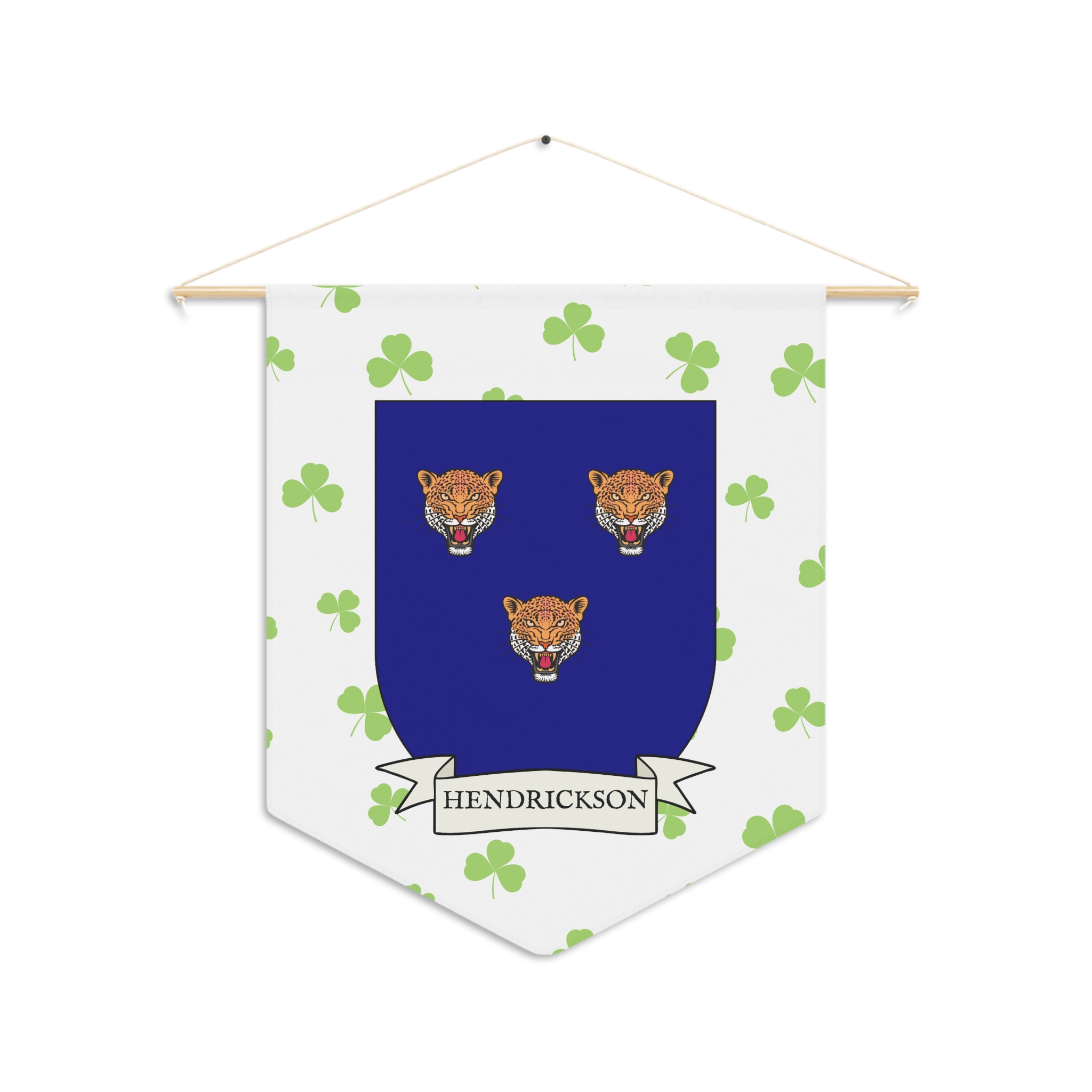 Uplift any room and show off your Irish American roots with this Hendrickson Family Coat of Arms Indoor Pennant. Pennant is printed on durable poly twill and comes with a wooden dowel/twine frame for easy hanging. Features your family Coat of Arms printed over a restrained shamrock patterned background.