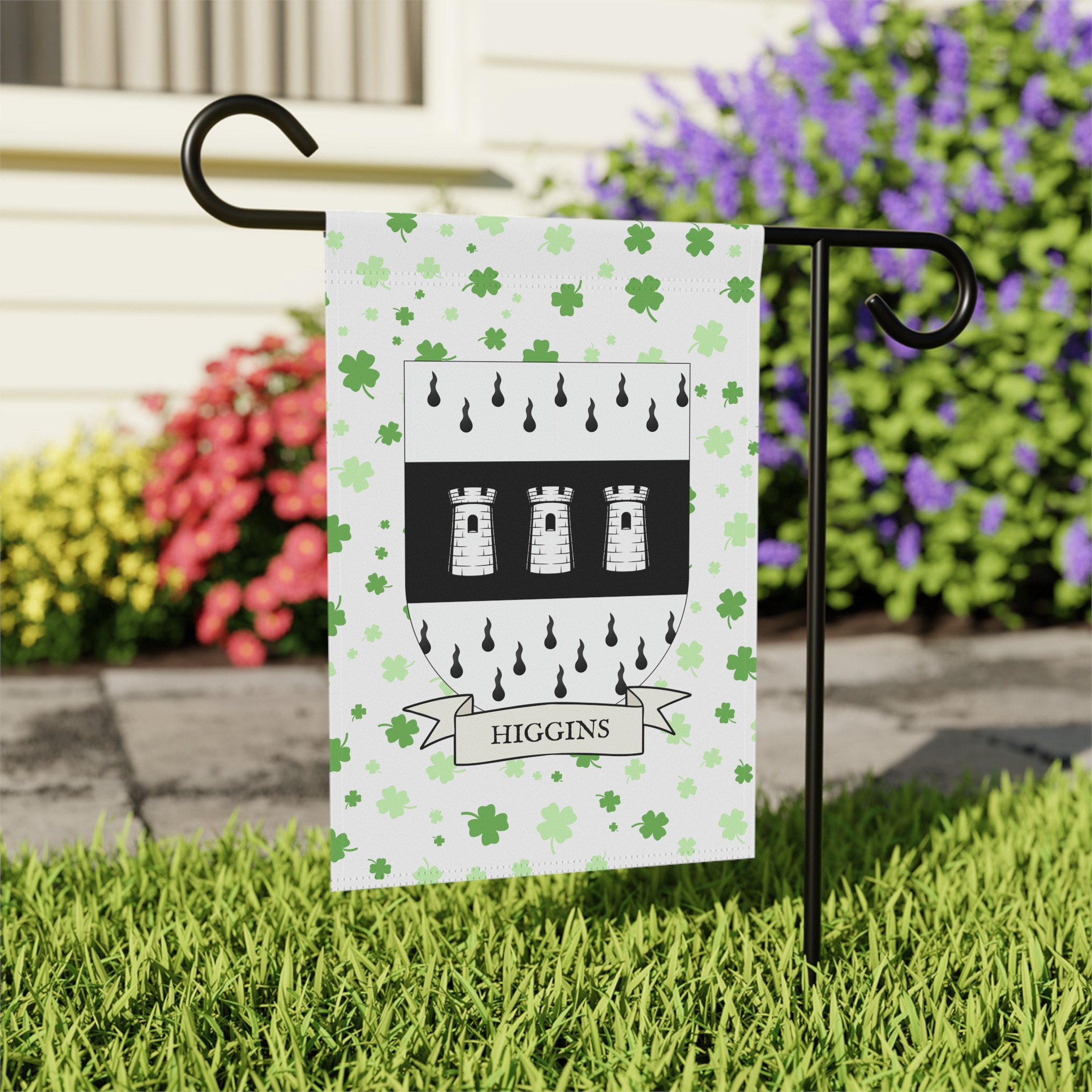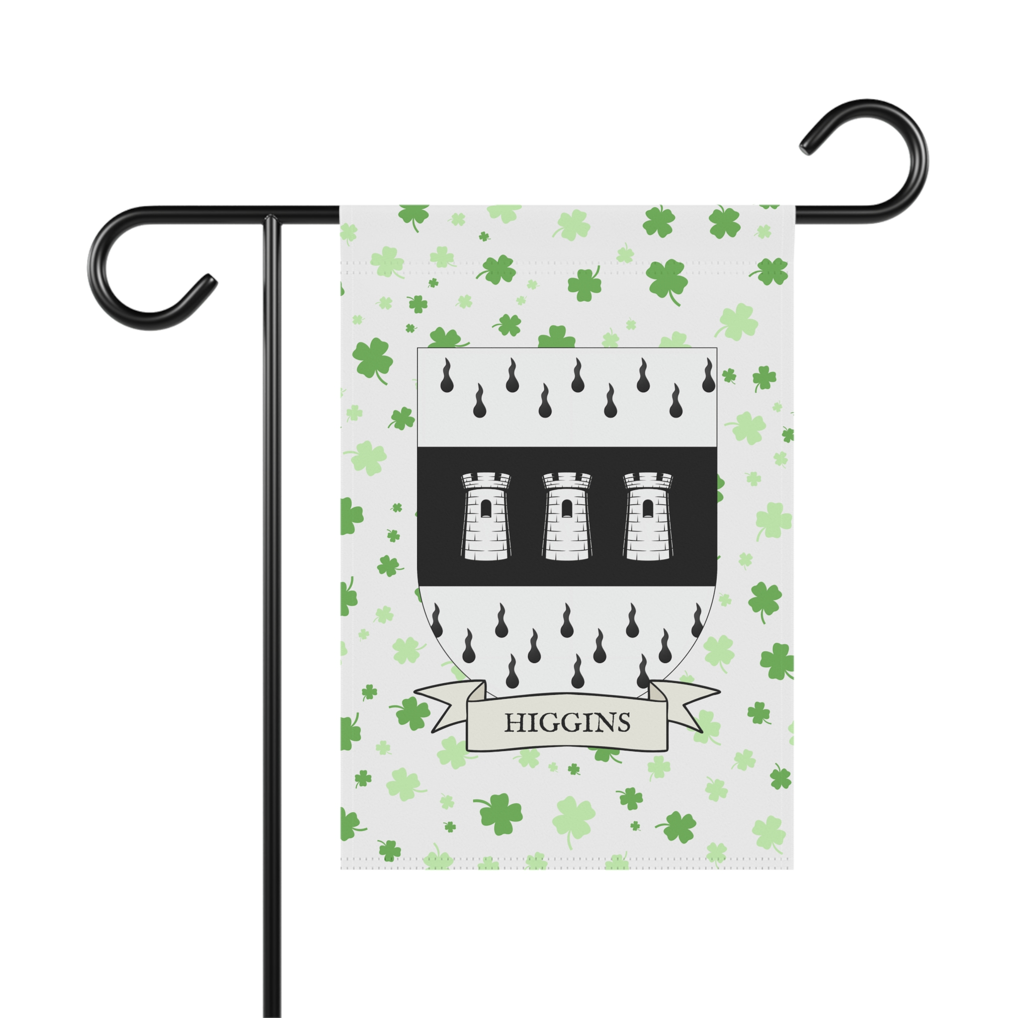 This welcoming Garden Banner will be a great addition to your garden or yard. It displays the Higgins Family Coat of Arms over a subtle background showing a field of four-leaf shamrocks. Both sides show identical images.