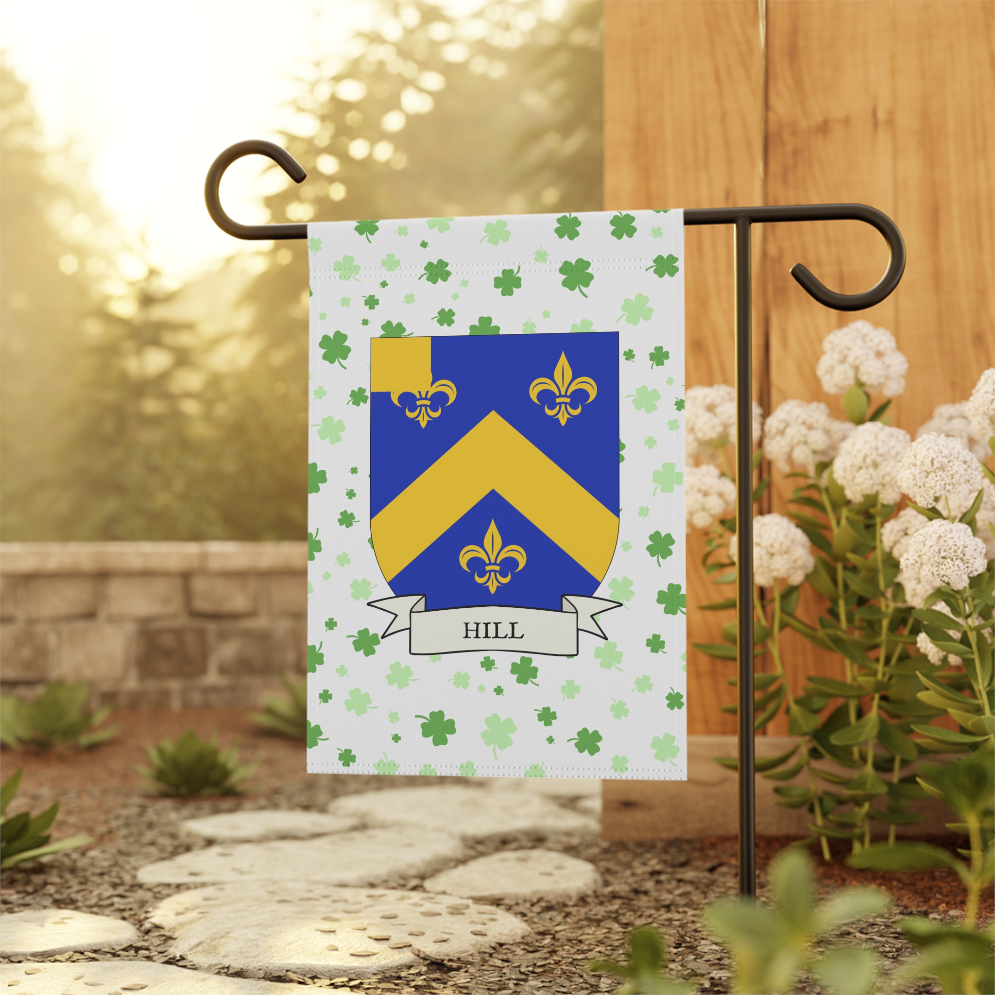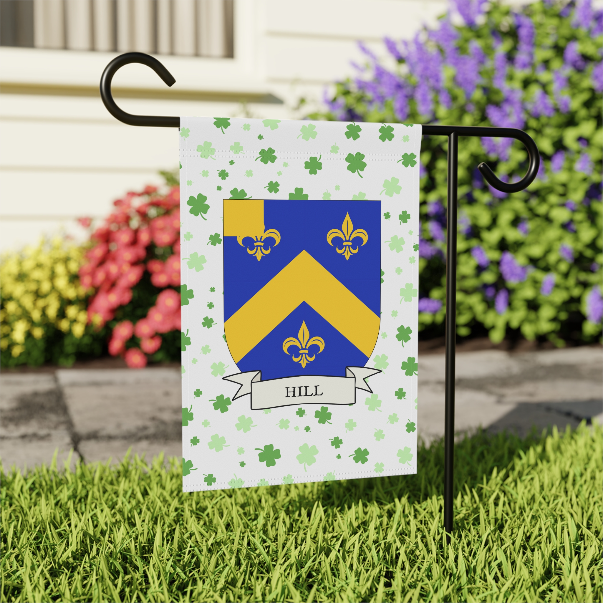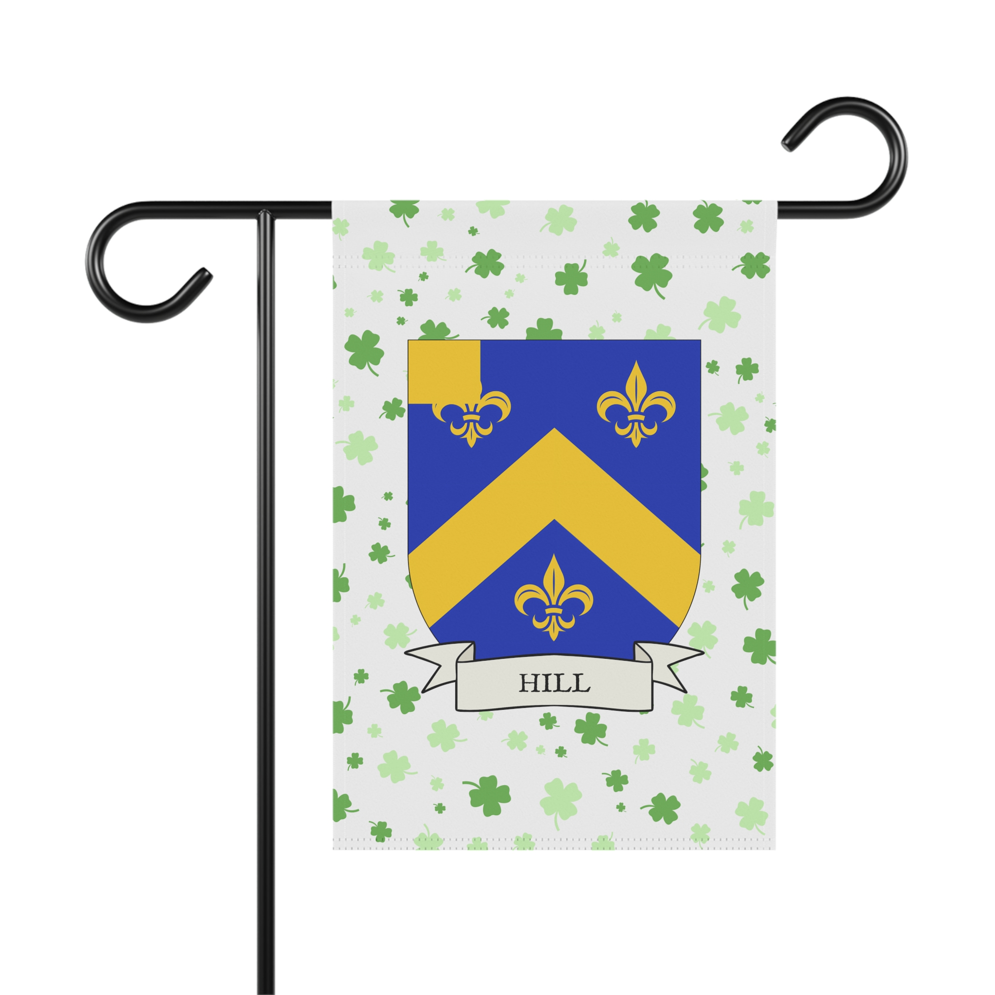 This welcoming Garden Banner will be a great addition to your garden or yard. It displays the Hill Family Coat of Arms over a subtle background showing a field of four-leaf shamrocks. Both sides show identical images.