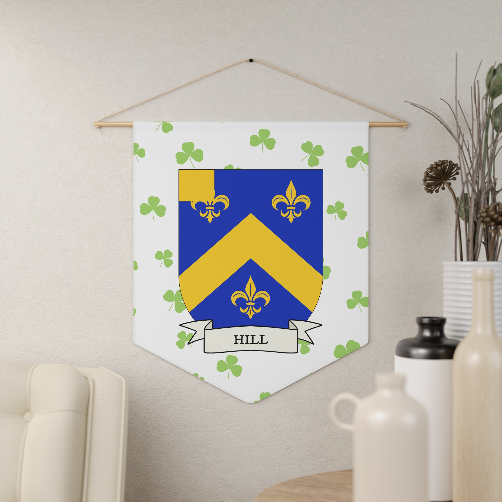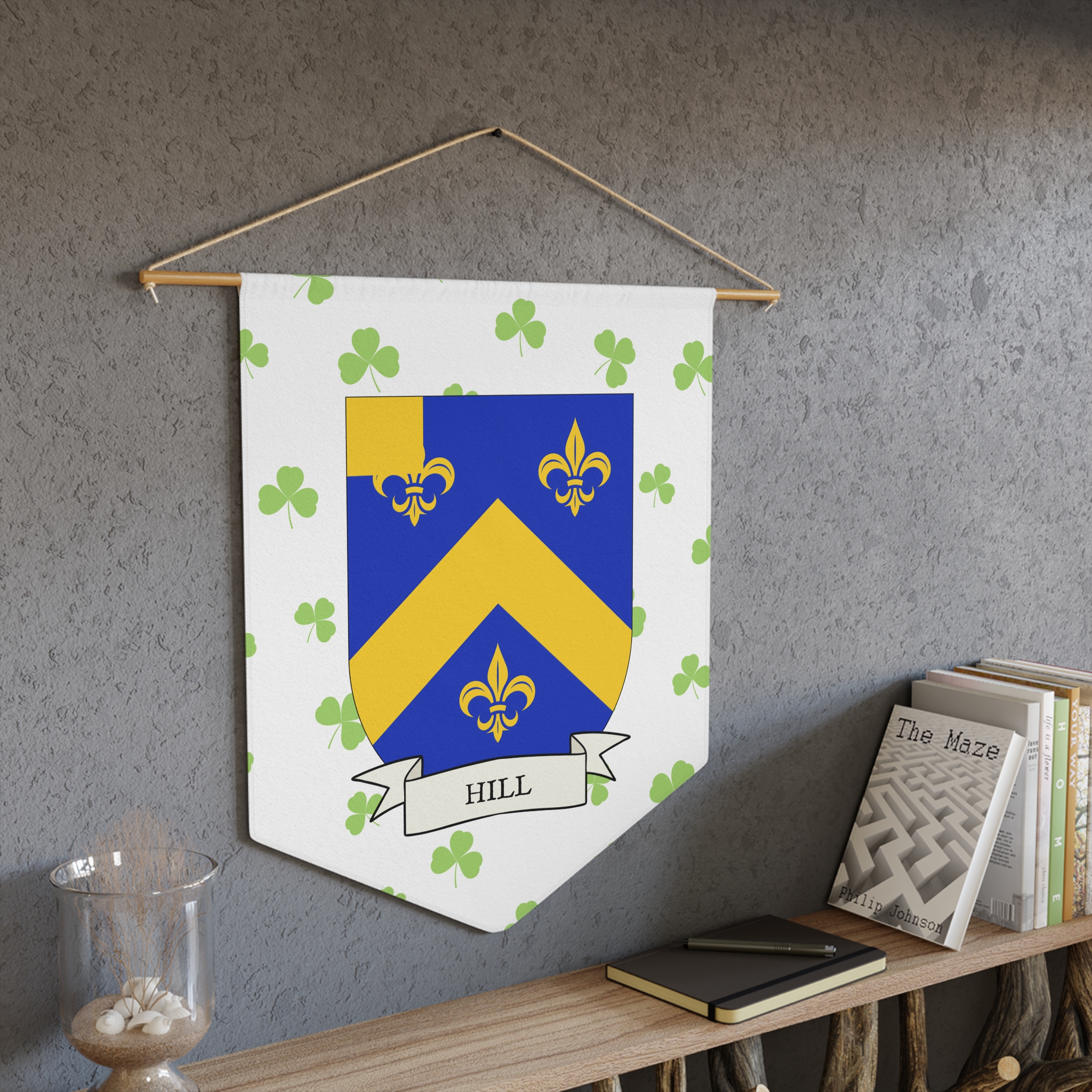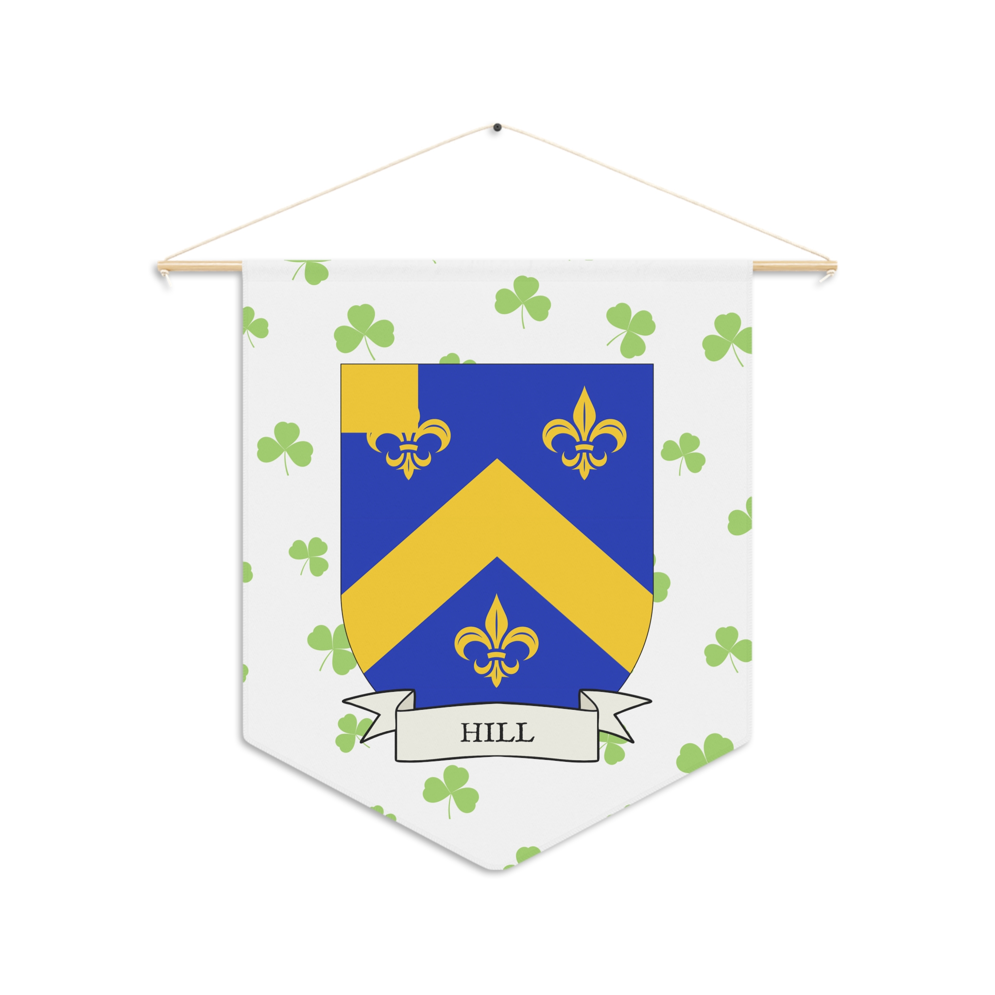 Uplift any room and show off your Irish American roots with this Hill Family Coat of Arms Indoor Pennant. Pennant is printed on durable poly twill and comes with a wooden dowel/twine frame for easy hanging. Features your family Coat of Arms printed over a restrained shamrock patterned background.