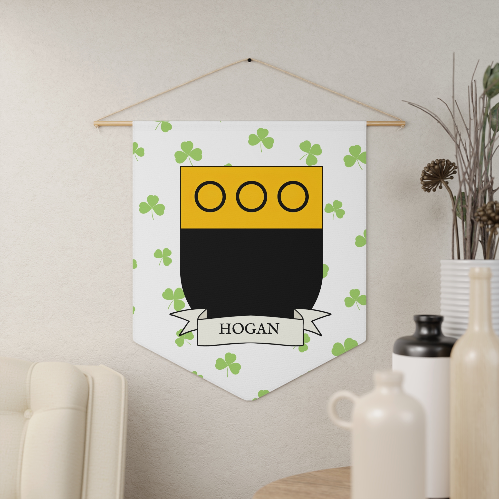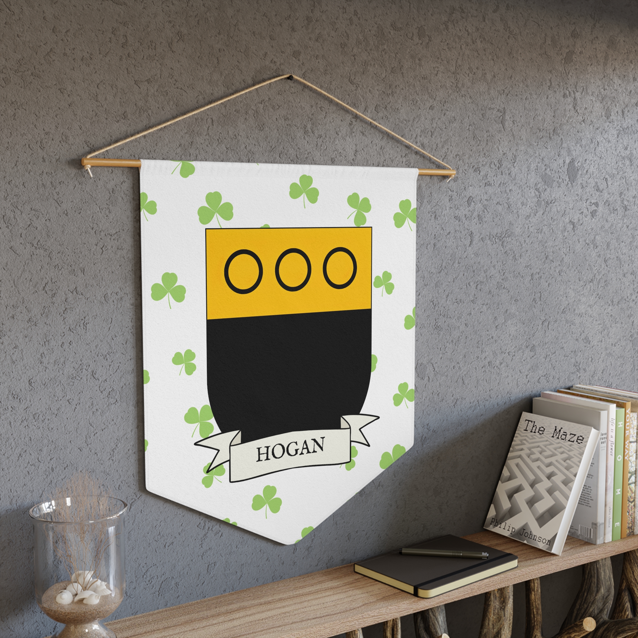 Uplift any room and show off your Irish American roots with this Hogan Family Coat of Arms Indoor Pennant. Pennant is printed on durable poly twill and comes with a wooden dowel/twine frame for easy hanging. Features your family Coat of Arms printed over a restrained shamrock patterned background.