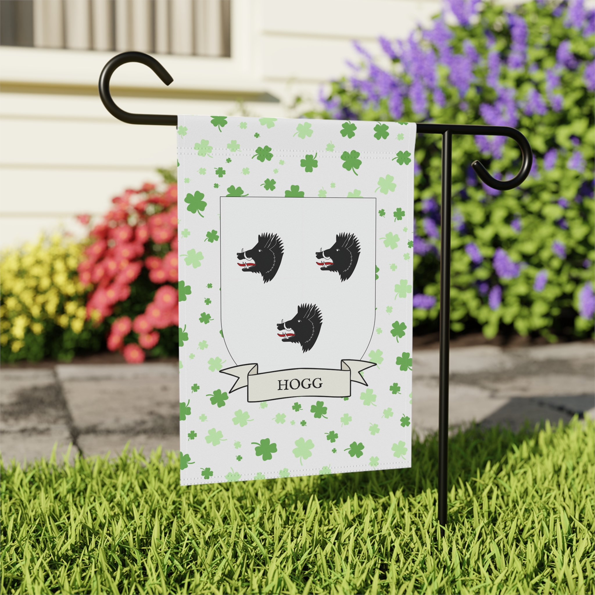 This welcoming Garden Banner will be a great addition to your garden or yard. It displays the Hogg Family Coat of Arms over a subtle background showing a field of four-leaf shamrocks. Both sides show identical images.