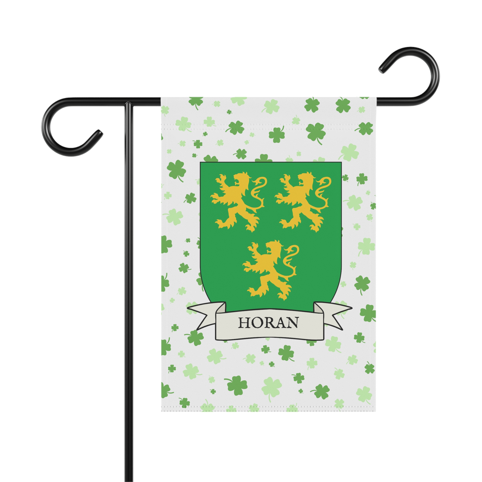This welcoming Garden Banner will be a great addition to your garden or yard. It displays the Horan Family Coat of Arms over a subtle background showing a field of four-leaf shamrocks. Both sides show identical images.