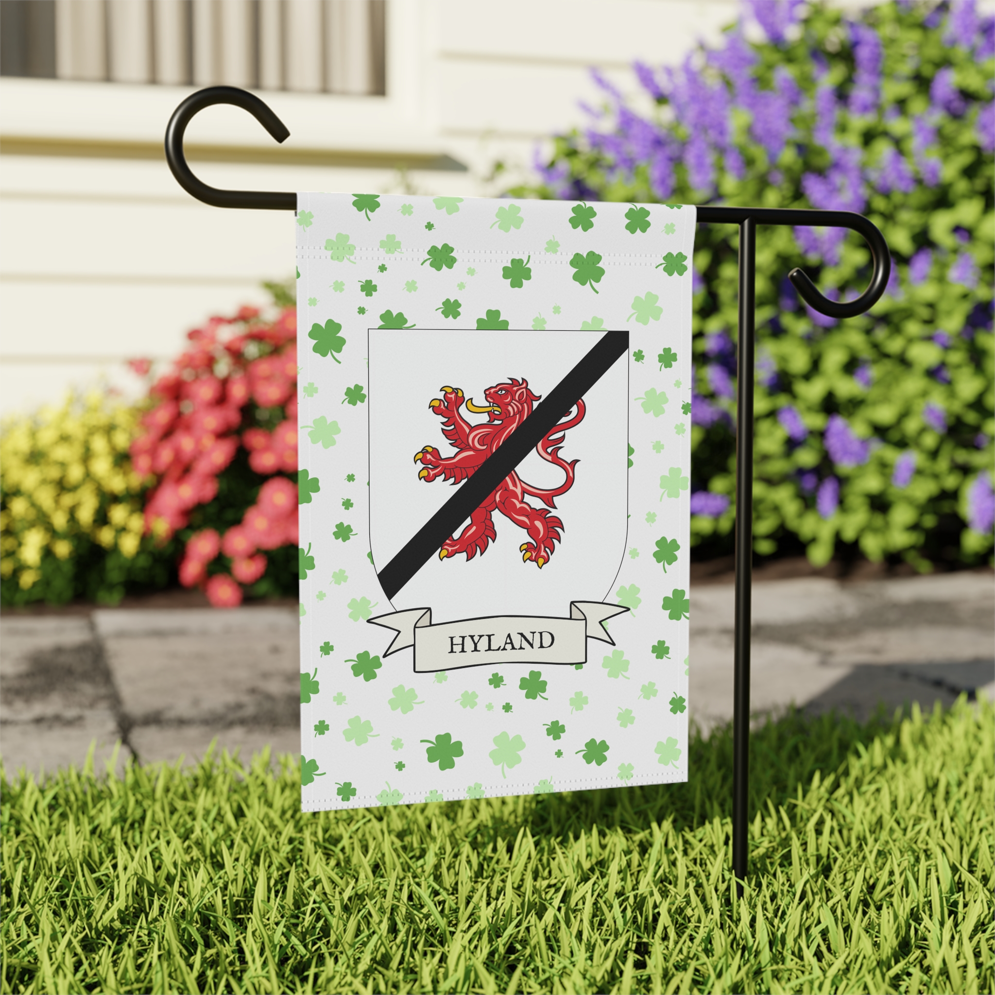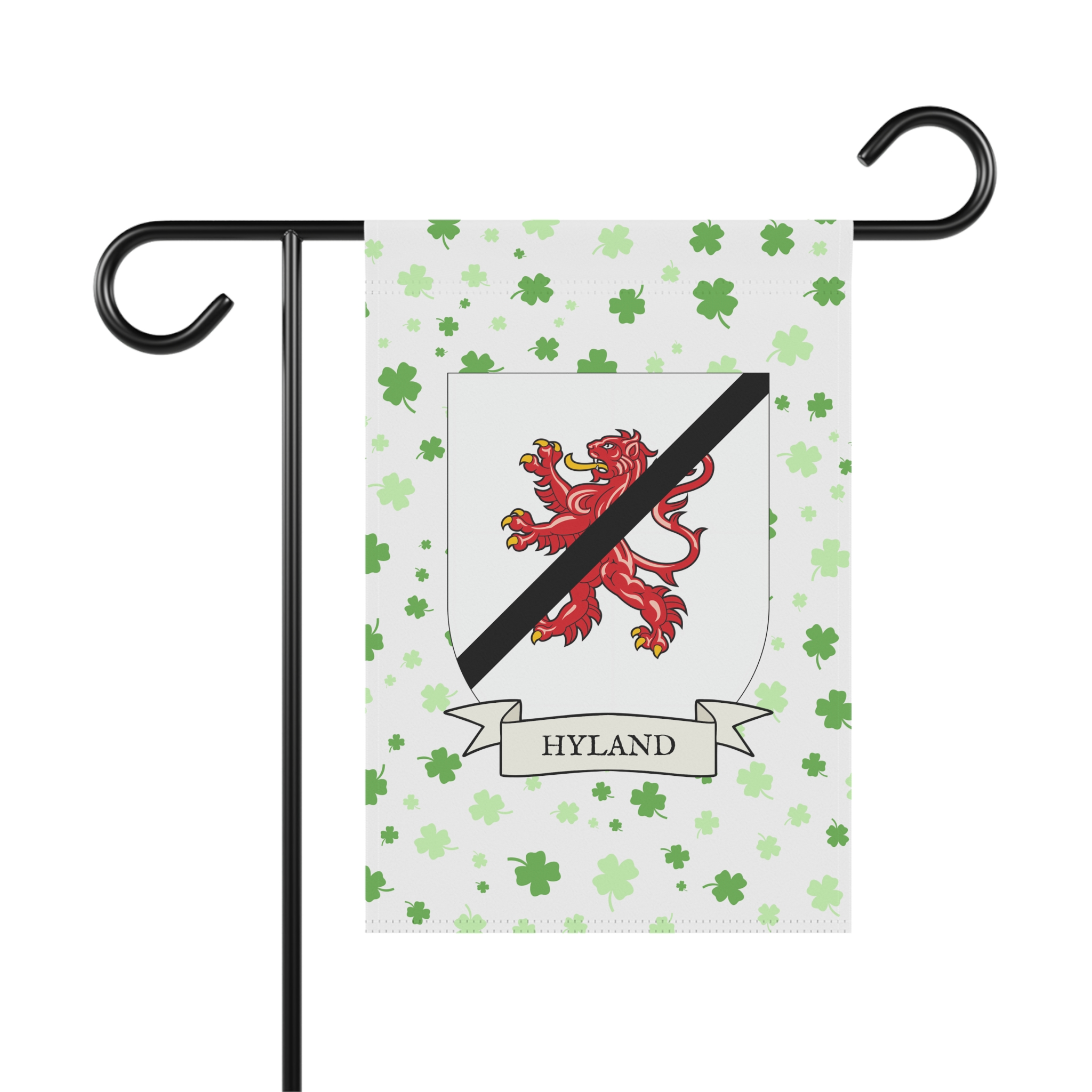This welcoming Garden Banner will be a great addition to your garden or yard. It displays the Hyland Family Coat of Arms over a subtle background showing a field of four-leaf shamrocks. Both sides show identical images.