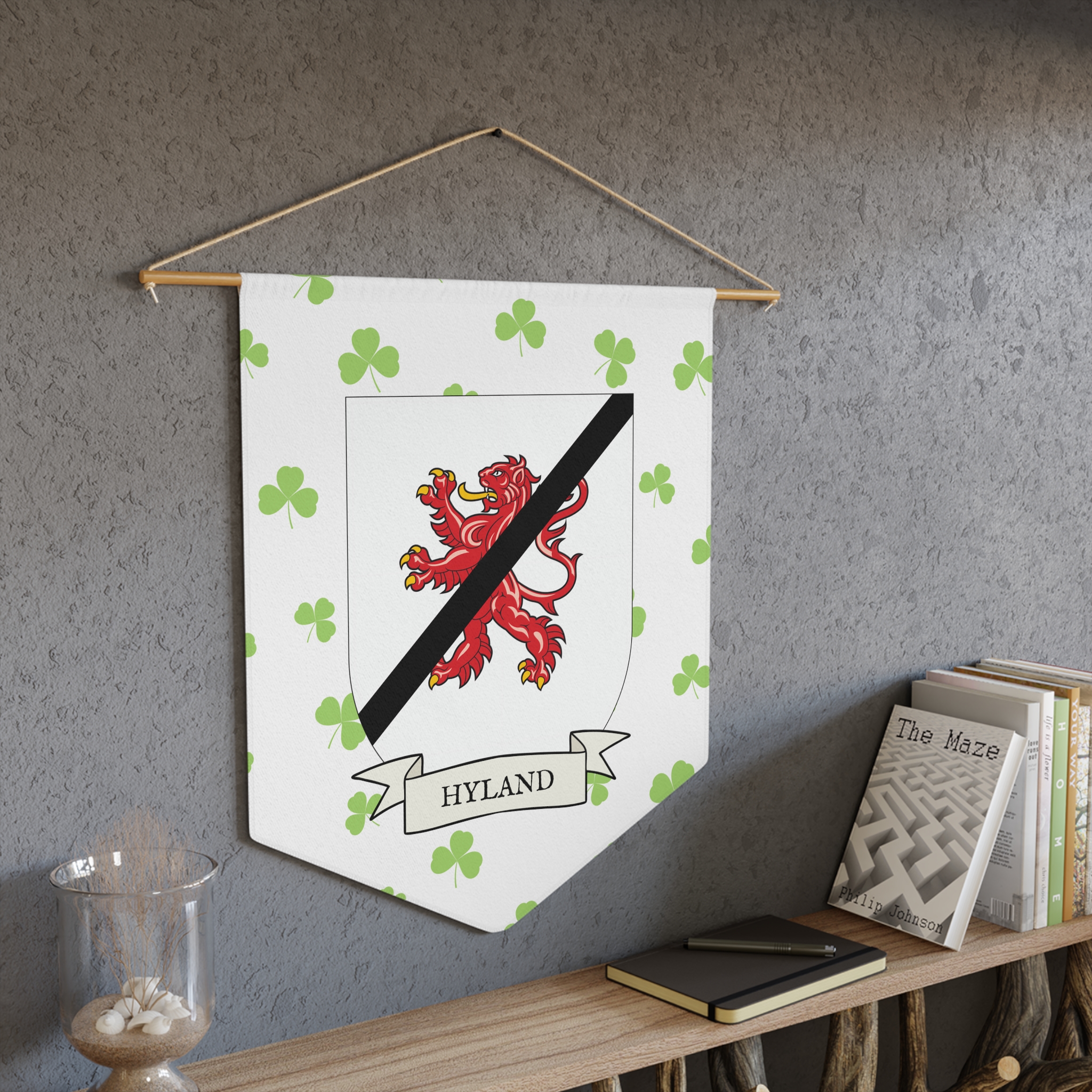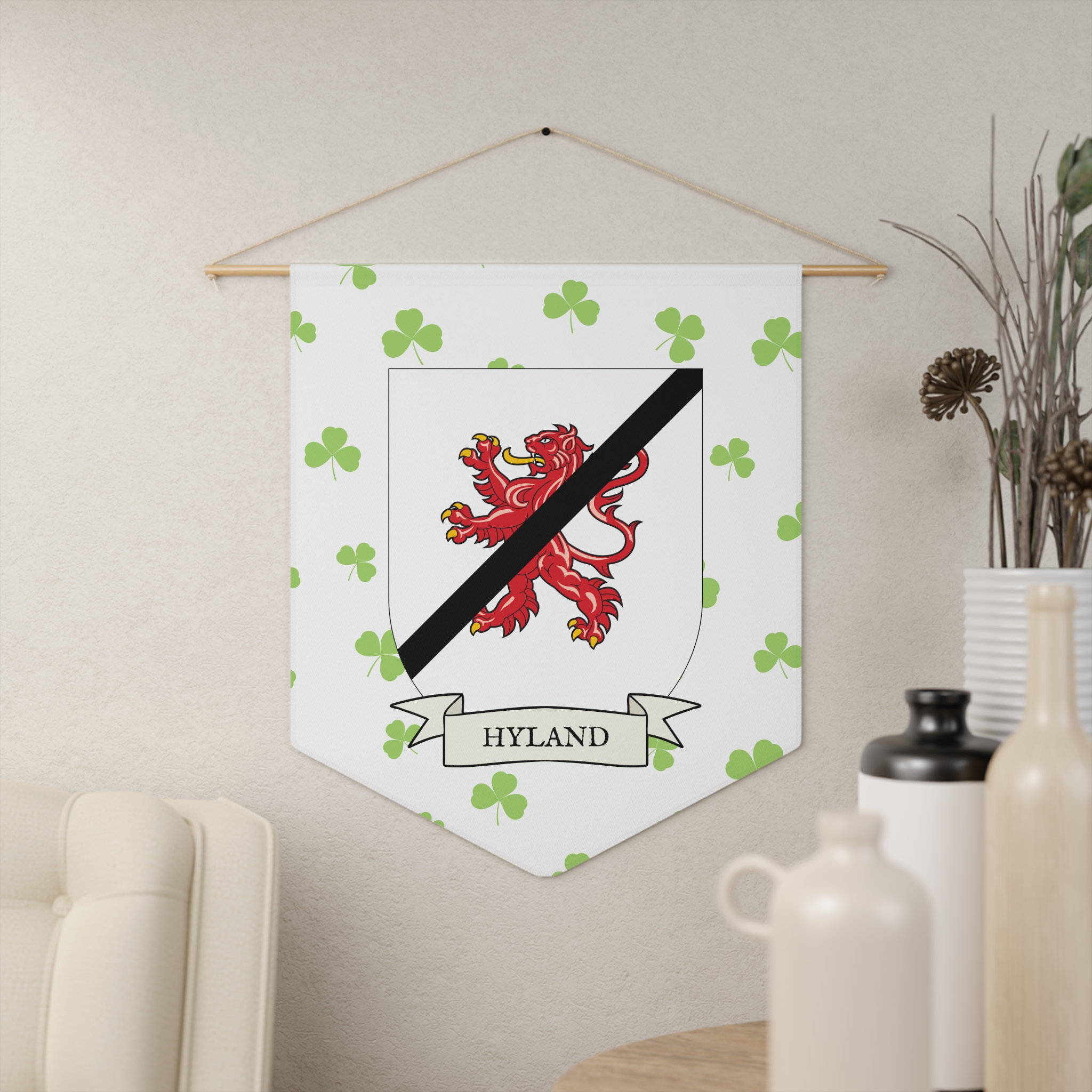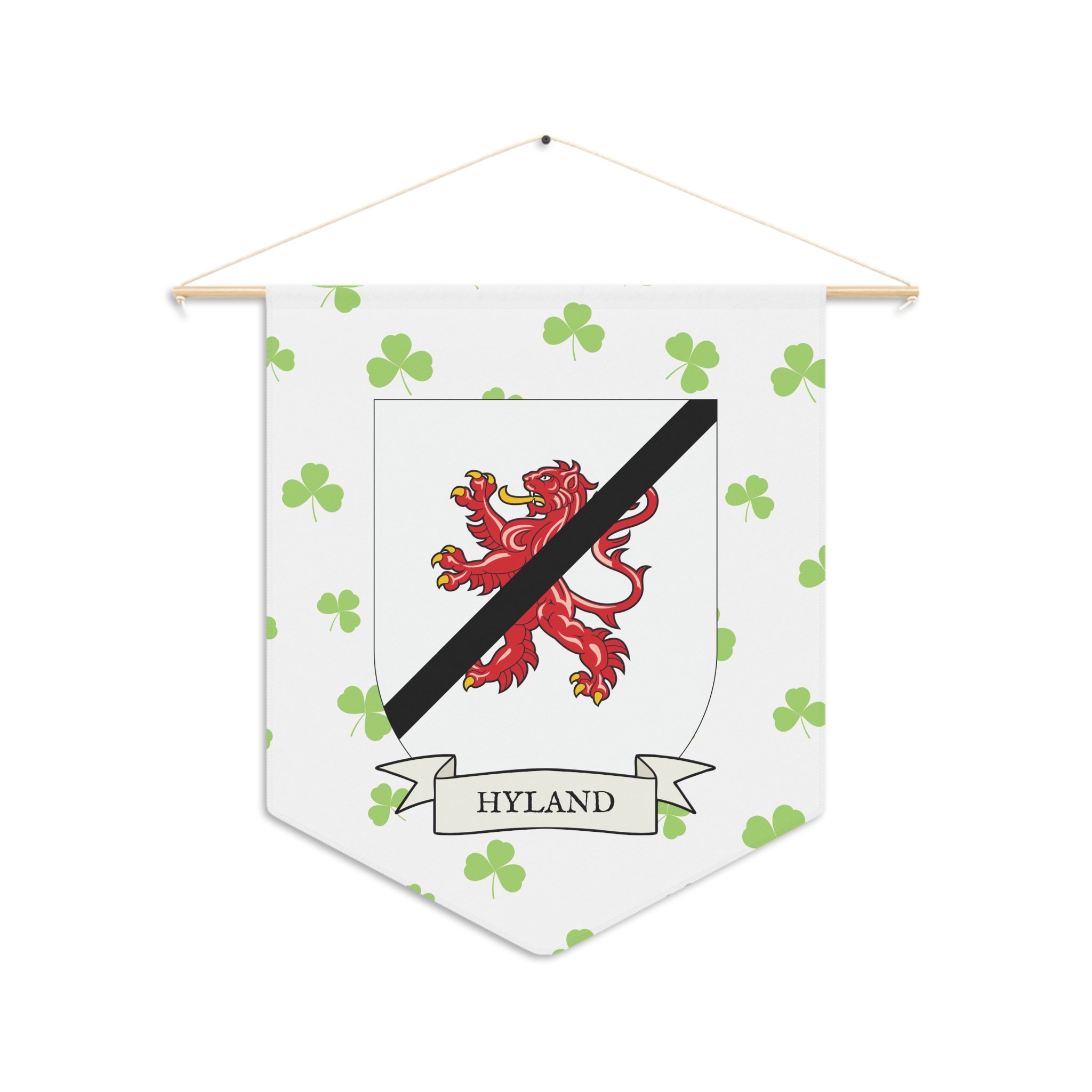 Uplift any room and show off your Irish American roots with this Hyland Family Coat of Arms Indoor Pennant. Pennant is printed on durable poly twill and comes with a wooden dowel/twine frame for easy hanging. Features your family Coat of Arms printed over a restrained shamrock patterned background.