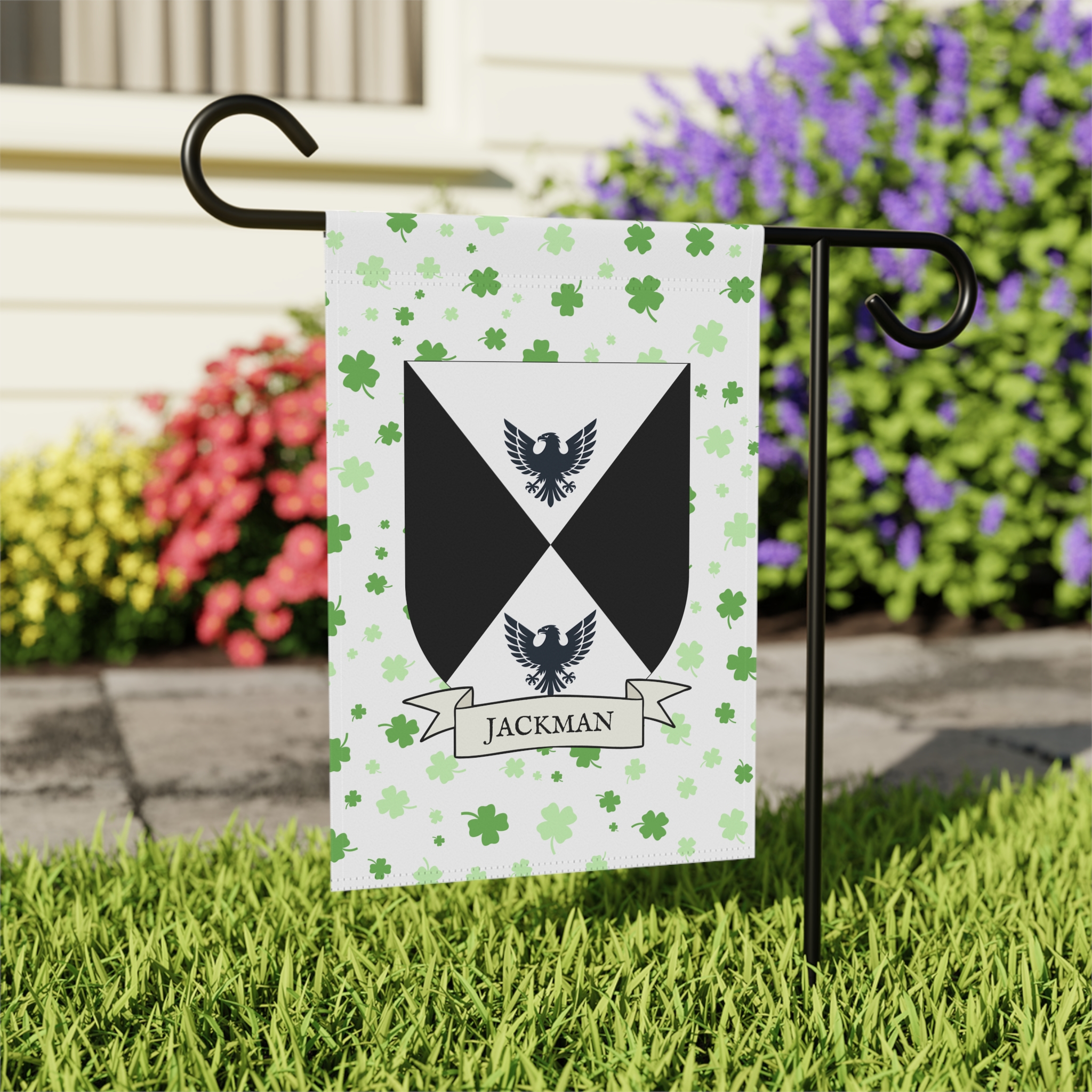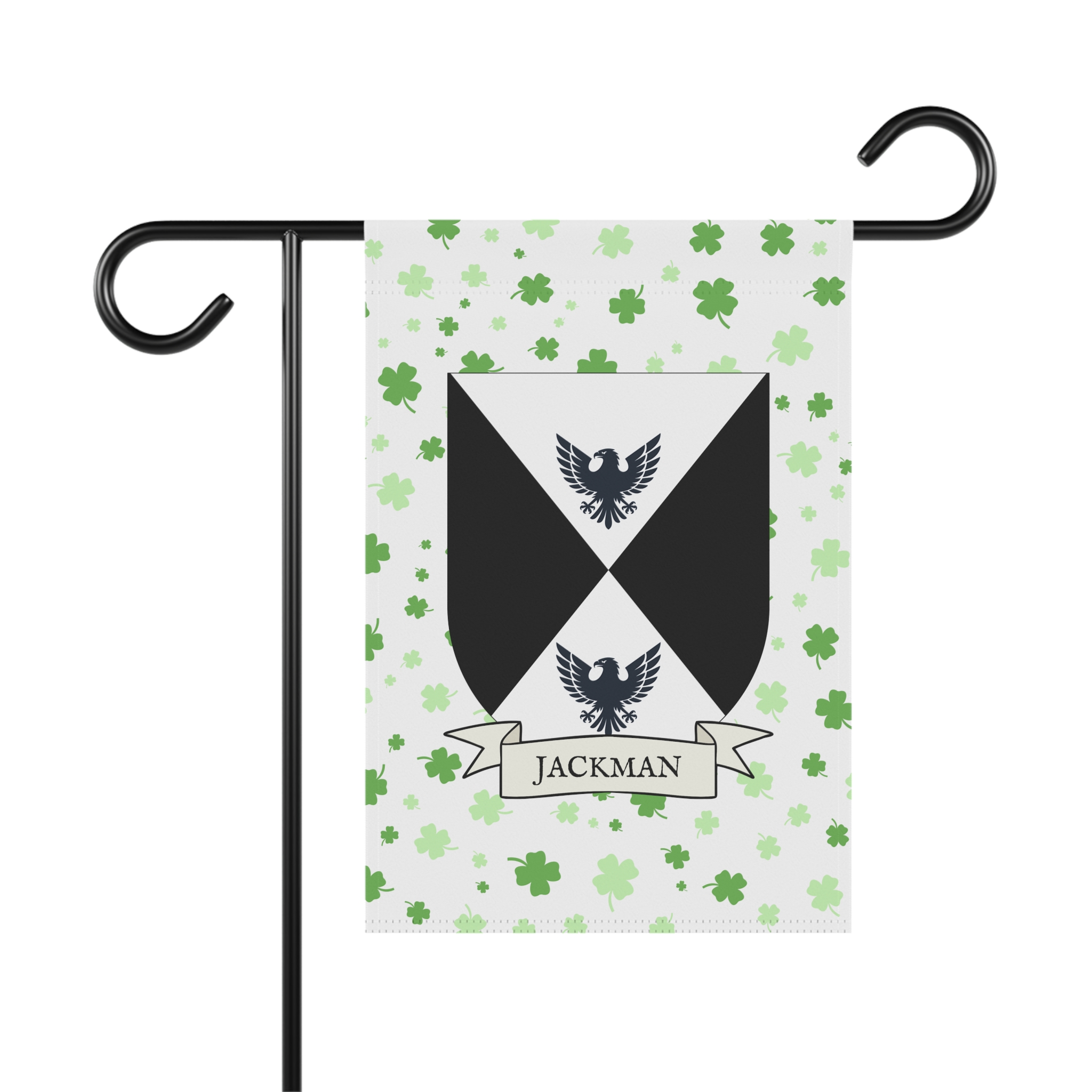 This welcoming Garden Banner will be a great addition to your garden or yard. It displays the Jackman Family Coat of Arms over a subtle background showing a field of four-leaf shamrocks. Both sides show identical images.