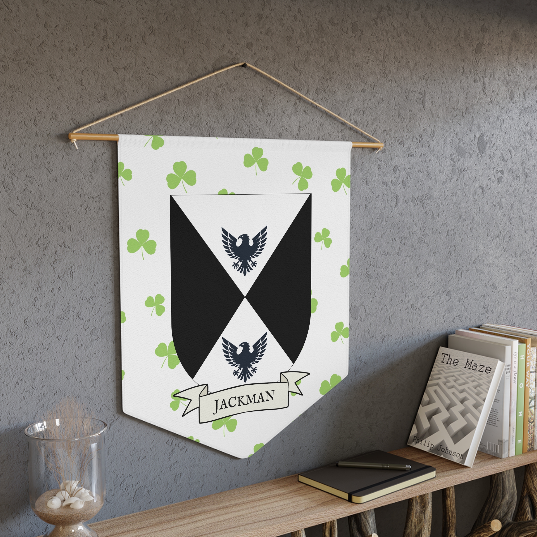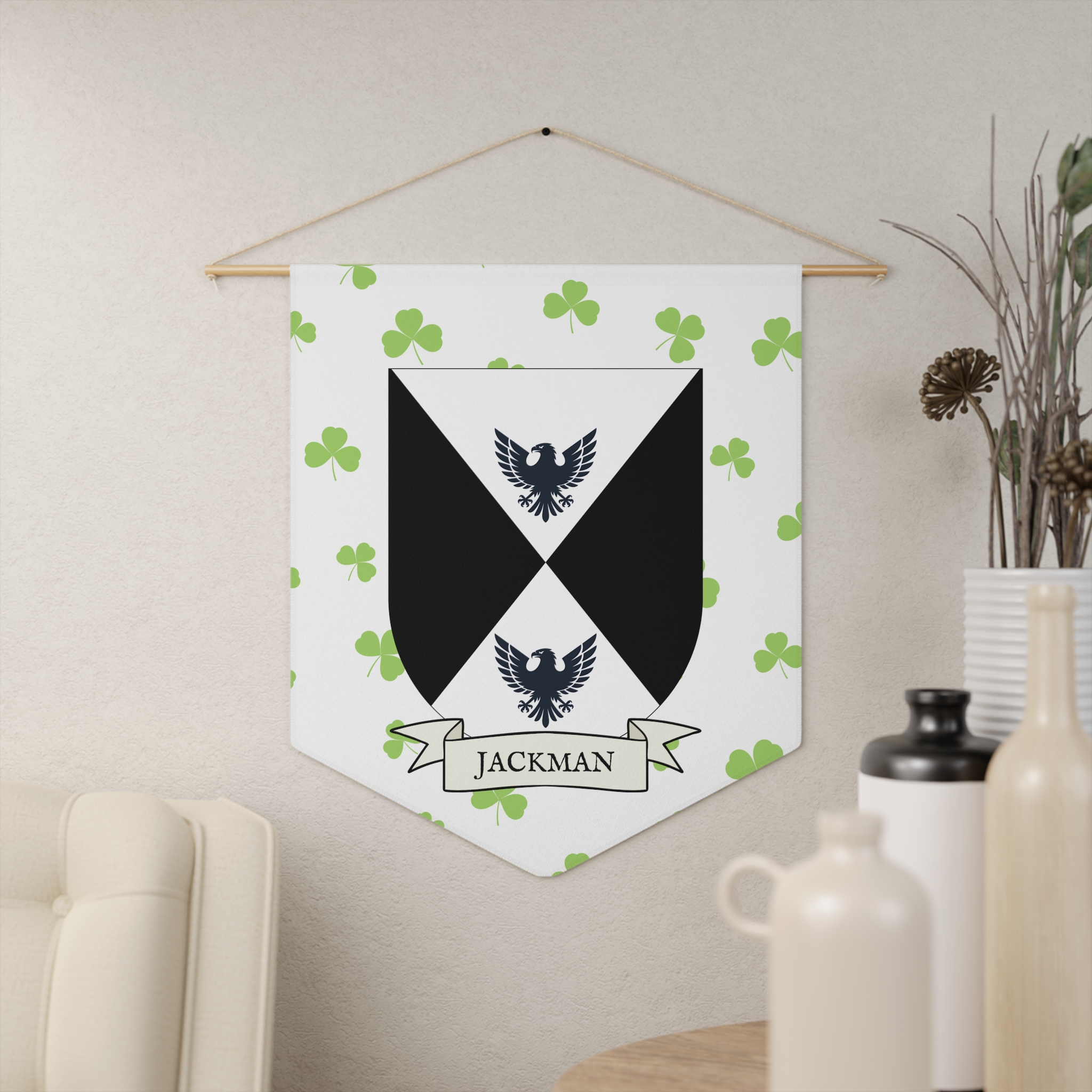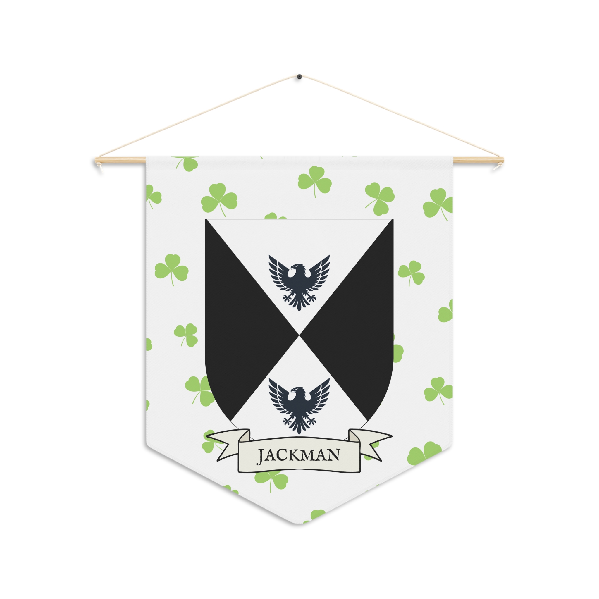 Uplift any room and show off your Irish American roots with this Jackman Family Coat of Arms Indoor Pennant. Pennant is printed on durable poly twill and comes with a wooden dowel/twine frame for easy hanging. Features your family Coat of Arms printed over a restrained shamrock patterned background.