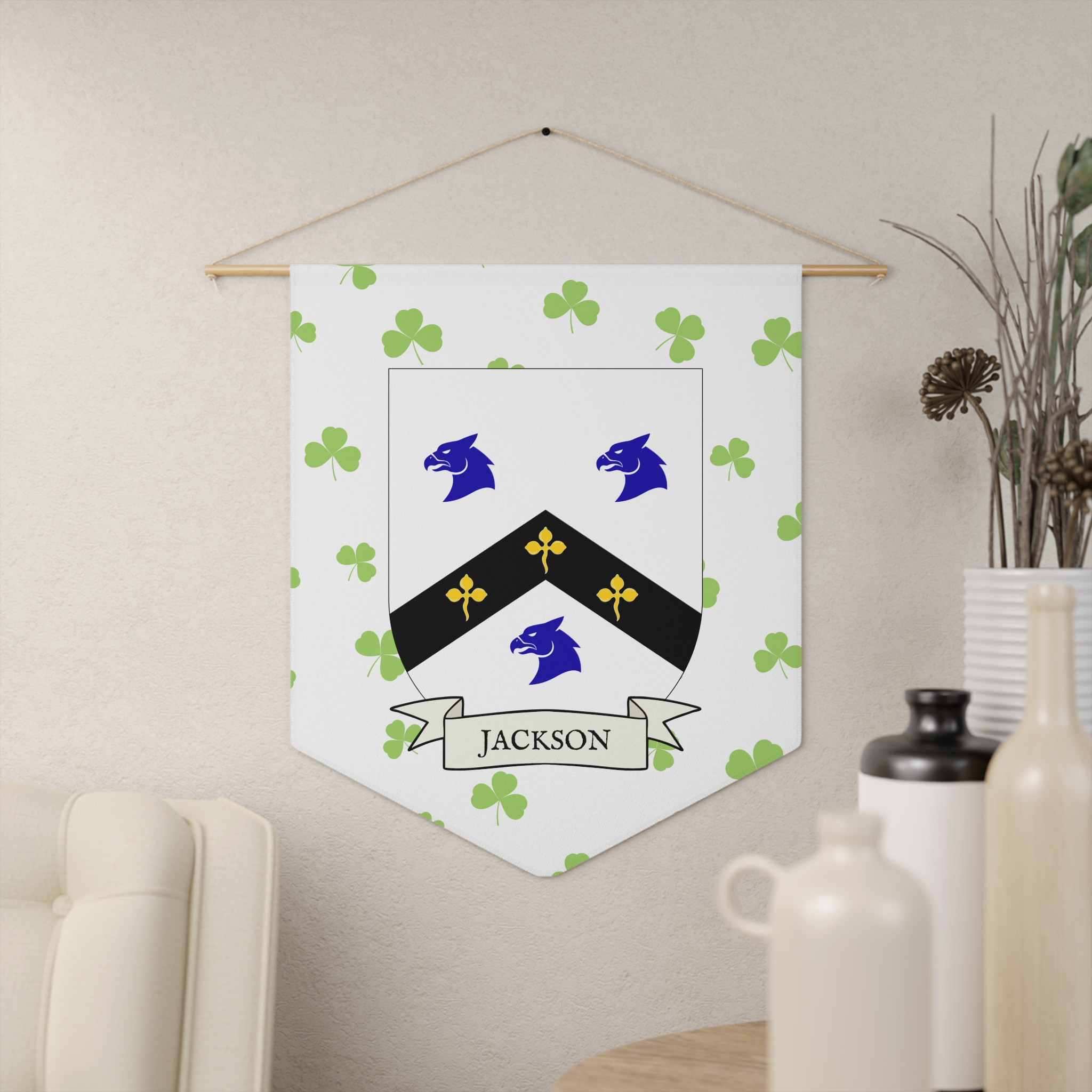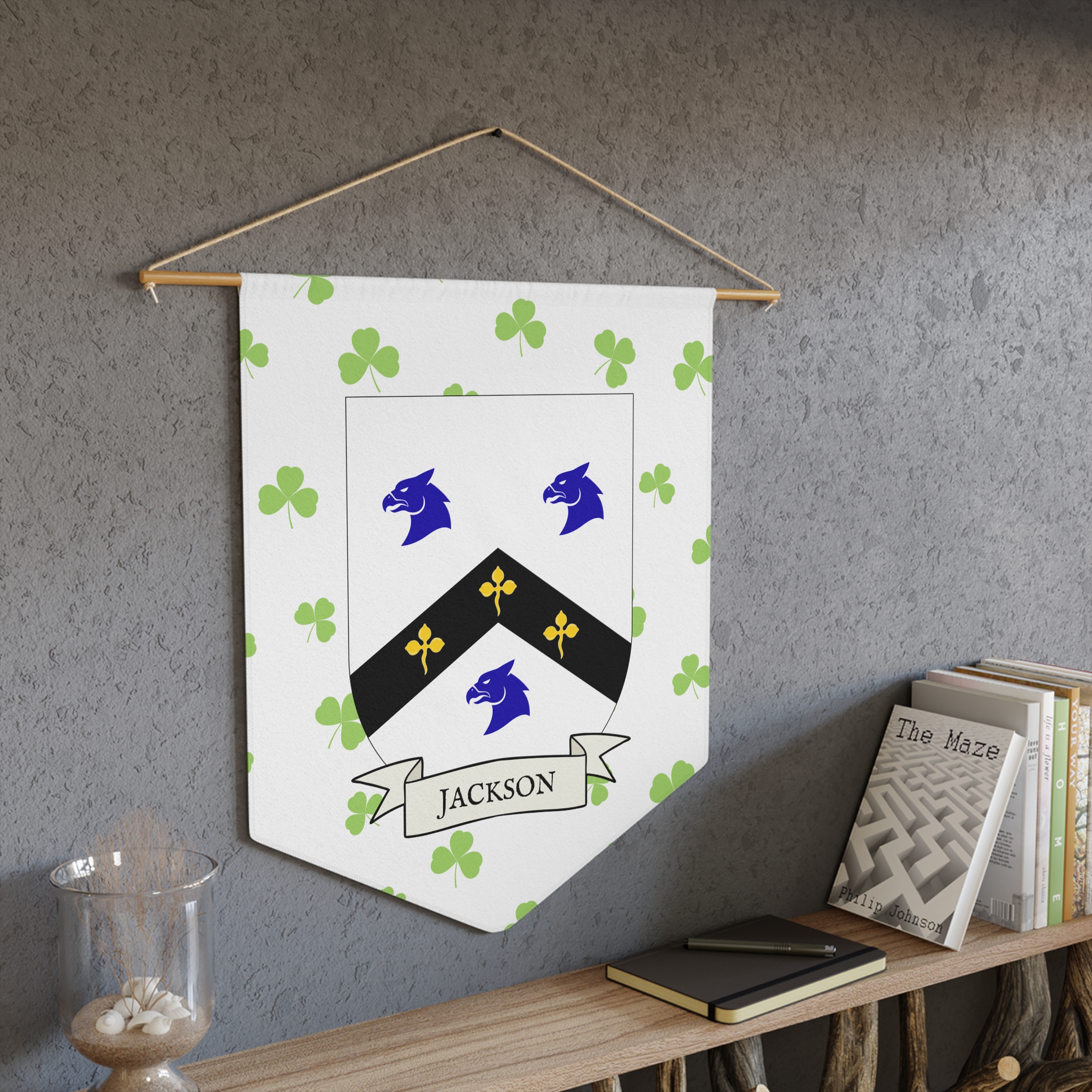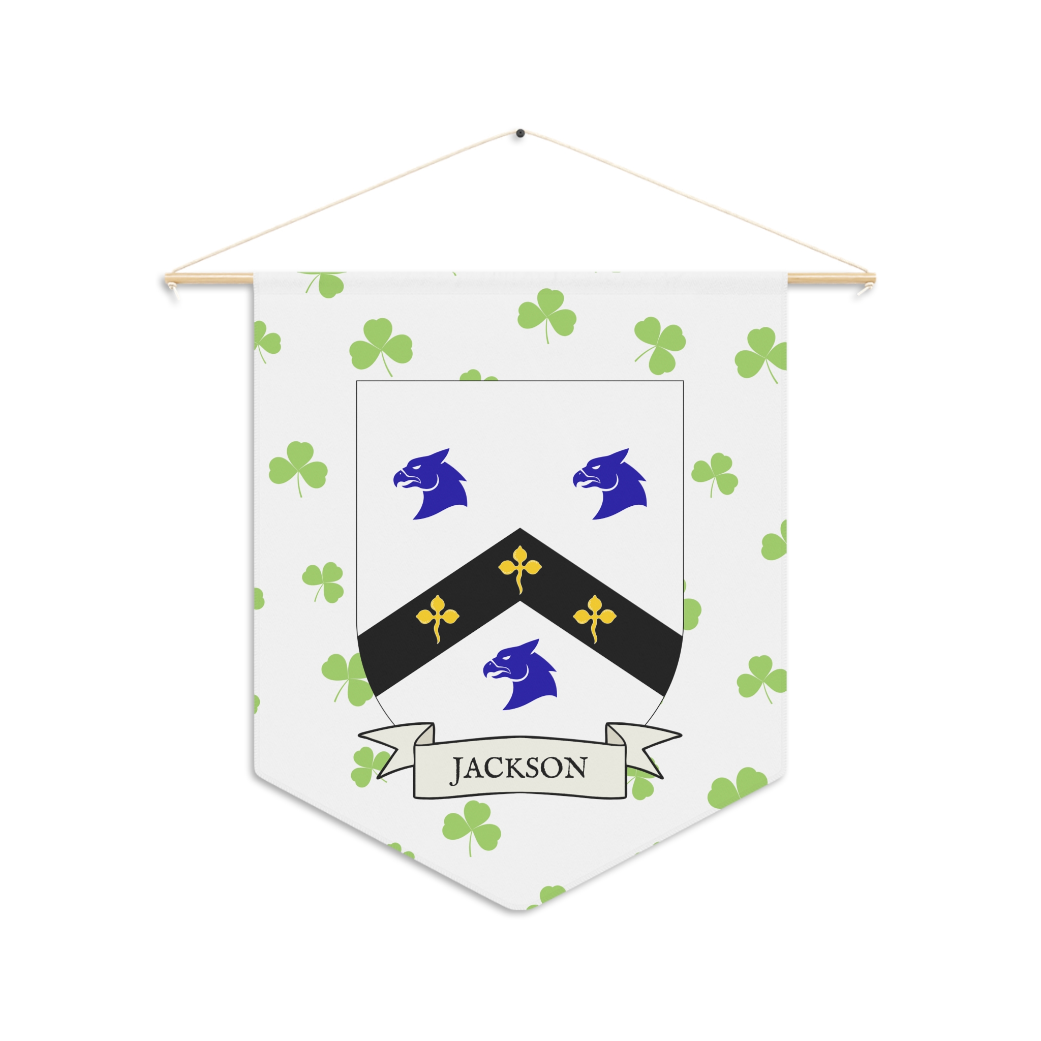 Uplift any room and show off your Irish American roots with this Jackson Family Coat of Arms Indoor Pennant. Pennant is printed on durable poly twill and comes with a wooden dowel/twine frame for easy hanging. Features your family Coat of Arms printed over a restrained shamrock patterned background.
