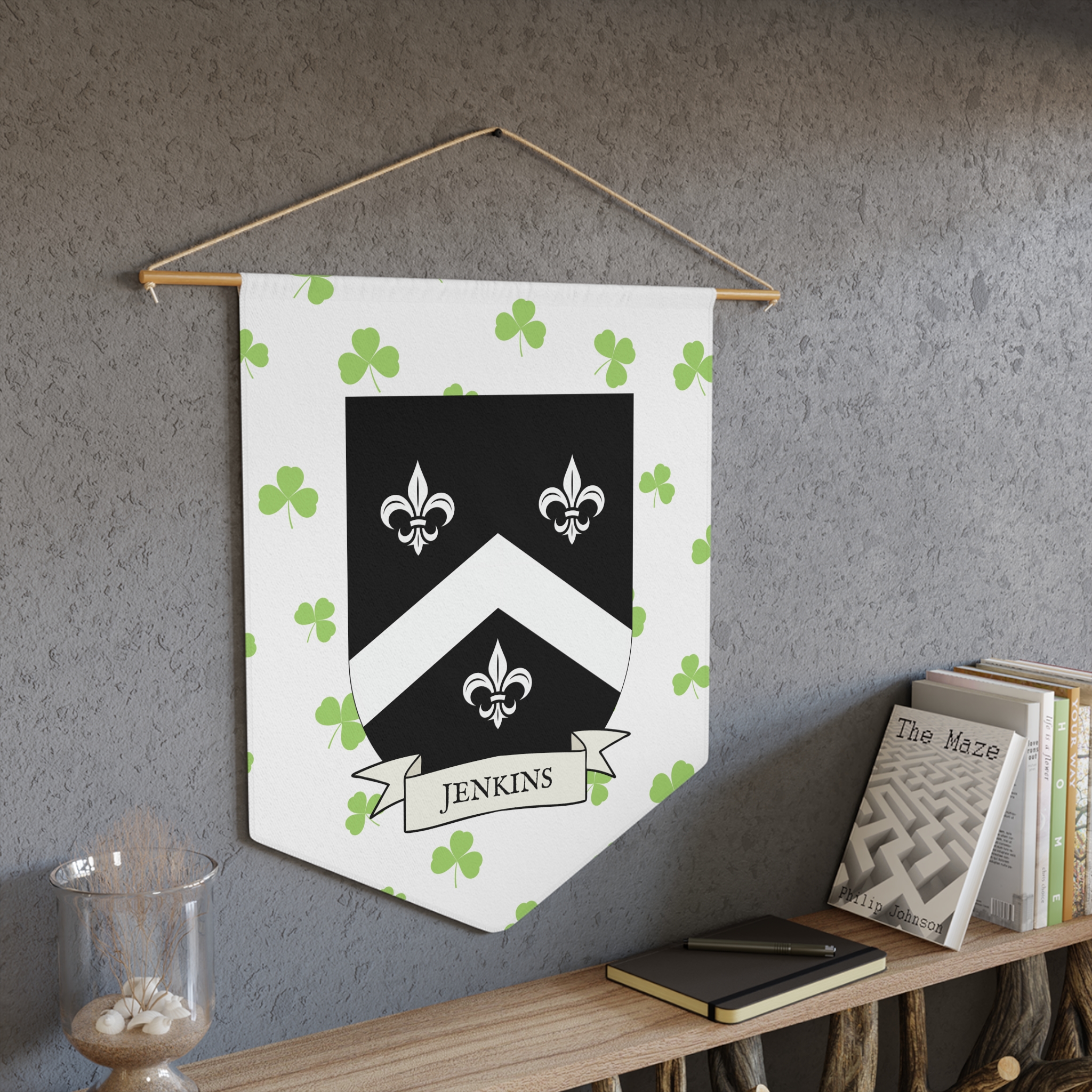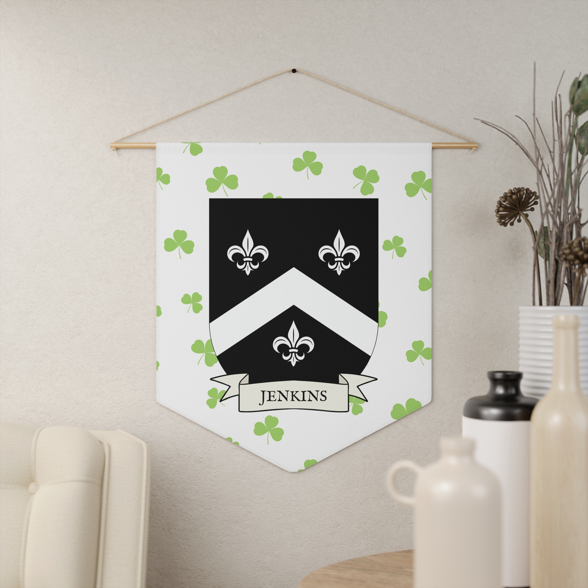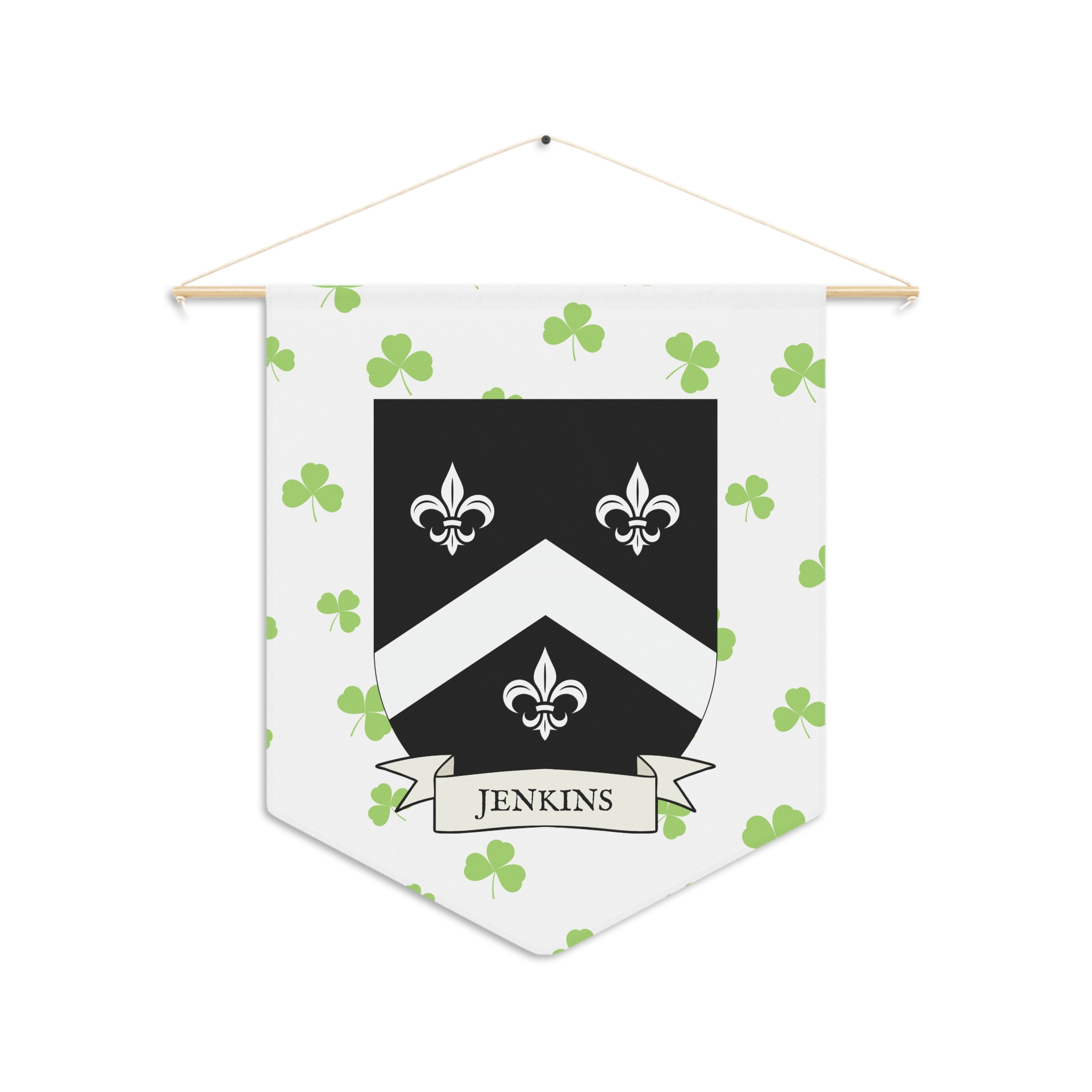 Uplift any room and show off your Irish American roots with this Jenkins Family Coat of Arms Indoor Pennant. Pennant is printed on durable poly twill and comes with a wooden dowel/twine frame for easy hanging. Features your family Coat of Arms printed over a restrained shamrock patterned background.