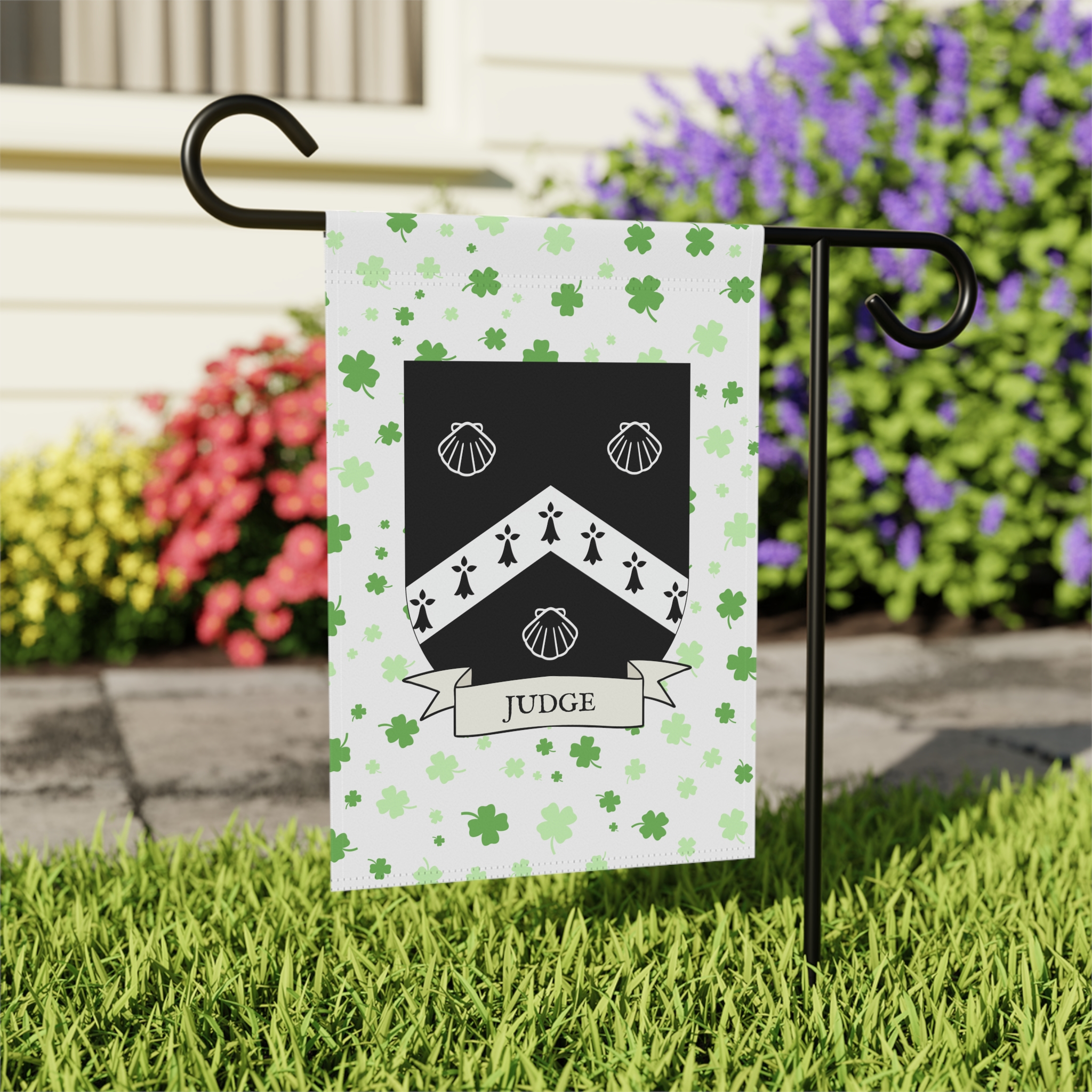 This welcoming Garden Banner will be a great addition to your garden or yard. It displays the Judge Family Coat of Arms over a subtle background showing a field of four-leaf shamrocks. Both sides show identical images.