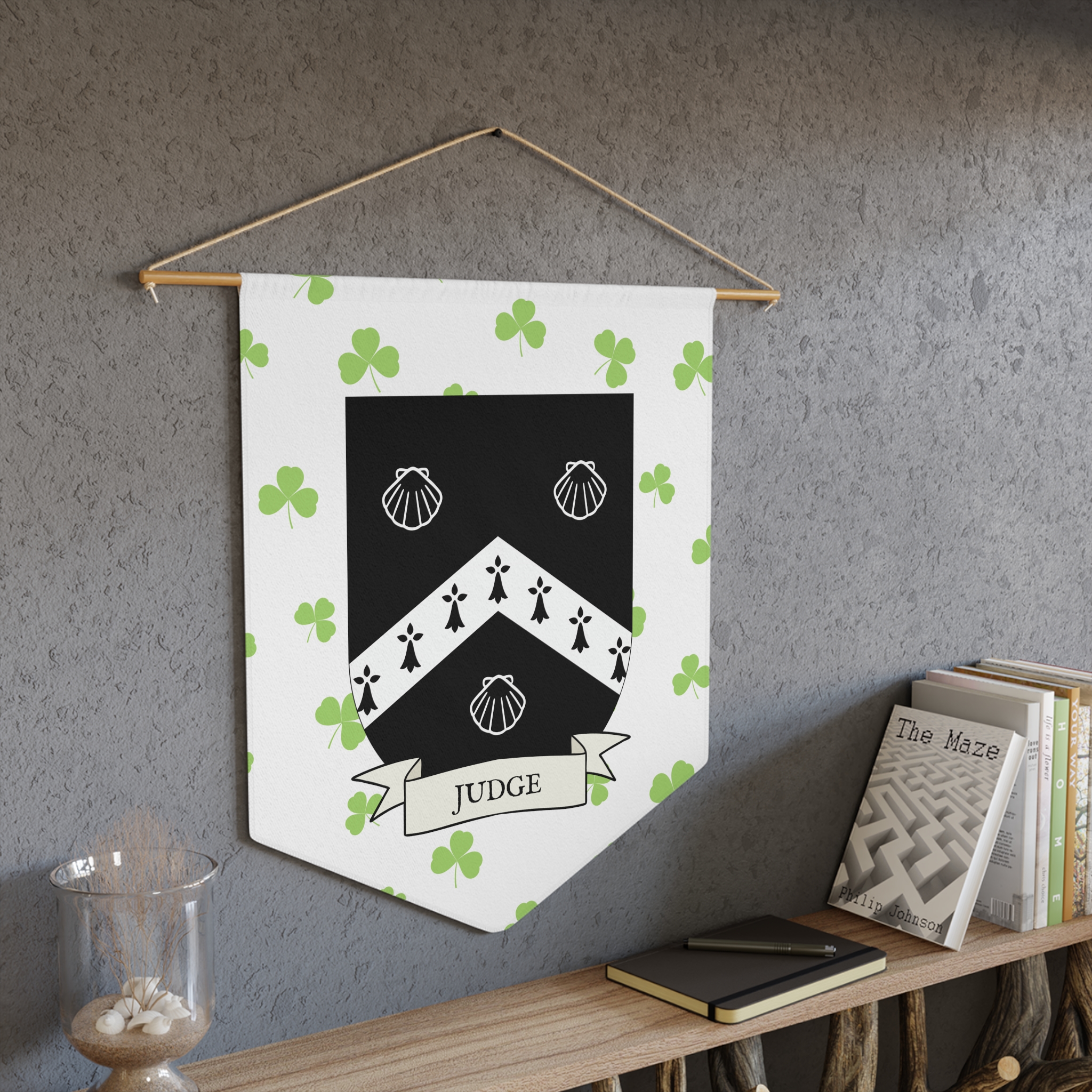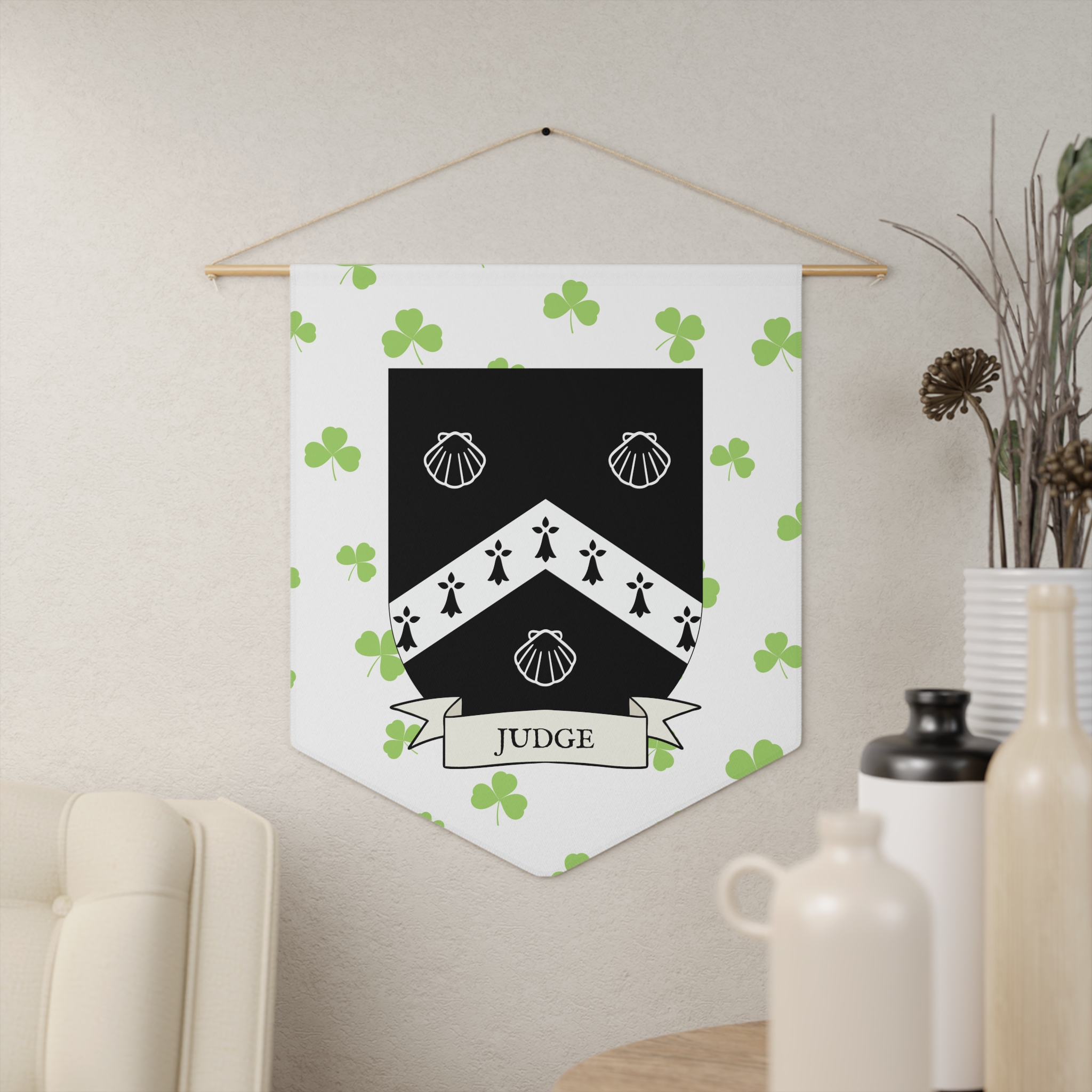 Uplift any room and show off your Irish American roots with this Judge Family Coat of Arms Indoor Pennant. Pennant is printed on durable poly twill and comes with a wooden dowel/twine frame for easy hanging. Features your family Coat of Arms printed over a restrained shamrock patterned background.