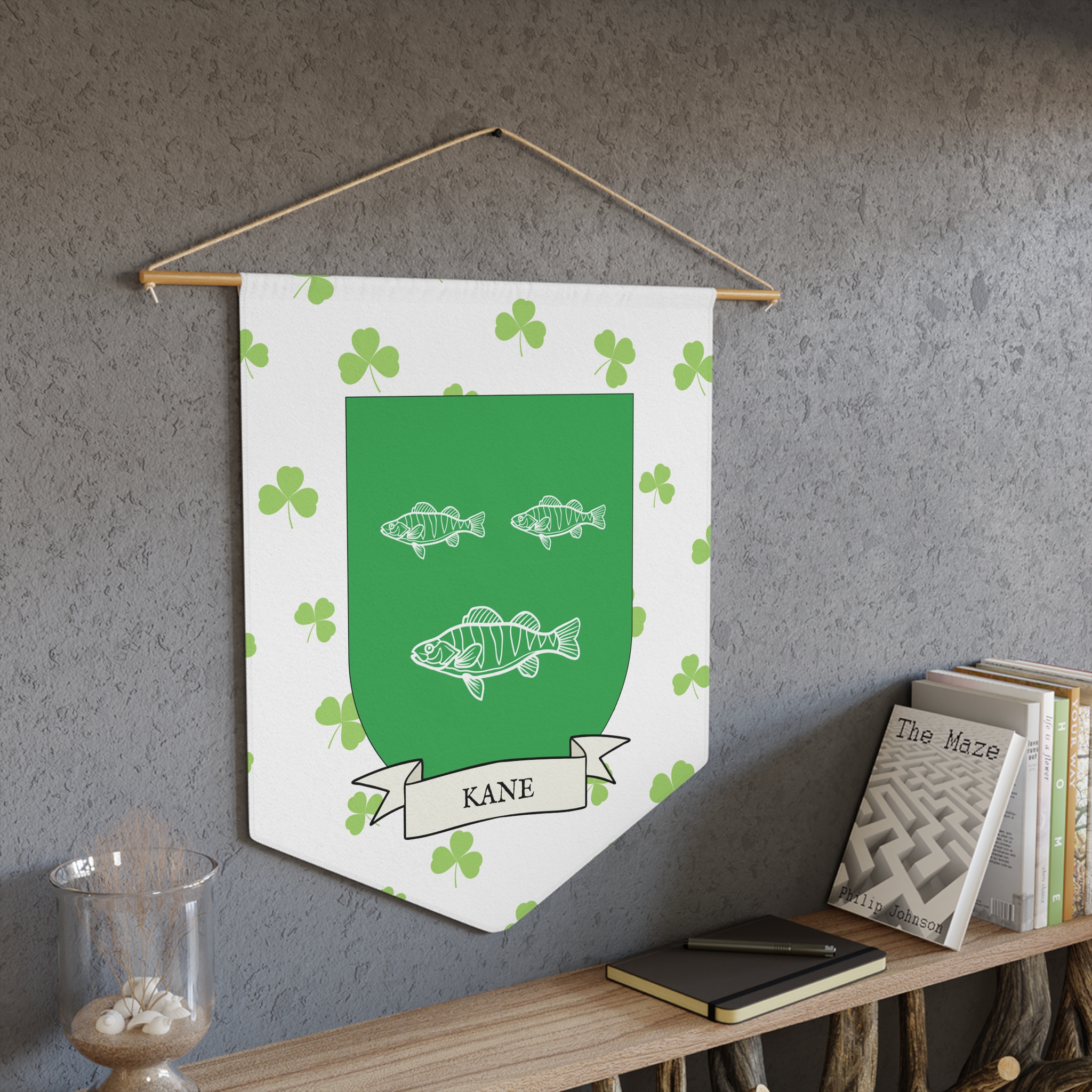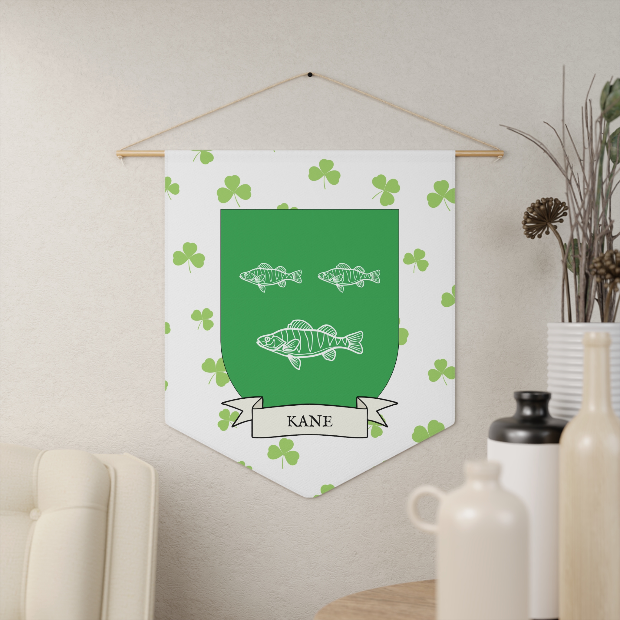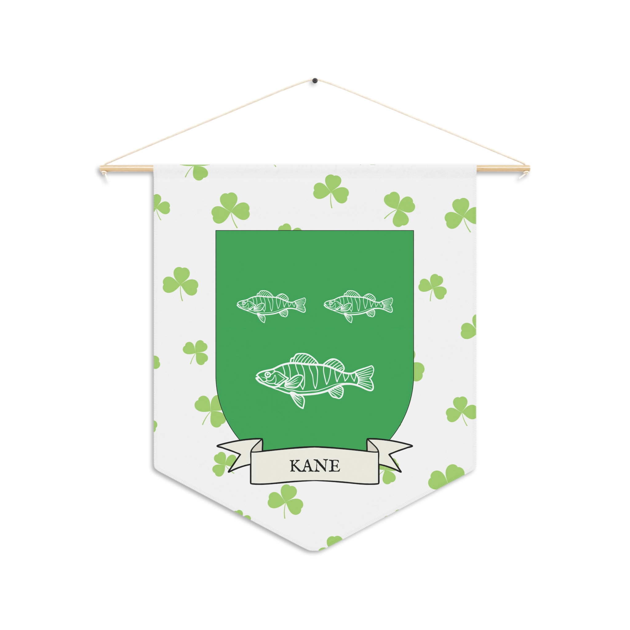 Uplift any room and show off your Irish American roots with this Kane Family Coat of Arms Indoor Pennant. Pennant is printed on durable poly twill and comes with a wooden dowel/twine frame for easy hanging. Features your family Coat of Arms printed over a restrained shamrock patterned background.