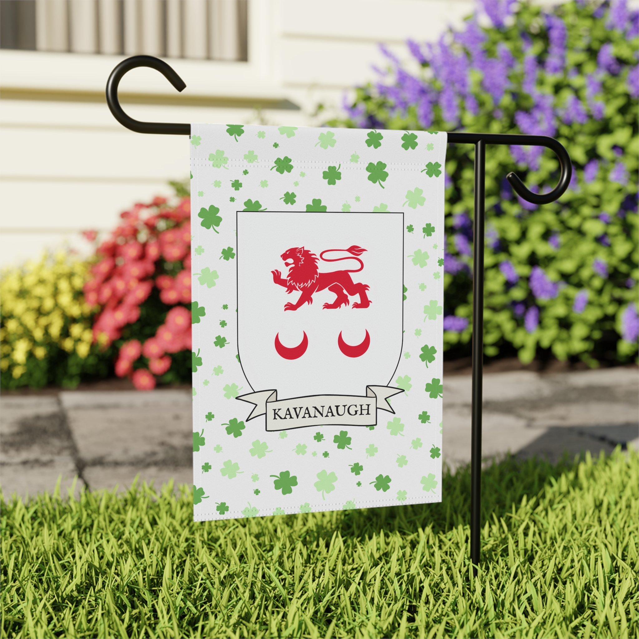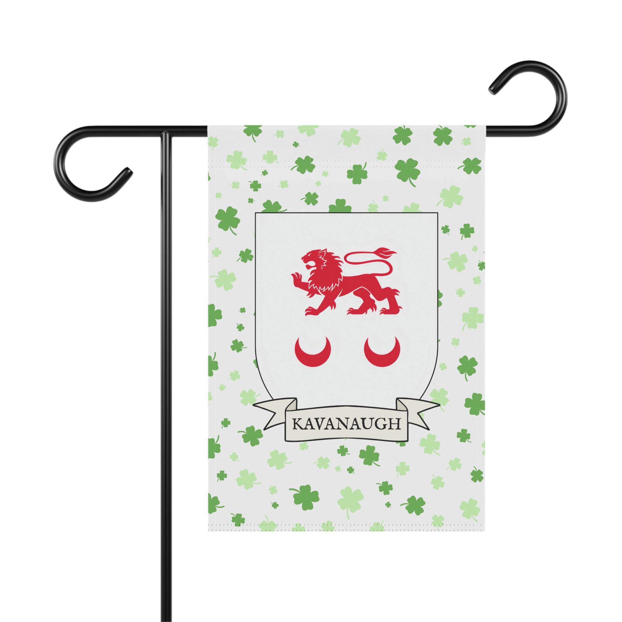 This welcoming Garden Banner will be a great addition to your garden or yard. It displays the Kavanaugh Family Coat of Arms over a subtle background showing a field of four-leaf shamrocks. Both sides show identical images.