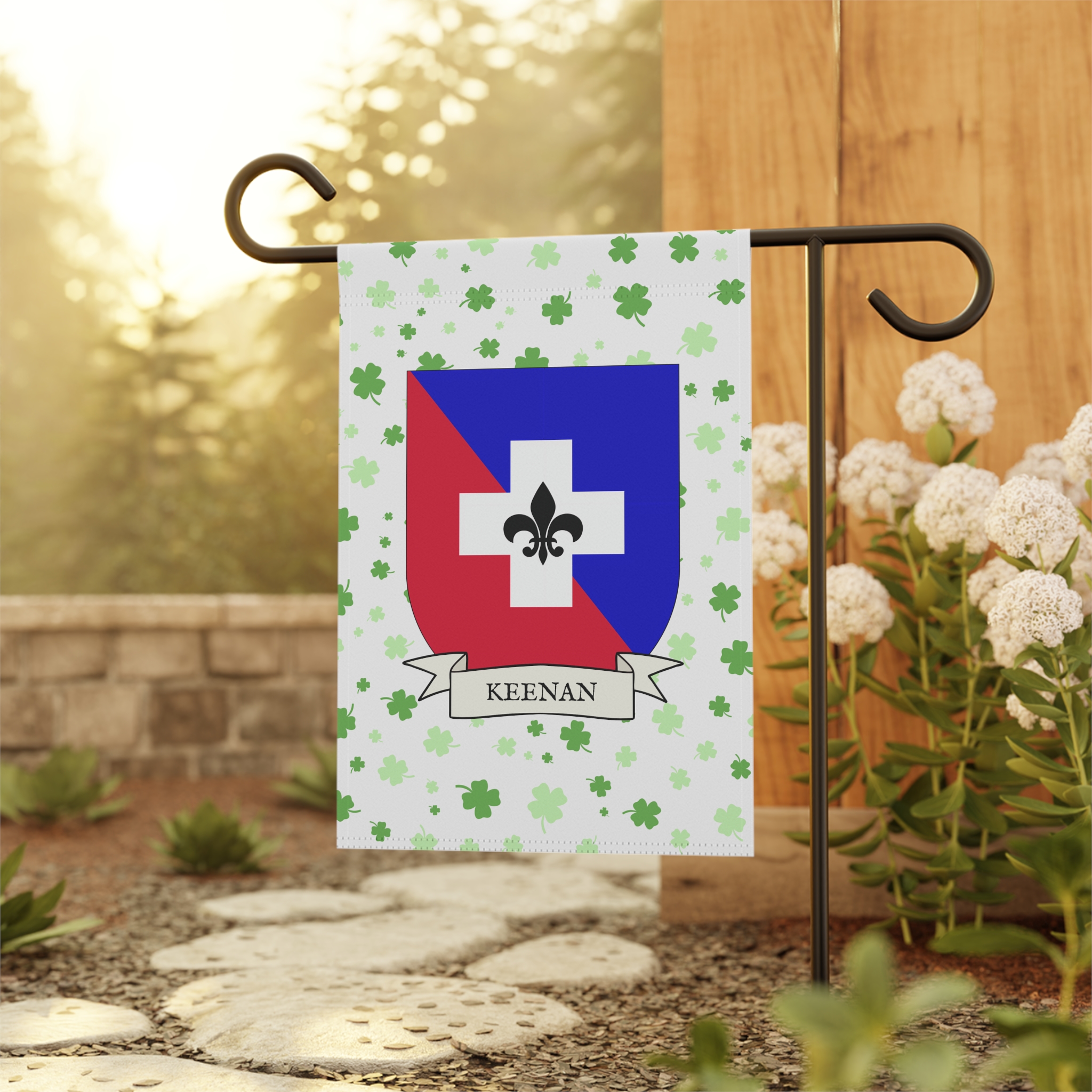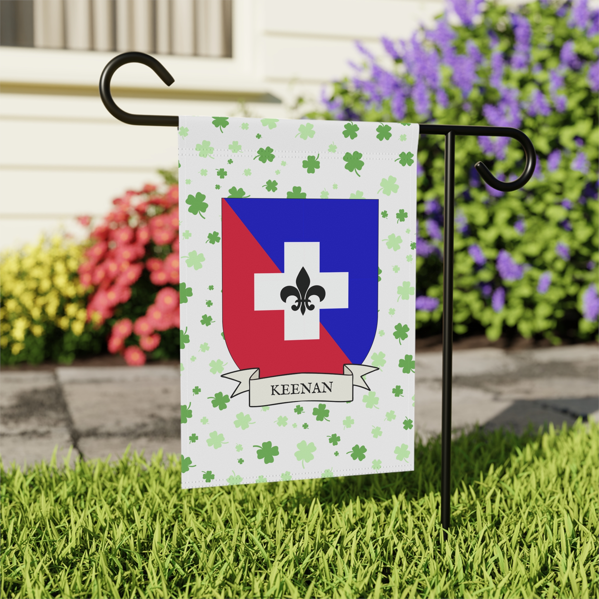 This welcoming Garden Banner will be a great addition to your garden or yard. It displays the Keenan Family Coat of Arms over a subtle background showing a field of four-leaf shamrocks. Both sides show identical images.