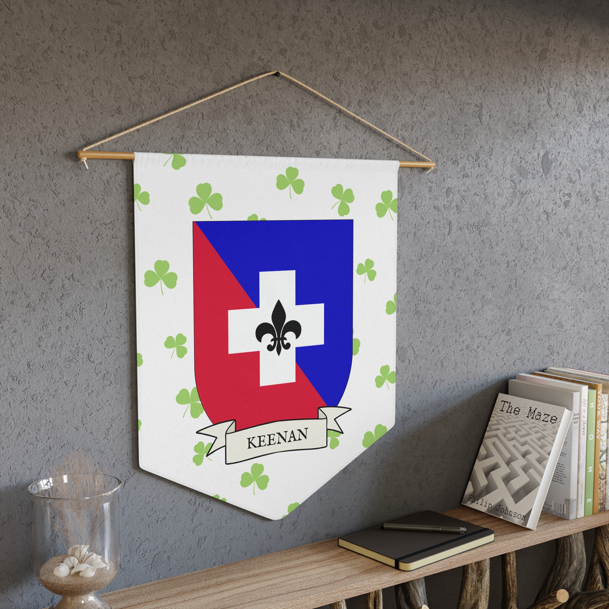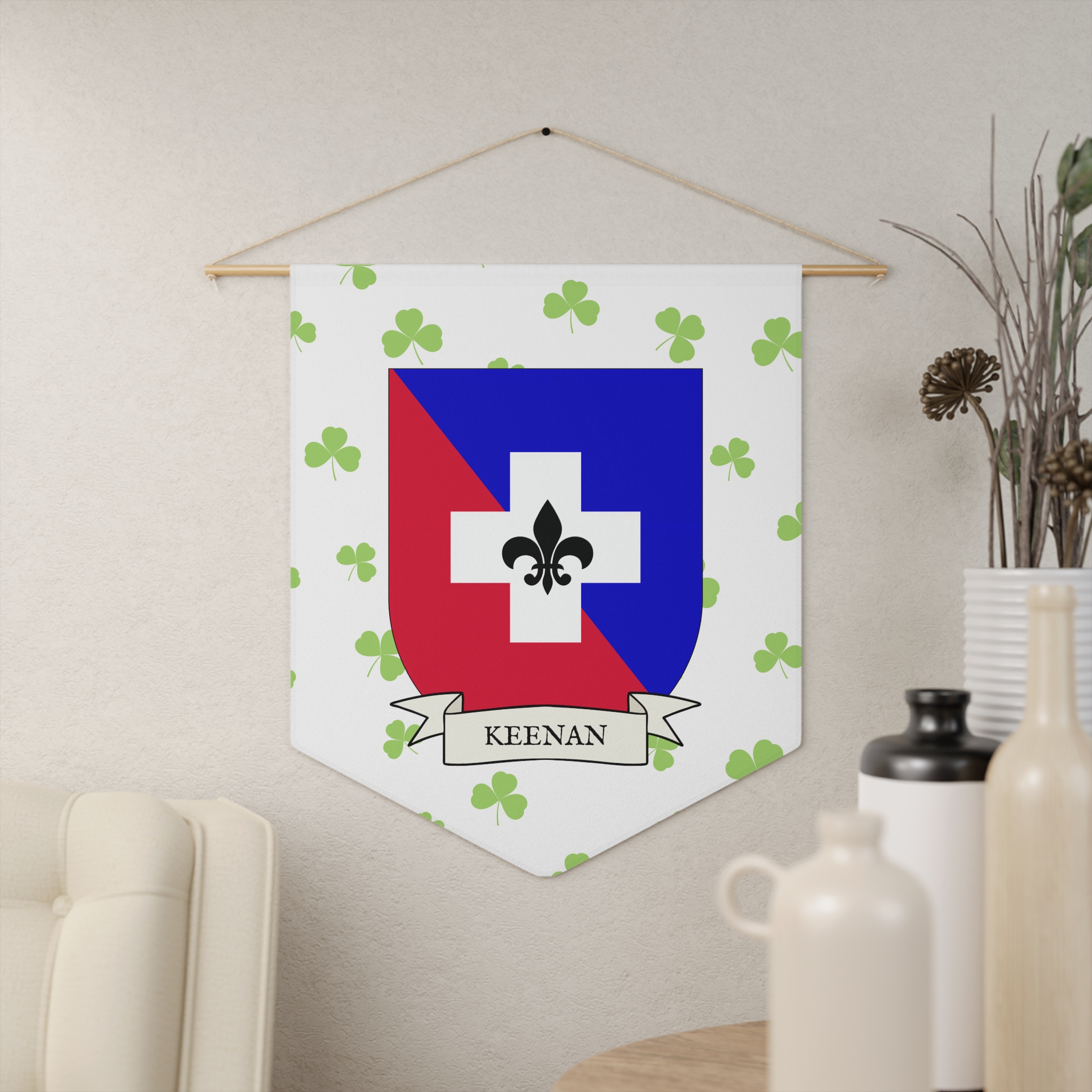 Uplift any room and show off your Irish American roots with this Keenan Family Coat of Arms Indoor Pennant. Pennant is printed on durable poly twill and comes with a wooden dowel/twine frame for easy hanging. Features your family Coat of Arms printed over a restrained shamrock patterned background.