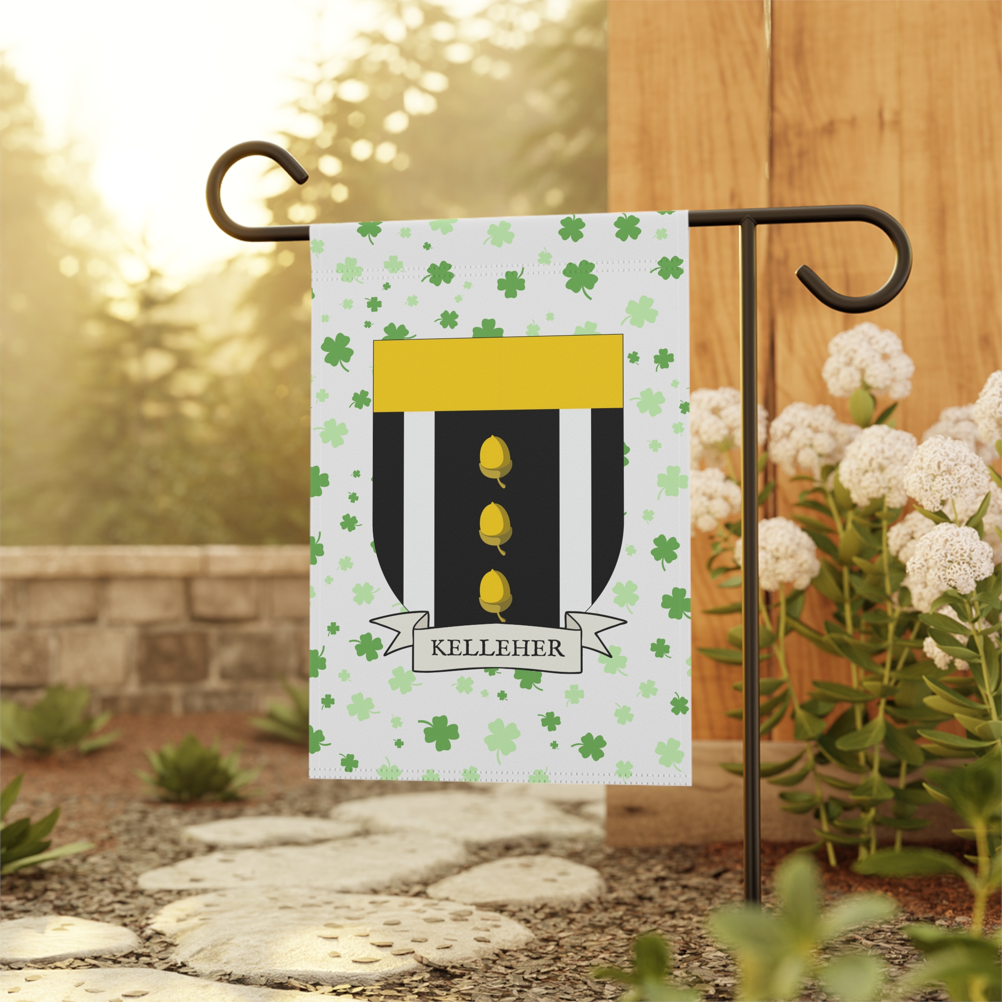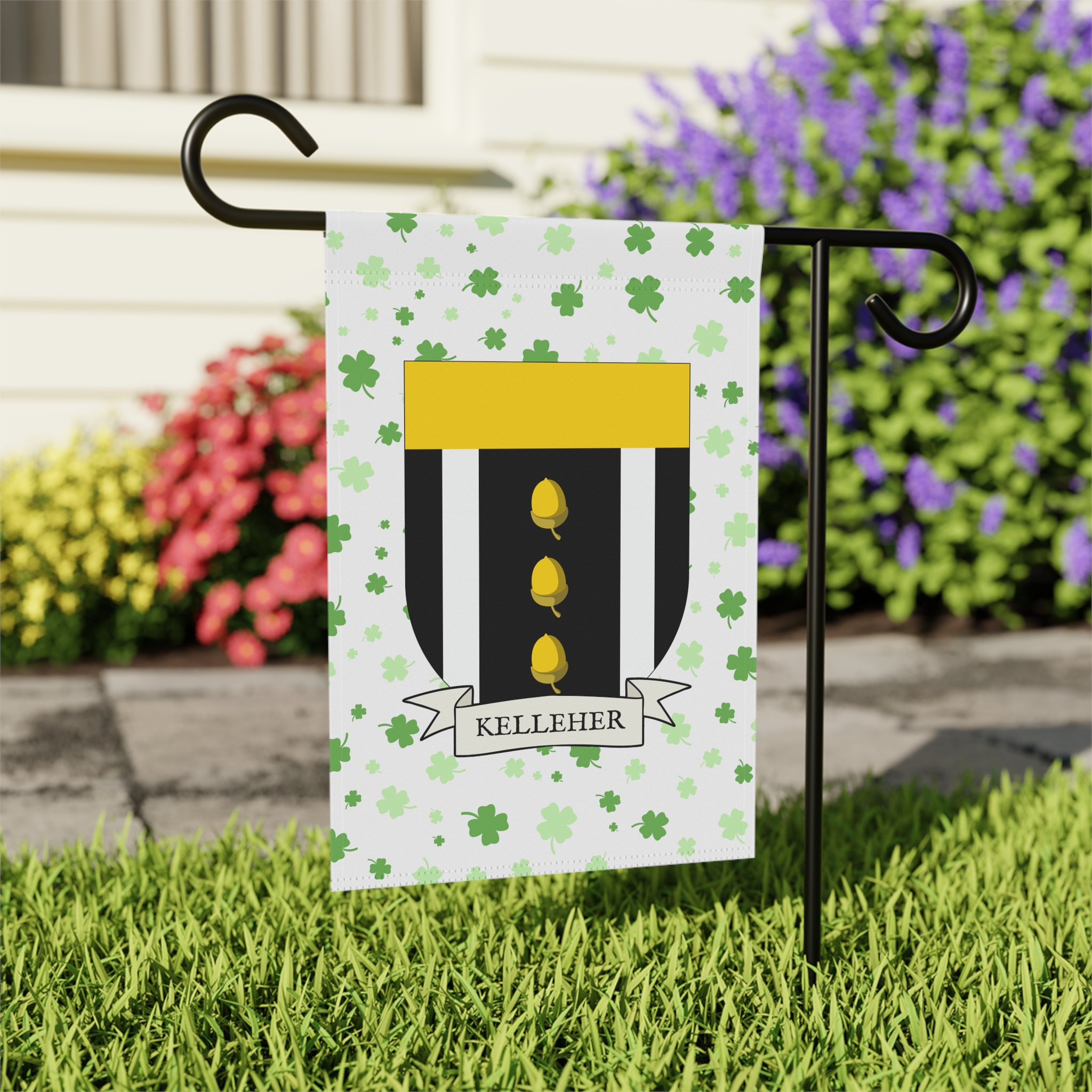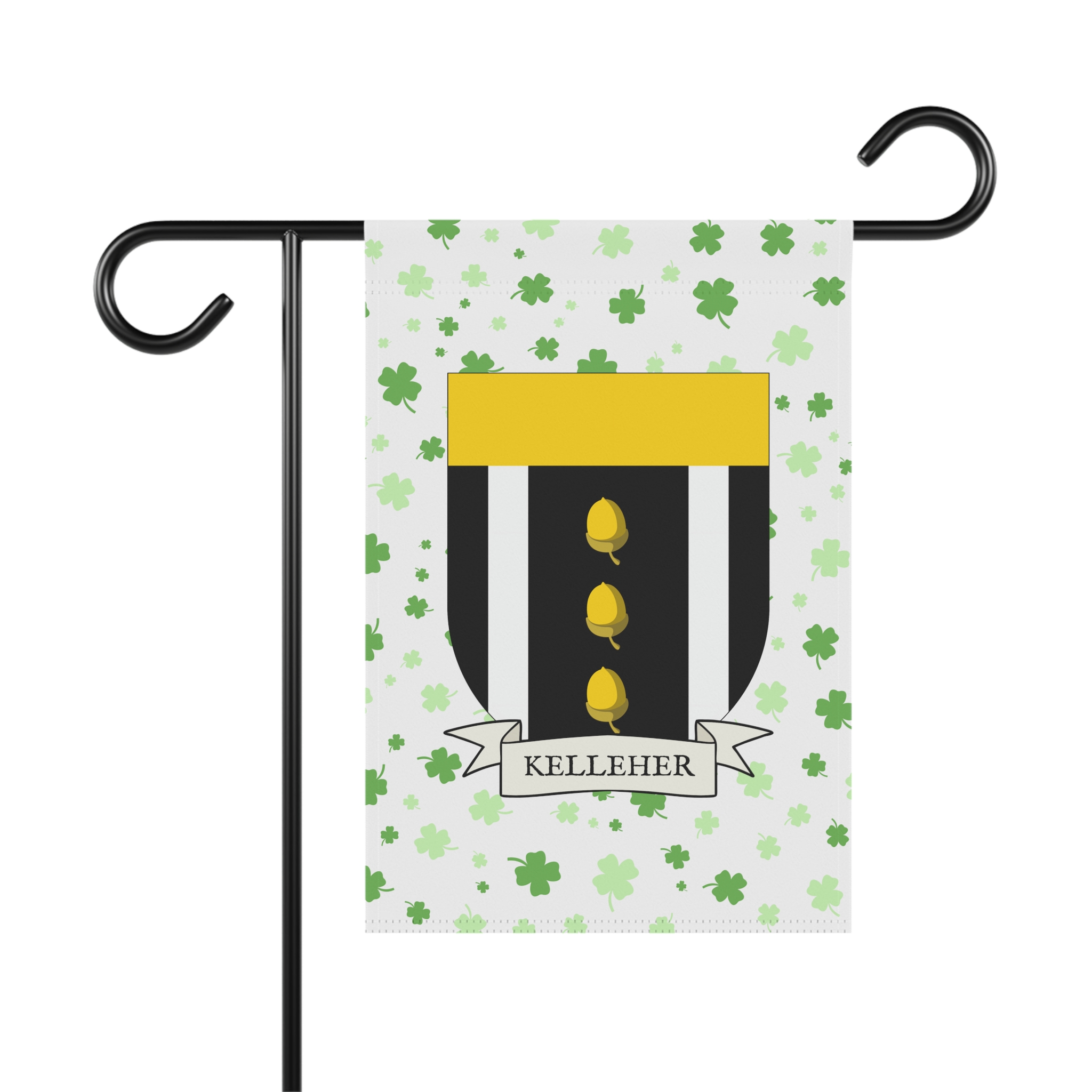 This welcoming Garden Banner will be a great addition to your garden or yard. It displays the Kelleher Family Coat of Arms over a subtle background showing a field of four-leaf shamrocks. Both sides show identical images.