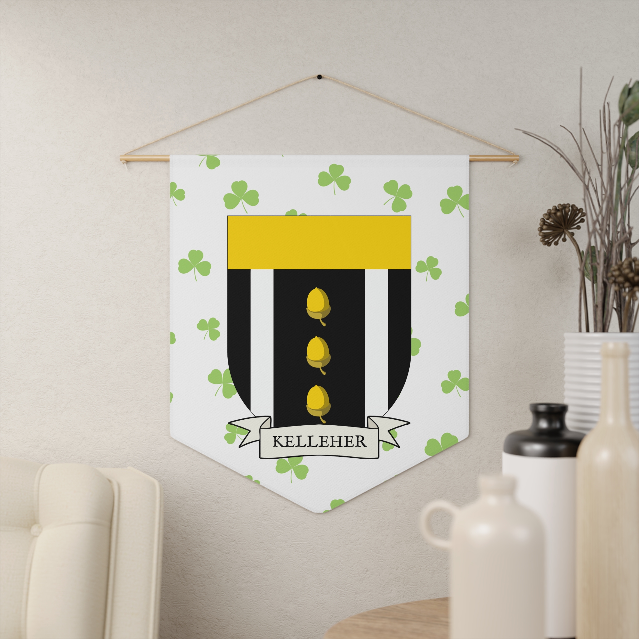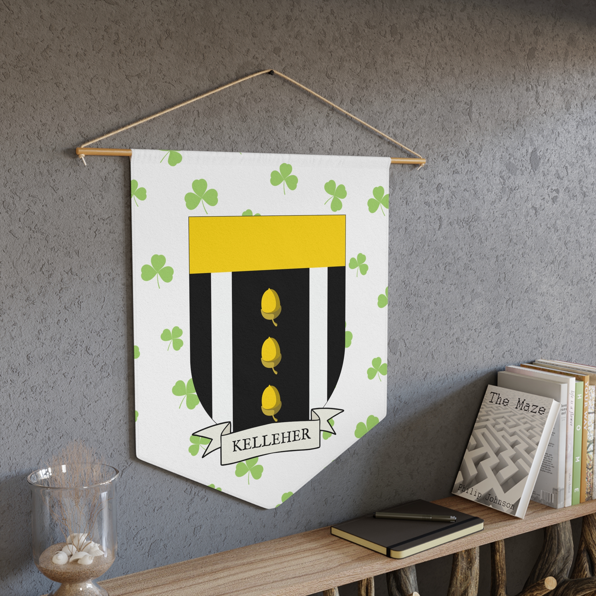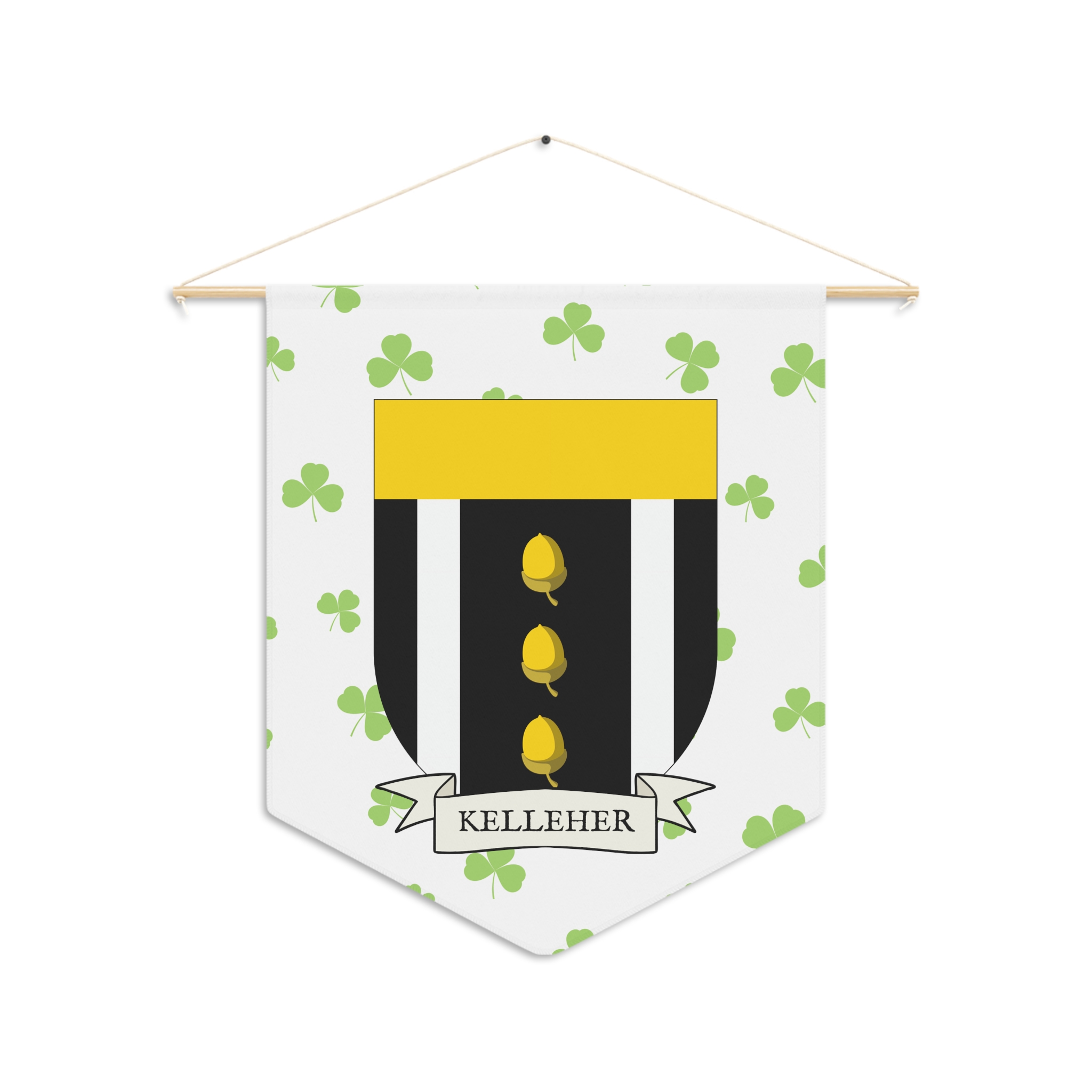 Uplift any room and show off your Irish American roots with this Kelleher Family Coat of Arms Indoor Pennant. Pennant is printed on durable poly twill and comes with a wooden dowel/twine frame for easy hanging. Features your family Coat of Arms printed over a restrained shamrock patterned background.