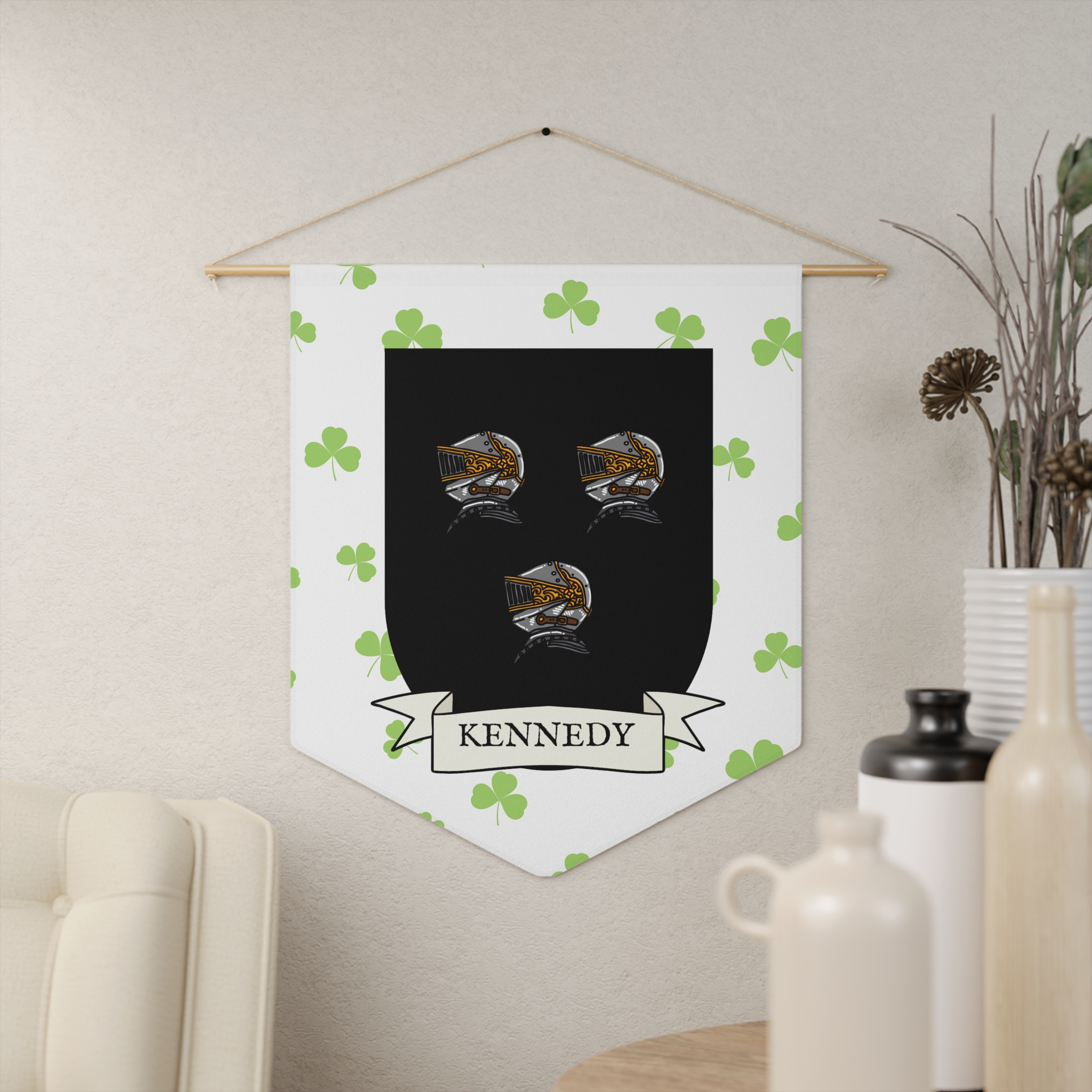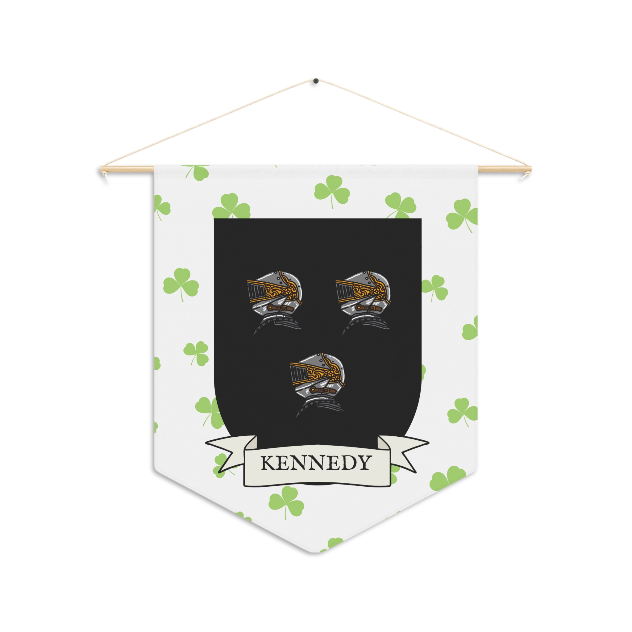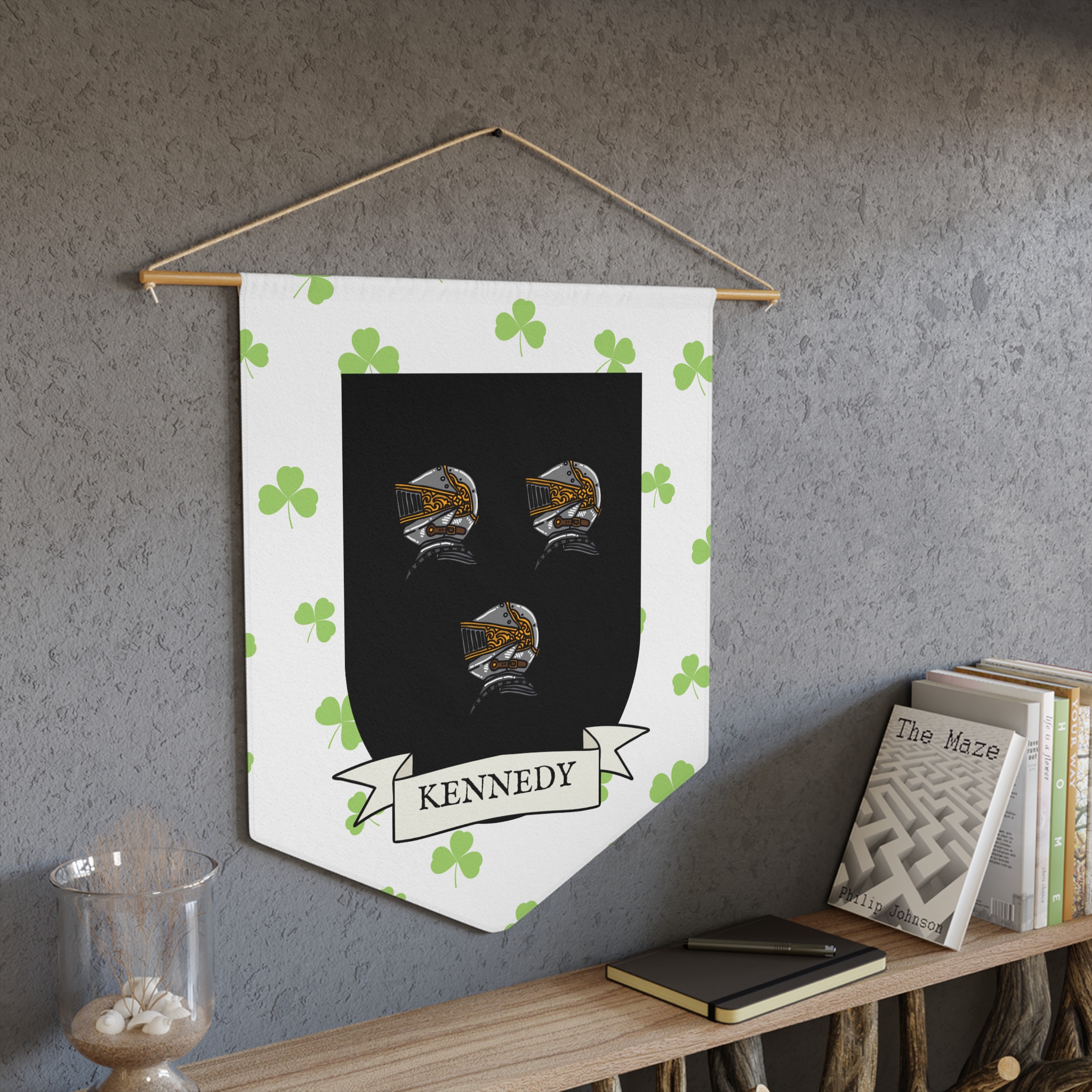 Uplift any room and show off your Irish American roots with this Kennedy Family Coat of Arms Indoor Pennant. Pennant is printed on durable poly twill and comes with a wooden dowel/twine frame for easy hanging. Features your family Coat of Arms printed over a restrained shamrock patterned background.
